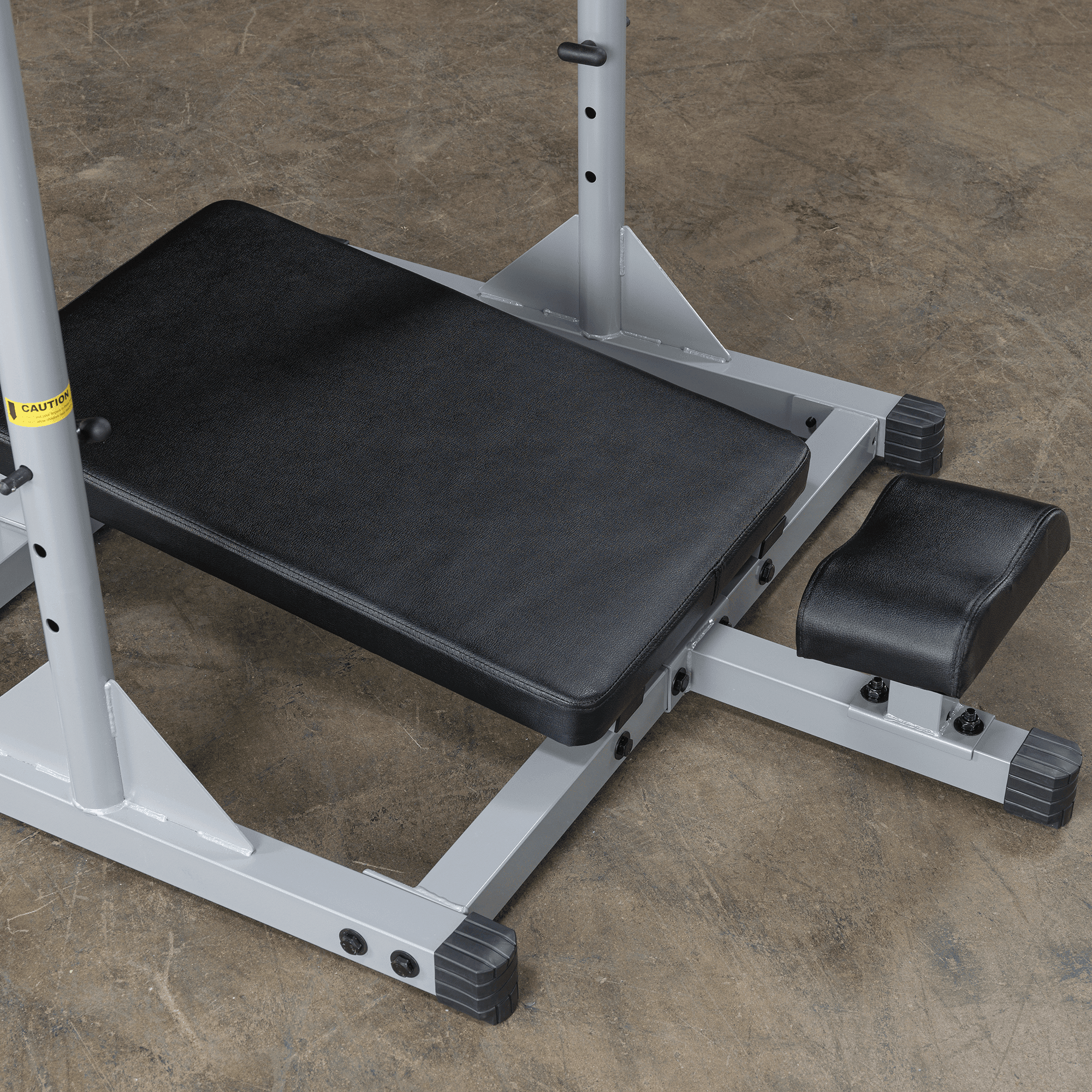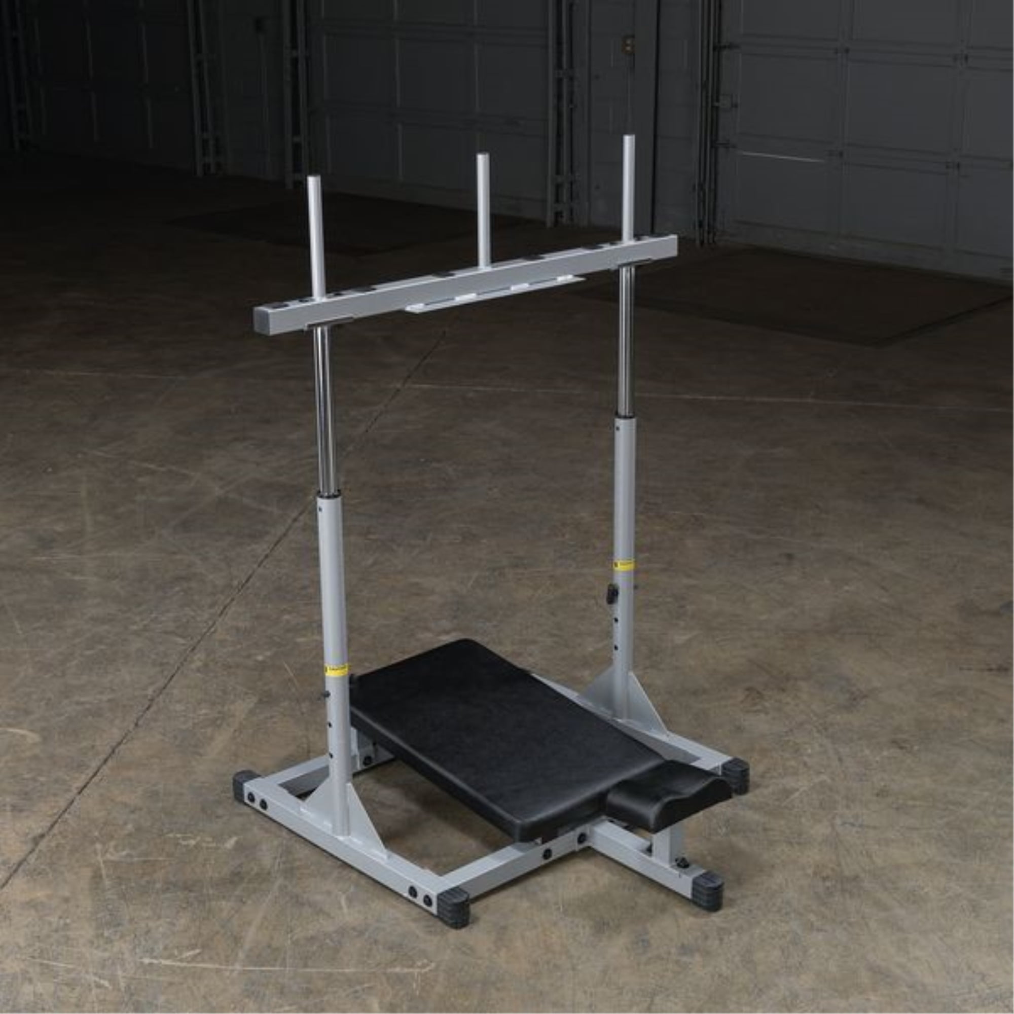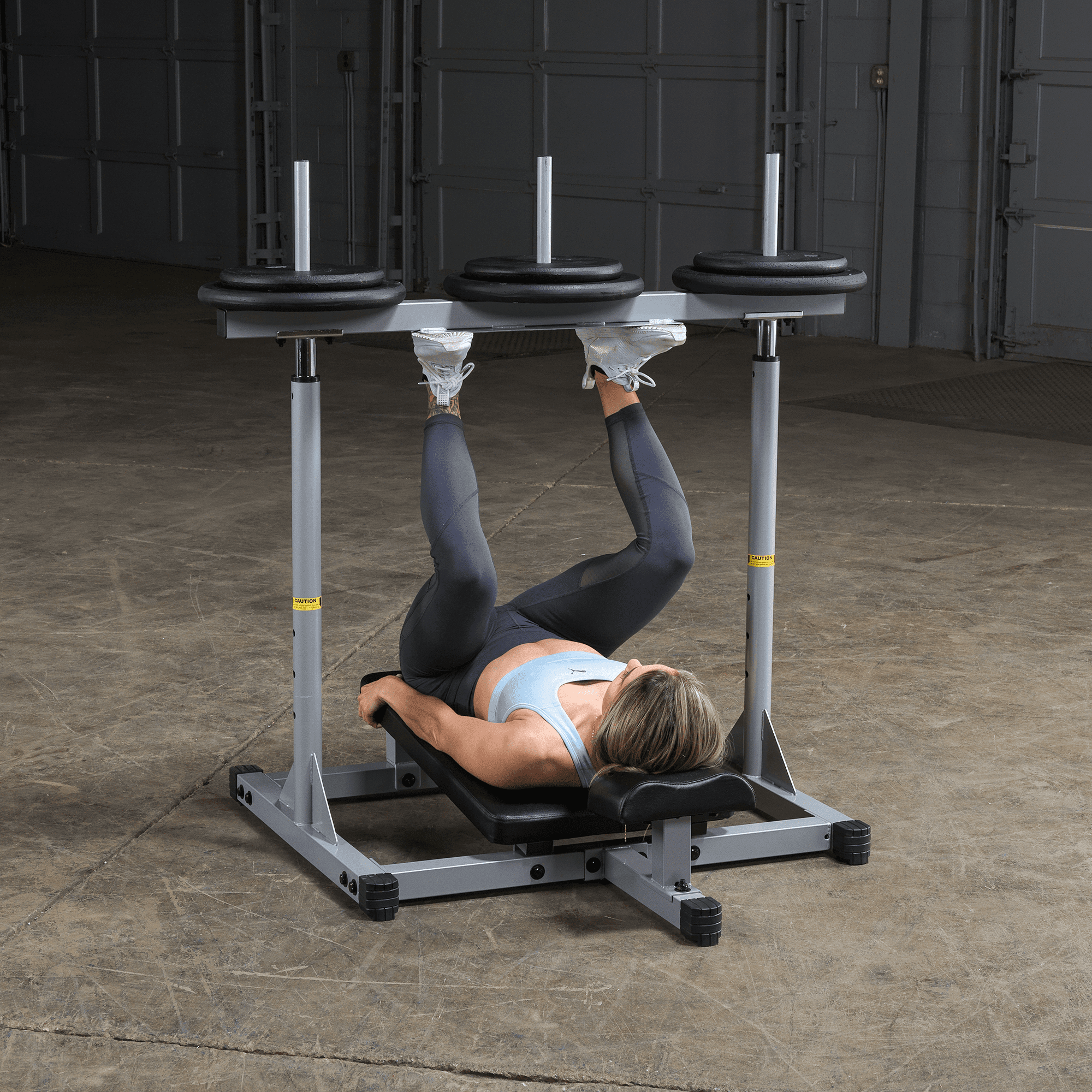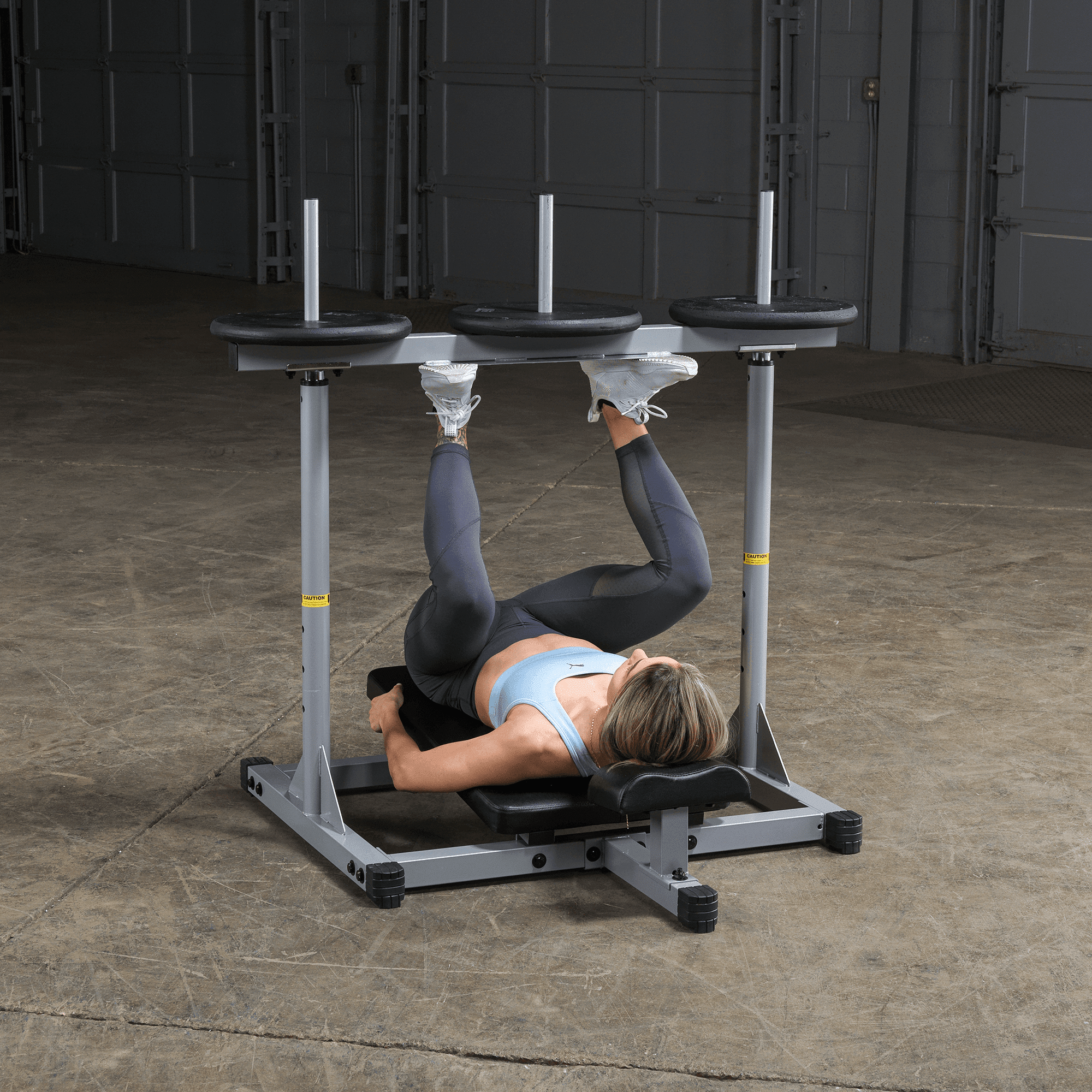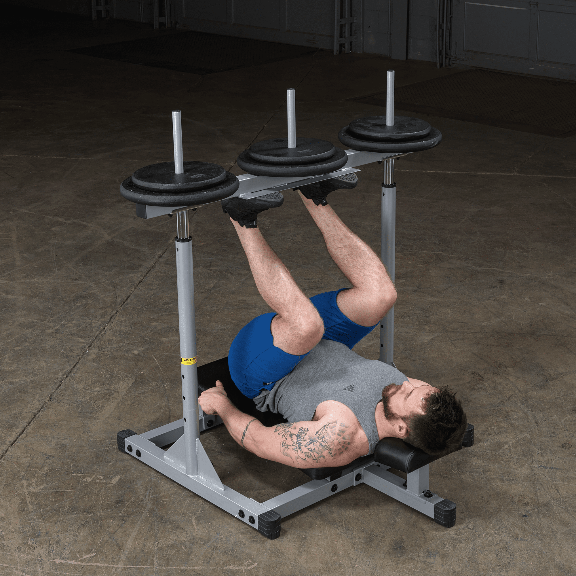 Weight plate posts are 1″ dia. Shown with optional Olympic Adapter Sleeves. Olympic Adapter Sleeves, weight plates and collars optional Three 1″ dia. weight posts for even resistance distribution (Standard sized weight plates) Nylon bushings for smooth, consistent motion Electrostatically applied powder coat finish Extra-wide foot plate with no-slip design Thick back and neck pads for comfort and support Assembled Dimensions: 54″ to 61″H x 46″L x 48″W Olympic Sleeve Adapters pictured with Olympic plates in exercise pictures