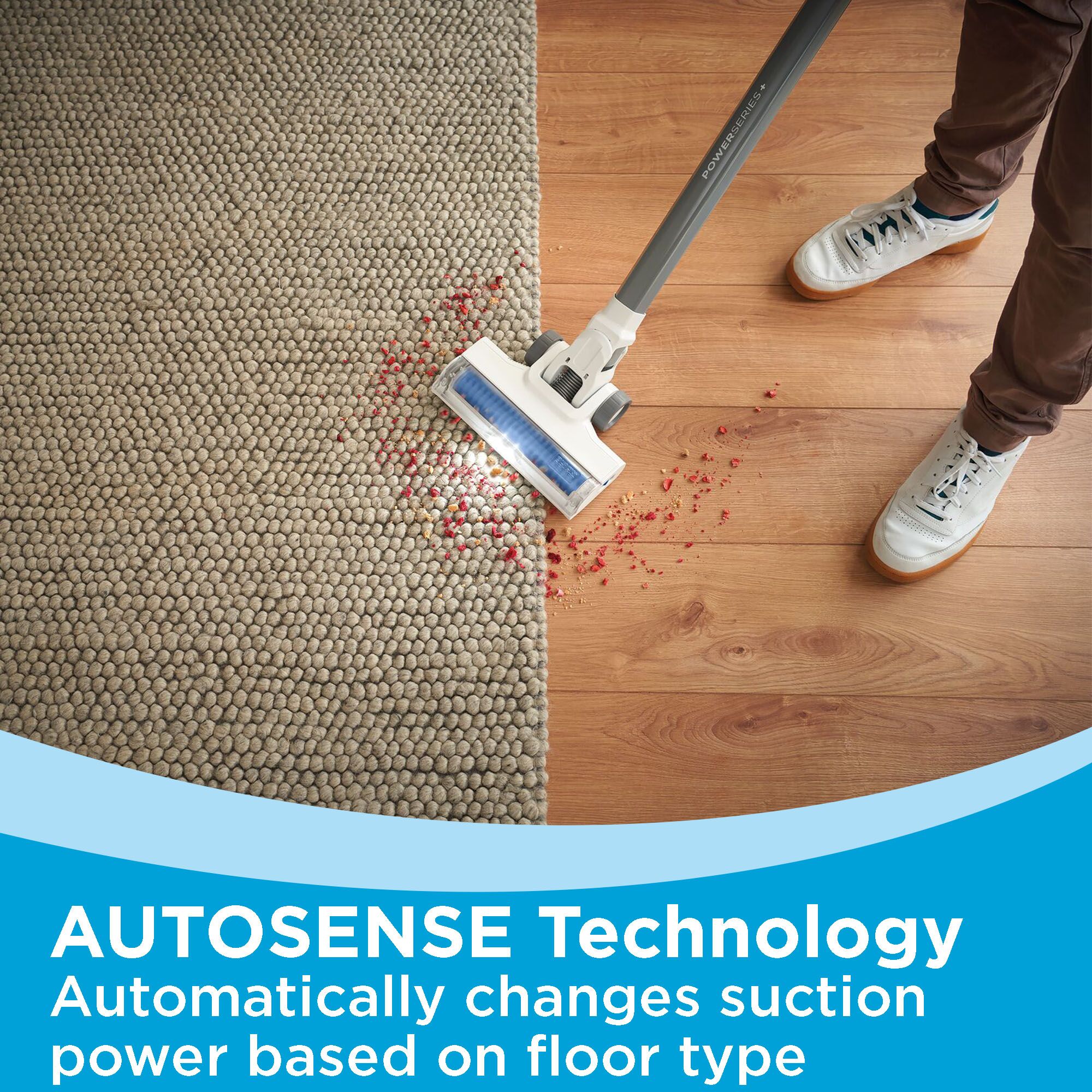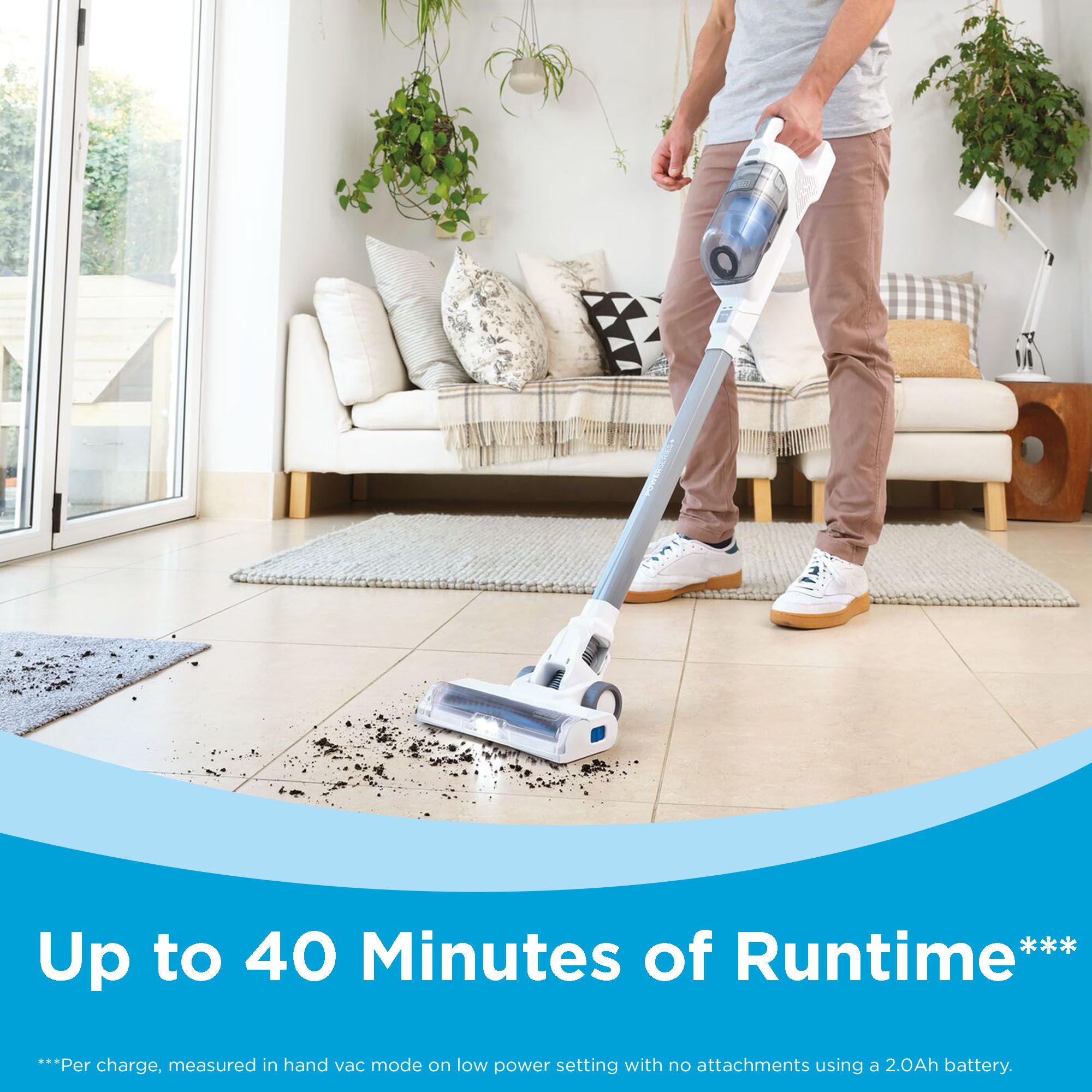 Clean up the big messes and keep your home tidy with the POWERSERIES+â„¢ 16V MAX* Cordless Stick Vacuum. Made for large spills, you can do more cleaning with up to 25% more pickup on carpet* and up to 44 minutes of runtime. Depending on the type of floor, the high-tech POWERSERIES+â„¢ vacuum automatically adapts its suction power with AUTOSENSEâ„¢ technology while its cyclonic filtration system helps to keep the filter clean for pro-level performance. Hair, fur, and debris are typically hard to pick up, but the anti-tangle brush bar and integrated LED floorhead lights make vacuuming easy. Use the crevice tool and quickly transform it into a handheld vacuum to clean stairs and furniture, lie it flat to vacuum clean under beds and couches, and store when all work is done with this vacuum’s convenient, self-standing capability.