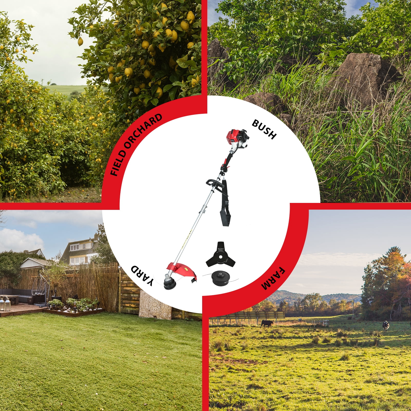POWERFUL ENGINE: This 2-cycle gas power weed eater is perfect for stricter trimming jobs. It provides more power so you can easily take care of overgrowth. It’s also great for trimming around borders, sidewalks, and flower beds. 2-IN-1 TRIMMER/CUTTER: This gas weed wacker can quickly convert from a 10″ brush cutter Blade to a 0.095″ trimmer line head. The trimmer line head is used for lawn grass and small bushes, and the blade is designed for dense grass and heavy bushes. The two-in-one string trimmer is ideal for trimming around yards and lawns. LARGE CUTTING WIDTH: The 16-inch cutting swatch allows you to trim more grass in less time, and the straight shaft design makes it easier to trim under bushes and other hard-to-reach spots. SAFETY USAGE: The easy-to-remove baffle on this 2-cycle weed eater prevents debris from splashing and keeps you safe while it operates. The string trimmer head is designed for easy line reloading. You don’t need to worry about replacing the trimmer line. The cordless design makes it safer and more convenient to use. ERGONOMIC DESIGN: This gas weed trimmer is designed for enhanced comfort and ease of use. Its adjustable auxiliary handle makes it easier to control, and the straight shaft handlebar design minimizes operator fatigue and provides greater control, resulting in a more comfortable experience. EASY TO STORE: The telescoping shaft is easy to disassemble and store; most parts are detachable and easy to assemble, so this weed eater doesn’t take up much storage space.