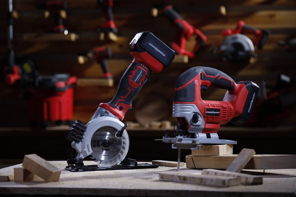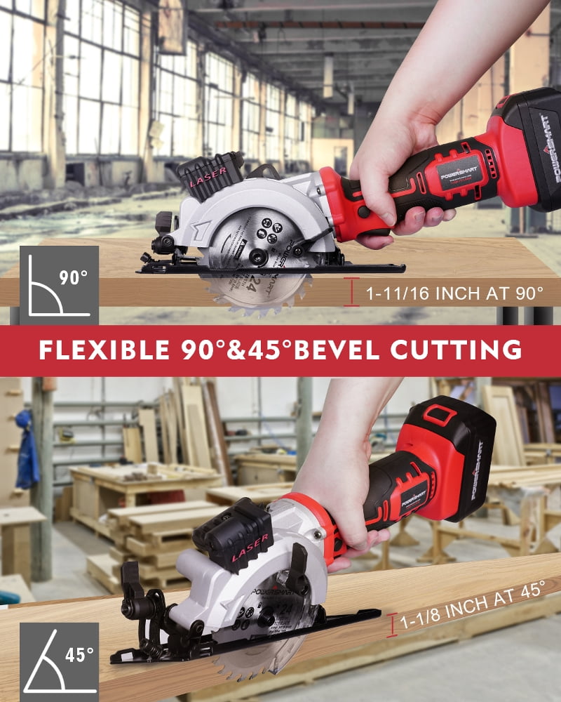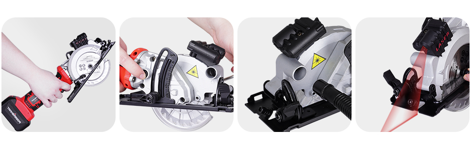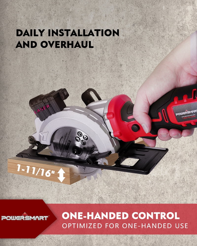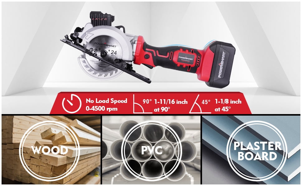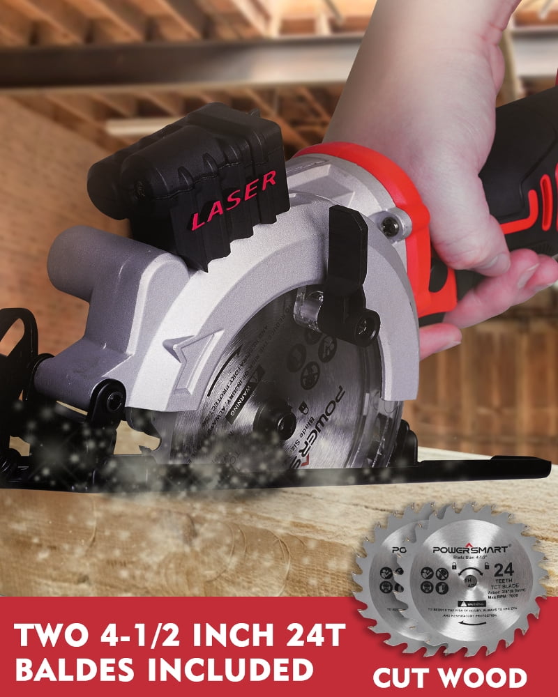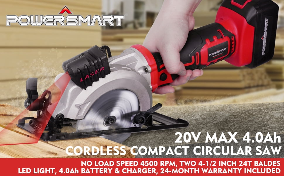 POWERSMART cordless circular saw with two 24 Teeth Blades, size 4-1/2 inch, no load speed up to 4,500 RPM for multi-purpose cuts of wood, soft metal, tile, drywall, plastic and more without hassles. Powerful battery circular saw substantial enough to cut through nominal 2 inch lumber and no cord limited for excellent maneuverability and portability. Best for working in tight spaces and meet requirements of any outdoor job site. POWERSMART is aiming on providing great customer value with impeccable product line. The 20V MAX 4.0Ah Lithium-Ion battery and charger are included, which only takes 2.5 hours for a full recharge. The larger volume of battery can provide maximum workload which makes it enough for most projects in your job site. The battery can fit all battery-powered products under POWERSMART including trimmers, saws and drills. The double protection switch is completed for preventing the machine from accidentally opening and ensure a safer cutting in the job site. Advanced soft rubber handle designed to comfort your hand for improved control with minimal vibration and one hand operate. Vacuum adaptor allows to hook up with a vacuum, sucking away all sawdust coming from the cutting. The professional, precise and convenient cutting line can be achieved by the laser guide design. The parallel guide enables exact cuts along a setting edge and cutting strips based on the same dimension; The 9.5” extended metal base plate improves the stability of performance during cutting process and avoids curved cuts by accident.