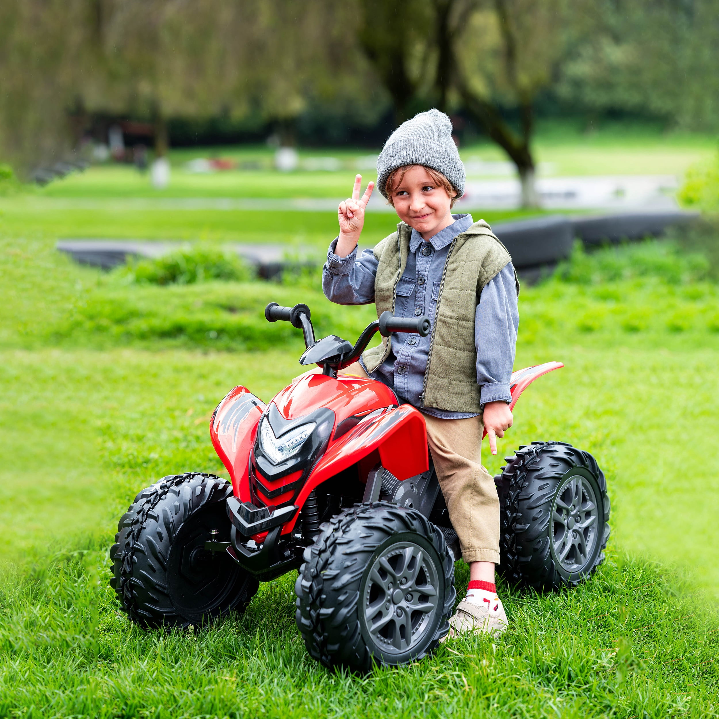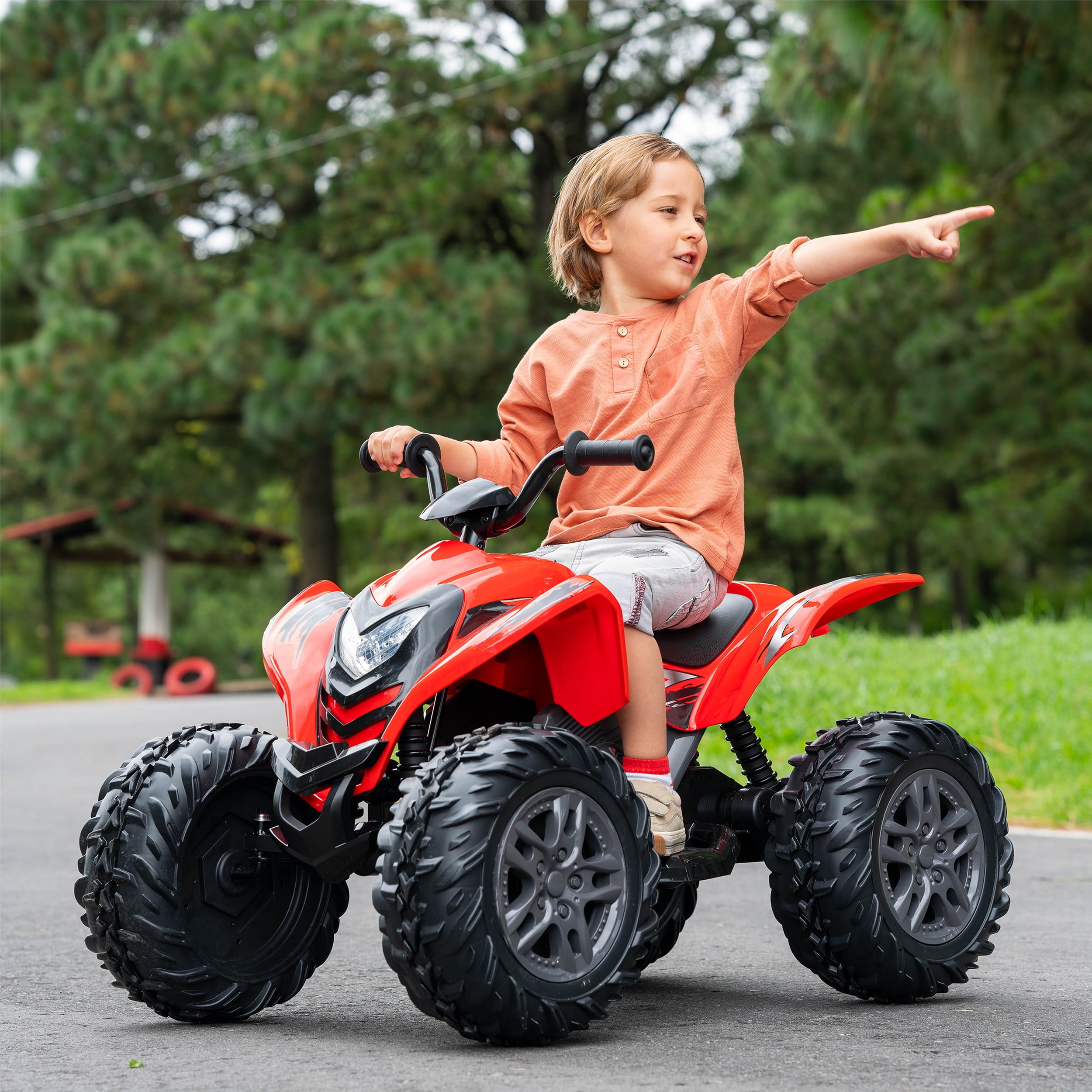 MEET YOUR CHILD’S FIRST QUAD: Suitable for hard surfaces and grass, this ride-on mimics the real deal, right down to the authentic sounds, working headlights, foot pedal start and oversized wheels with rubber tire strips for added traction and smooth acceleration ZOOM!: Reaches 3 mph in forward and 2.5 mph in reverse for a thrilling ride HAVE FUN, THEN RECHARGE: Includes a 12V rechargeable battery that provides up to 2 hours of run time ENJOY YEARS OF PLAY: Keep the fun rolling for years, as this ride-on is suitable for children 3 years of age and older, weighing up to 77 lb ASSEMBLES WITH EASE: Requires minimal assembly before use RIDE WITH CONFIDENCE: Backed by a limited 1-year warranty (vehicle) and limited 6-month warranty (battery)
