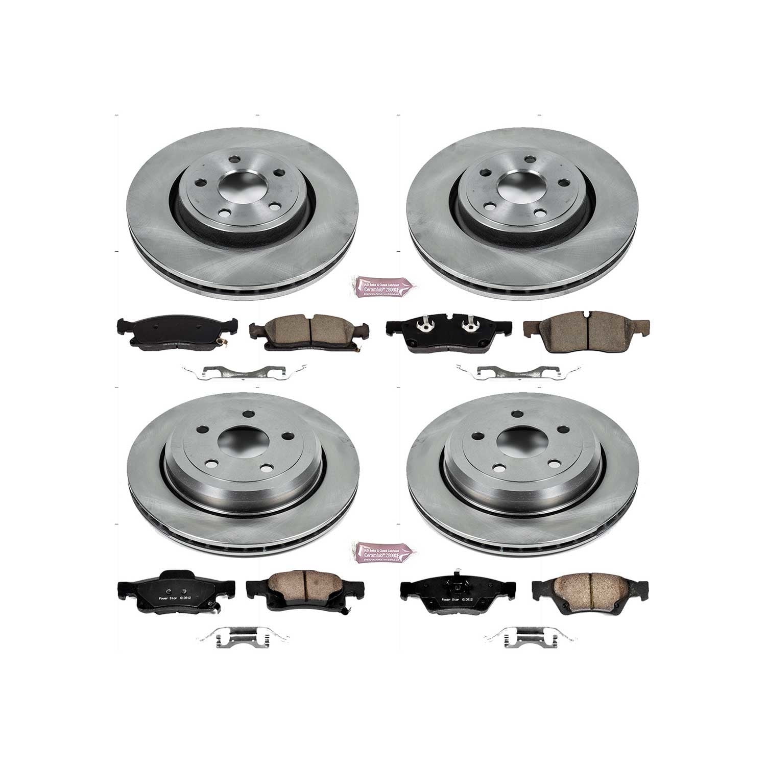 PowerStop Front and Rear Stock Replacement Brake Pad and Rotor Kit Fits: DODGE JEEP Select Models KOE7136 Z17 Evolution Front and Rear Brake Pad and Rotor Kit Includes: 2x Front Stock Replacement Brake Rotors + 2x Rear Stock Replacement Brake Rotors + 1x Front Z17 Ceramic Brake Pad Set with Hardware + 1x Rear Z17 Ceramic Brake Pad Set w/Hardware Z17 Stock Replacement brake kit is recommended for drivers looking to refresh their daily driven vehicle’s stopping power back to OE, stock performance Components within this brake kit are designed to work together to maximize stopping power and long-lasting performance as an OE, stock replacement Z17 Evolution brake pads ceramic formula offers durable, reliable stopping power that out-performs OE and resists brake dust & noise Autospecialty OE Stock Replacement rotors restore the original rotor performance of your vehicle as an easy, bolt-on replacement This complete brake replacement kit comes with everything you need and is ready for quick, easy bolt-on installation with no modifications necessary Brake Kit has a 24 Month / 24,000 Miles Warranty