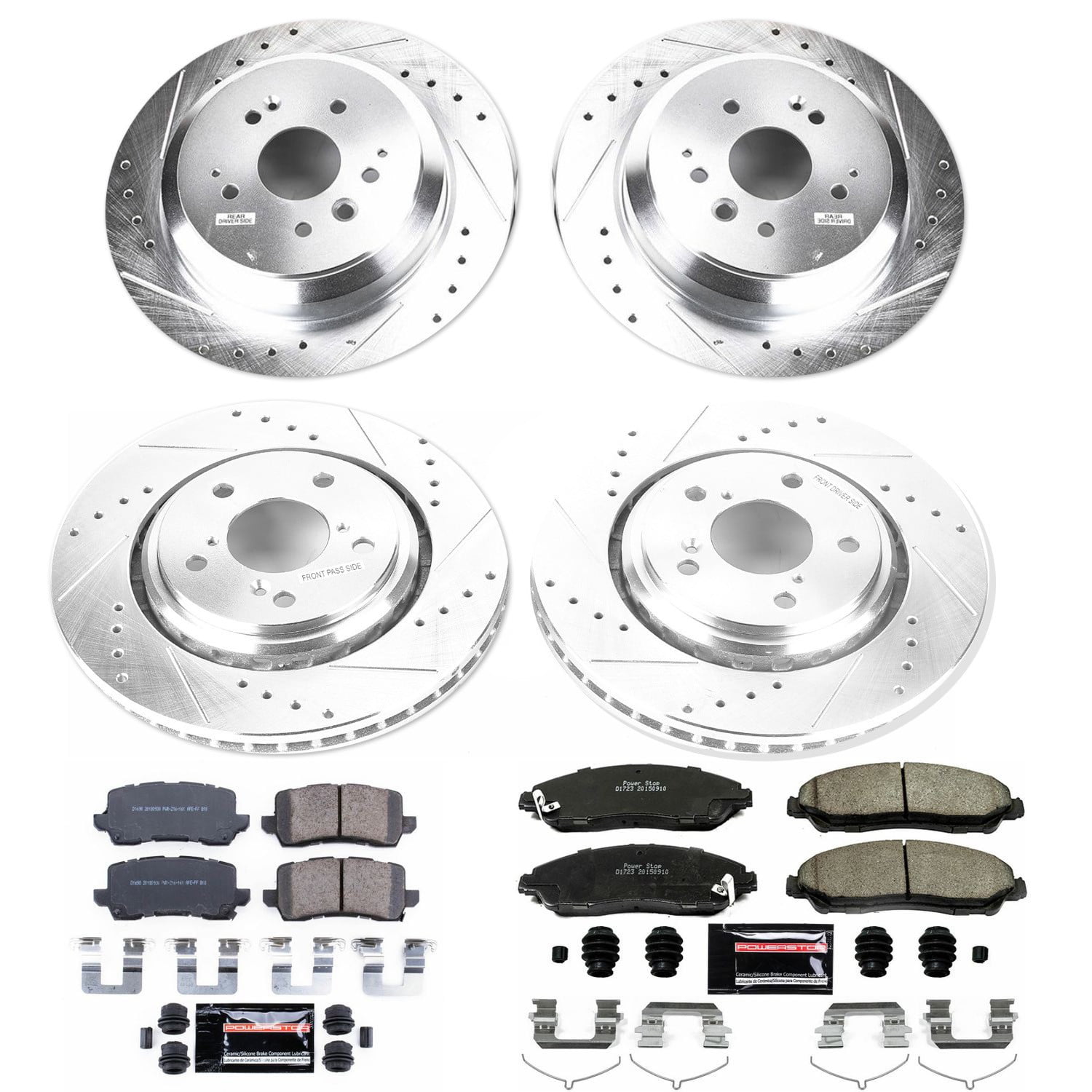 PowerStop Front and Rear Z23 Evolution Sport Carbon-Fiber Ceramic Brake Pad and Drilled & Slotted Rotor Kit Fits: ACURA Select Models K7922 Fits: 2017 2018 2019 2020 ACURA MDX Base; SH-AWD Z23 Front & Rear Brake Pad and Rotor Kit Includes: 2x Front Drilled & Slotted Brake Rotors + 2x Rear Drilled & Slotted Brake Rotors + 1x Front Carbon-Fiber Ceramic Brake Pad Set w/ Hardware + 1x Rear Carbon-Fiber Ceramic Brake Pad Set w/ Hardware Z23 Evolution Sport Brake Upgrade Kit is engineered to improve the braking performance of your daily driven car, truck, SUV, or 4×4 Components within this brake kit are designed to work together to maximize stopping power and long-lasting performance over stock, OE brakes Z23 Evolution Sport brake pads Carbon-Fiber Ceramic formula offers durable, reliable stopping power that out-performs OE and resists brake dust and noise Drilled & slotted brake rotors provide maximum brake cooling and feature Silver Zinc Dichromate plating that protects against rust and corrosion This complete Brake Upgrade Kit comes with everything you need and is ready for quick, easy bolt-on installation with no modifications necessary Brake kit has a 36 month / 36,000 miles warranty
