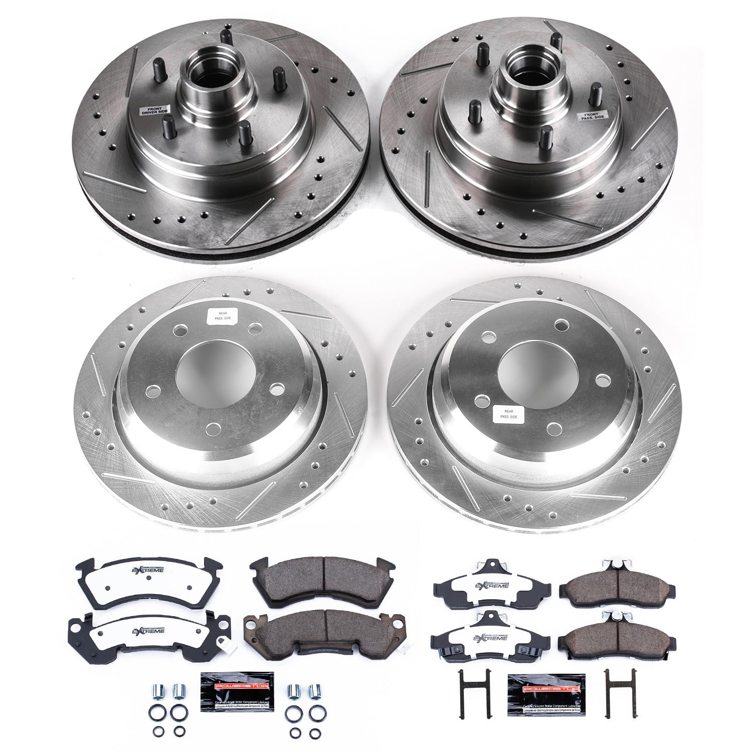PowerStop Front and Rear Z23 Evolution Sport Carbon-Fiber Ceramic Brake Pad and Drilled & Slotted Rotor Kit Fits: CHEVROLET Select Models K4338 Fits: 1994 1995 1996 CHEVROLET IMPALA SS Z23 Front & Rear Brake Pad and Rotor Kit Includes: 2x Front Drilled & Slotted Brake Rotors + 2x Rear Drilled & Slotted Brake Rotors + 1x Front Carbon-Fiber Ceramic Brake Pad Set w/ Hardware + 1x Rear Carbon-Fiber Ceramic Brake Pad Set w/ Hardware Z23 Evolution Sport Brake Upgrade Kit is engineered to improve the braking performance of your daily driven car, truck, SUV, or 4×4 Components within this brake kit are designed to work together to maximize stopping power and long-lasting performance over stock, OE brakes Z23 Evolution Sport brake pads Carbon-Fiber Ceramic formula offers durable, reliable stopping power that out-performs OE and resists brake dust and noise Drilled & slotted brake rotors provide maximum brake cooling and feature Silver Zinc Dichromate plating that protects against rust and corrosion This complete Brake Upgrade Kit comes with everything you need and is ready for quick, easy bolt-on installation with no modifications necessary Brake kit has a 36 month / 36,000 miles warranty