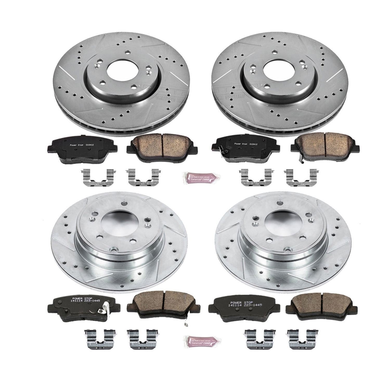 PowerStop Front and Rear Z23 Evolution Sport Carbon-Fiber Ceramic Brake Pad and Drilled & Slotted Rotor Kit Fits: HYUNDAI KIA Select Models K5376 Fits: 2014 2015 KIA OPTIMA EX| 2011 2012 KIA OPTIMA EX w/ 2.4L; LX| 2013 KIA OPTIMA EX w/2.4L| 2011 2012 2013 2014 HYUNDAI SONATA Gas| 2011 2012 2016 KIA OPTIMA Hybrid| 2011 2012 2013 2014 HYUNDAI SONATA Hybrid| 2014 2015 KIA OPTIMA Hybrid LX| 2015 HYUNDAI SONATA Hybrid, Hybrid Limited| 2013 KIA OPTIMA Hybrid; Hybrid EX; Hybrid LX| 2013 2014 2015 KIA OPTIMA LX| 2014 KIA OPTIMA SX| 2015 KIA OPTIMA SX; Assembled in Korea Z23 Front & Rear Brake Pad and Rotor Kit Includes: 2x Front Drilled & Slotted Brake Rotors + 2x Rear Drilled & Slotted Brake Rotors + 1x Front Carbon-Fiber Ceramic Brake Pad Set w/ Hardware + 1x Rear Carbon-Fiber Ceramic Brake Pad Set w/ Hardware Z23 Evolution Sport Brake Upgrade Kit is engineered to improve the braking performance of your daily driven car, truck, SUV, or 4×4 Components within this brake kit are designed to work together to maximize stopping power and long-lasting performance over stock, OE brakes Z23 Evolution Sport brake pads Carbon-Fiber Ceramic formula offers durable, reliable stopping power that out-performs OE and resists brake dust and noise Drilled & slotted brake rotors provide maximum brake cooling and feature Silver Zinc Dichromate plating that protects against rust and corrosion This complete Brake Upgrade Kit comes with everything you need and is ready for quick, easy bolt-on installation with no modifications necessary Brake kit has a 36 month / 36,000 miles warranty