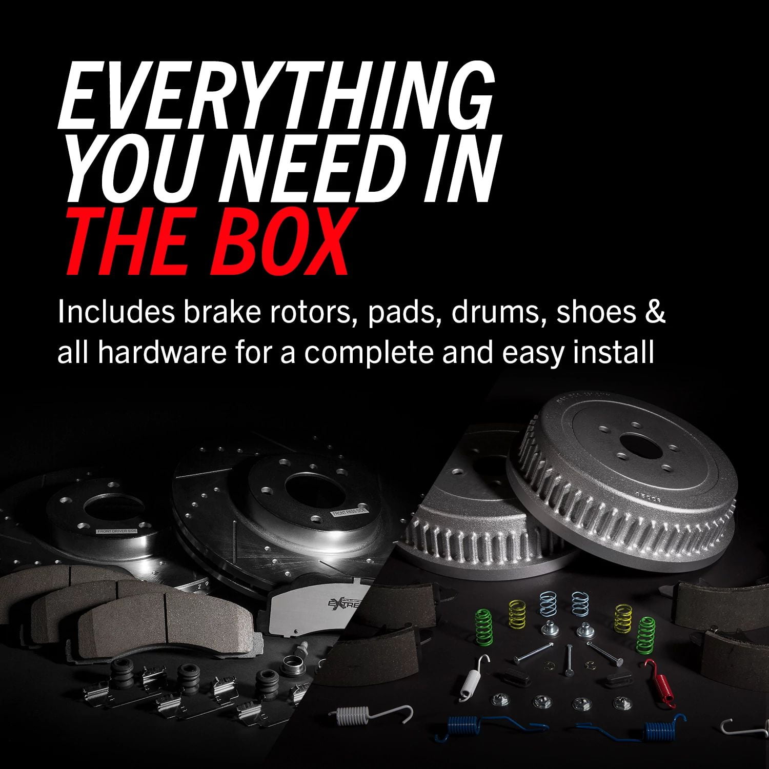 Z36 Front & Rear Brake Pad Rotor Drum and Shoe Kit Includes: 2x Front Drilled & Slotted Brake Rotors + 2x Rear Brake Drums + 1x Front Carbon-Fiber Ceramic Brake Pad Set w/Hardware + 1x Rear Brake Shoe Set w/Hold Down and Adjuster Kit Z36 Truck & Tow Brake Upgrade Kit provides trucks, SUVs, & 4x4s durable, reliable stopping power that is designed to handle the added stress of towing, hauling, mountainous driving or lifted trucks with reduced brake fade Components within this brake kit are designed to work together to maximize stopping power and long-lasting performance over stock, OE brakes Z36 Truck & Tow brake pads Carbon-Fiber Ceramic formula offers durable, reliable stopping power that out-performs OE and resists brake dust and noise Drilled & slotted brake rotors provide maximum brake cooling and feature Silver Zinc Dichromate plating that protects against rust and corrosion This complete Brake Upgrade Kit comes with everything you need and is ready for quick, easy bolt-on installation with no modifications necessary Brake kit has a 36 month / 36,000 miles warranty