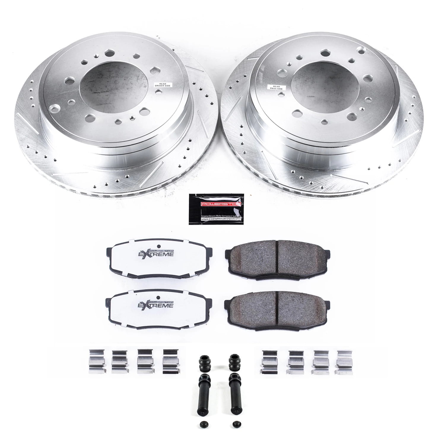 Z36 Truck and Tow Rear Brake Pad and Rotor Kit Includes: 2x Rear Drilled & Slotted Brake Rotors + 1x Rear Z36 Carbon-Fiber Ceramic Brake Pad Set with Hardware Z36 Truck & Tow Brake Upgrade Kit provides trucks, SUVs, & 4x4s durable, reliable stopping power that is designed to handle the added stress of towing, hauling, mountainous driving or lifted trucks with reduced brake fade Components within this brake kit are designed to work together to maximize stopping power and long-lasting performance over stock, OE brakes Z36 Truck & Tow brake pads Carbon-Fiber Ceramic formula offers durable, reliable stopping power that out-performs OE and resists brake dust and noise Drilled & slotted brake rotors provide maximum brake cooling and feature Silver Zinc Dichromate plating that protects against rust and corrosion This complete Brake Upgrade Kit comes with everything you need and is ready for quick, easy bolt-on installation with no modifications necessary Brake kit has a 36 month / 36,000 miles warranty Fits: Lexus LX570 2011-2008; LX570 2018-2013; Toyota Land Cruiser 2011-2008; Land Cruiser 2019-2013; Sequoia 2019-2008; Tundra 2019-2007