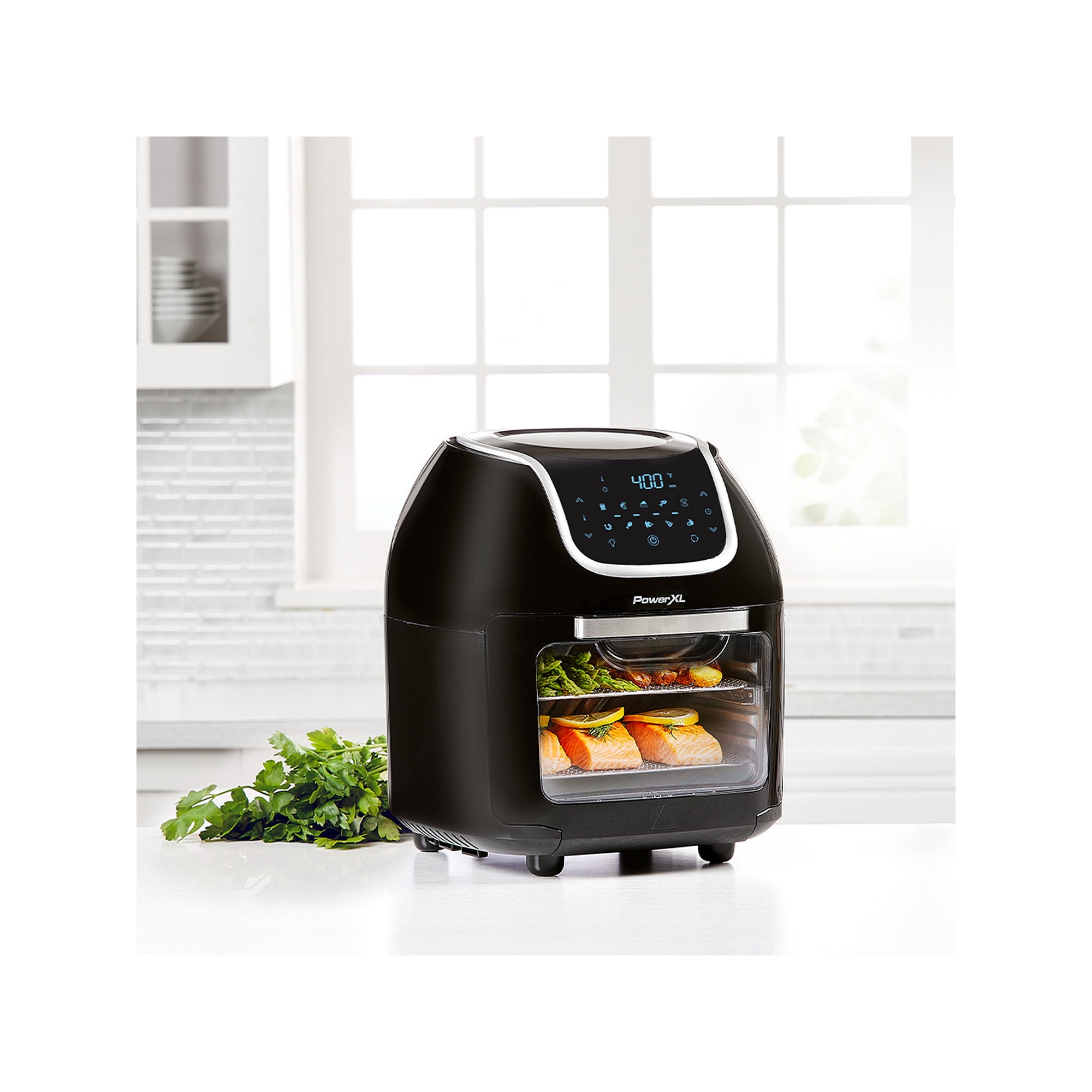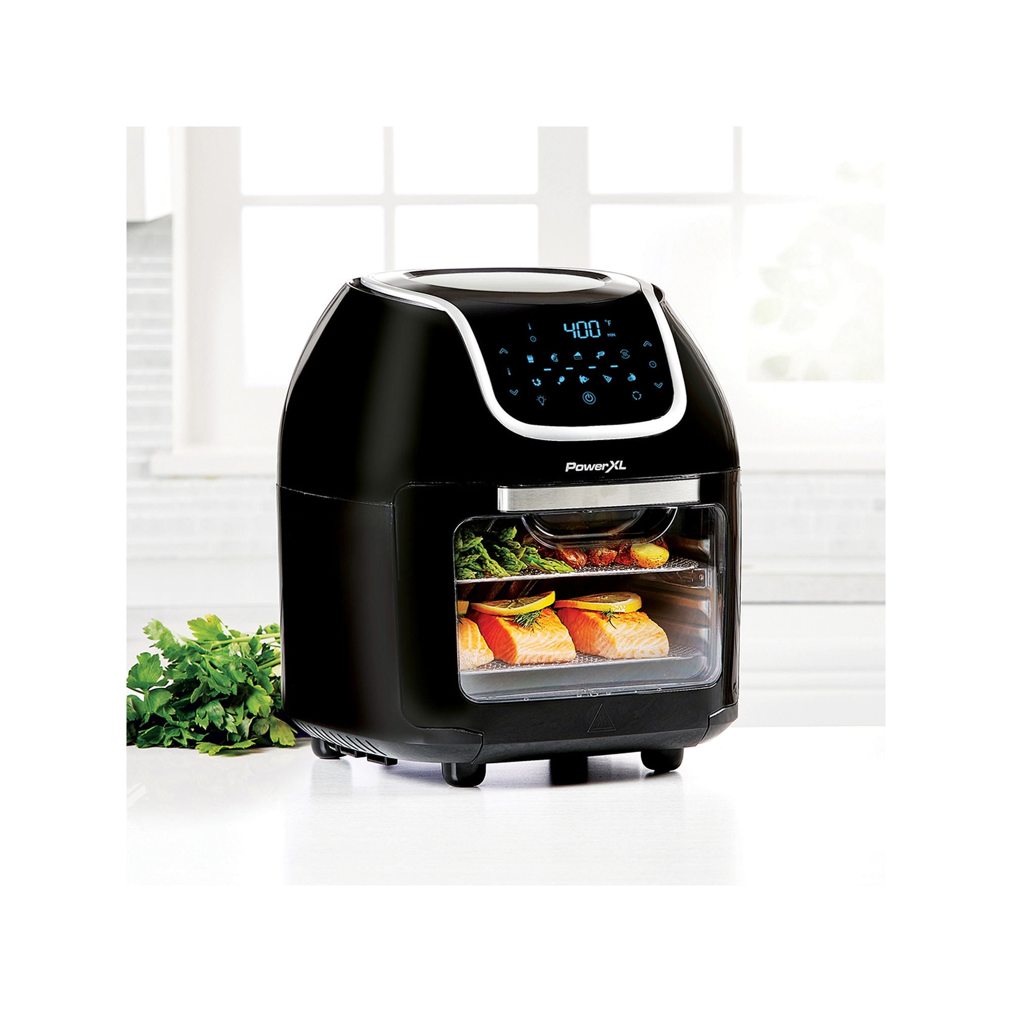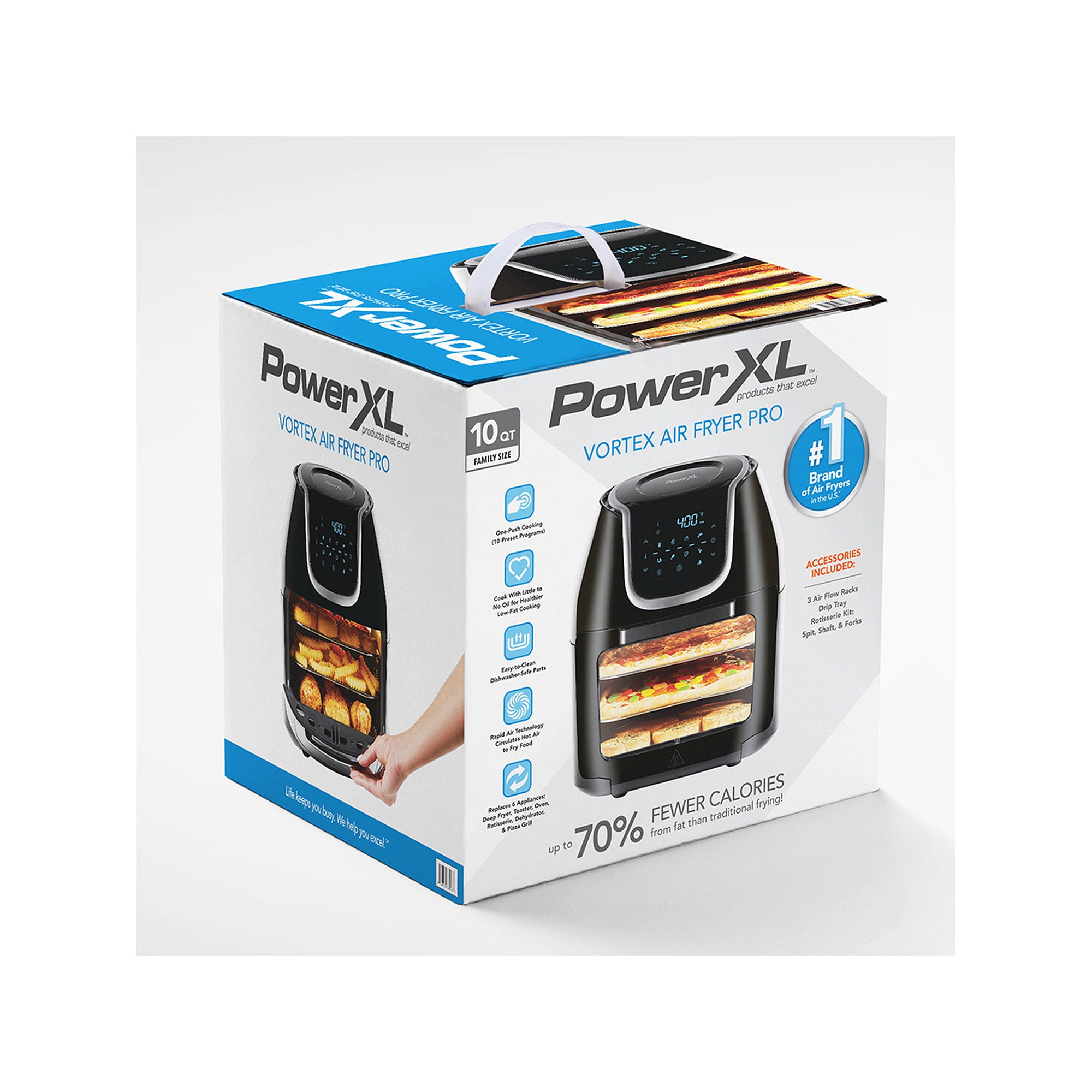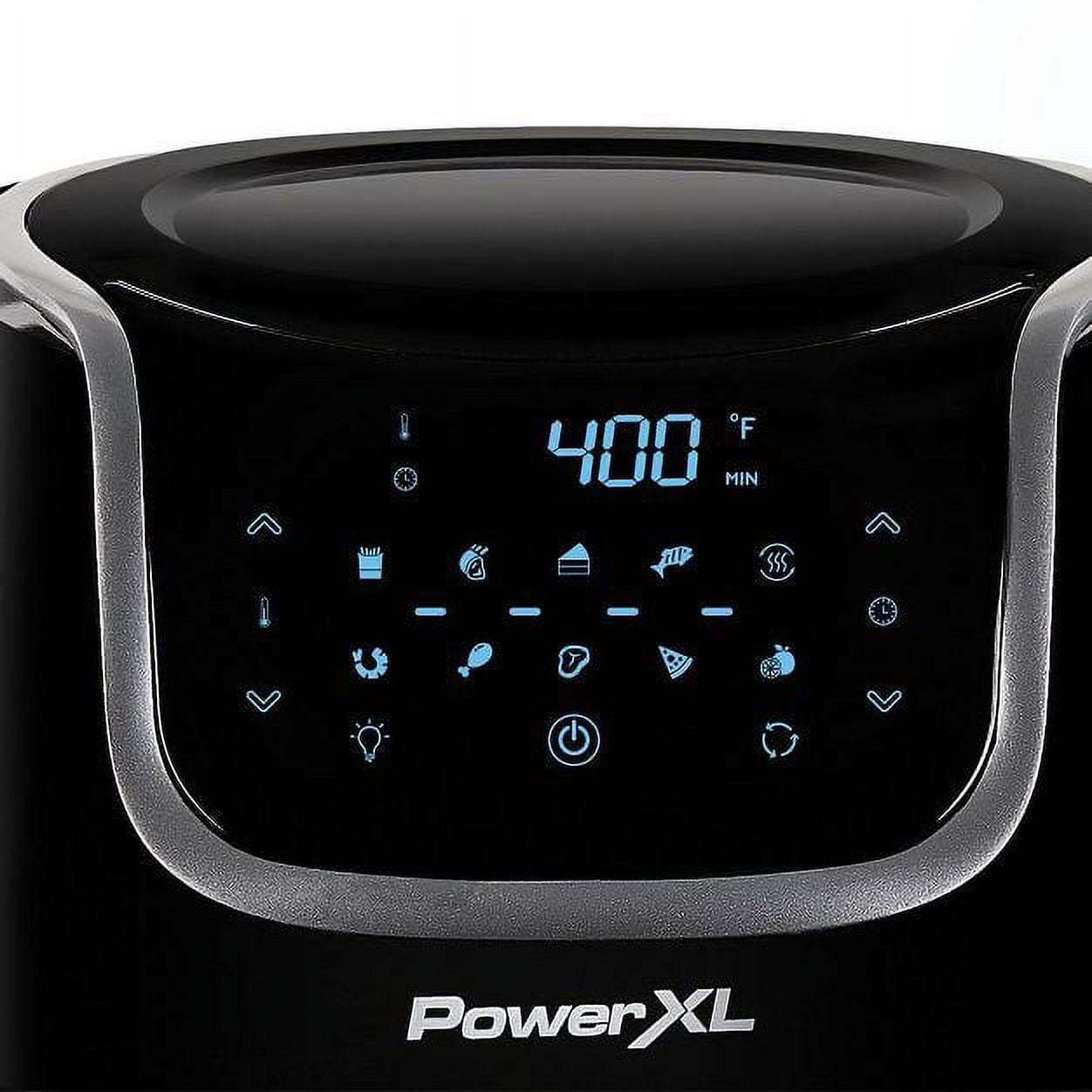 PowerXL Vortex Air Fryer Pro 10QT Air Fryer, Black 6 in 1 Multi Use Design 6-in-1 multi-use design: Air Fry, Broil, Bake, Roast, Dehydrate, Reheat 10 one-touch programs: French Fries, Steak, Chicken, Fish, Shrimp, Bake, Roast, Dehydrating, Pizza, Reheat True Air frying technology with a heat element and fan delivering super heated, vortex air Vortex interior wall circulates air more evenly for consistent cooking Up to 70% fewer calories from fat compared to deep frying Cook with little to no oil, no trans fats, and no greasy mess Easy-to-use LED touch-panel display for convenient operation Clear front window allows for easy viewing of cooking progress