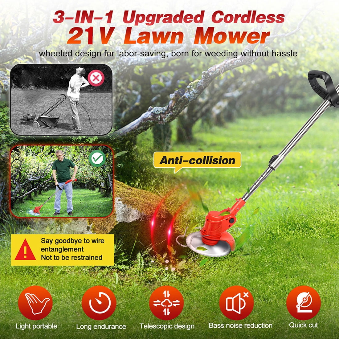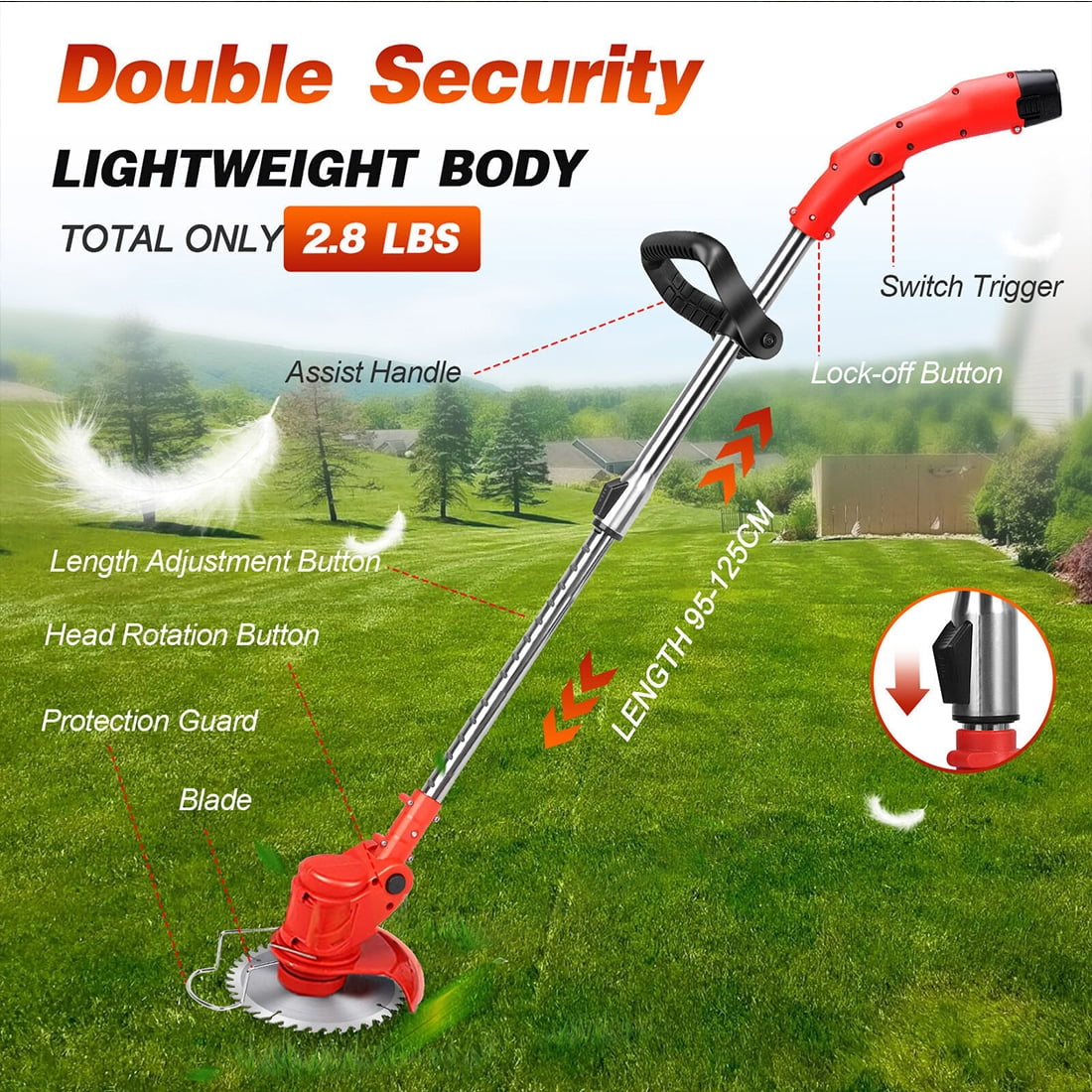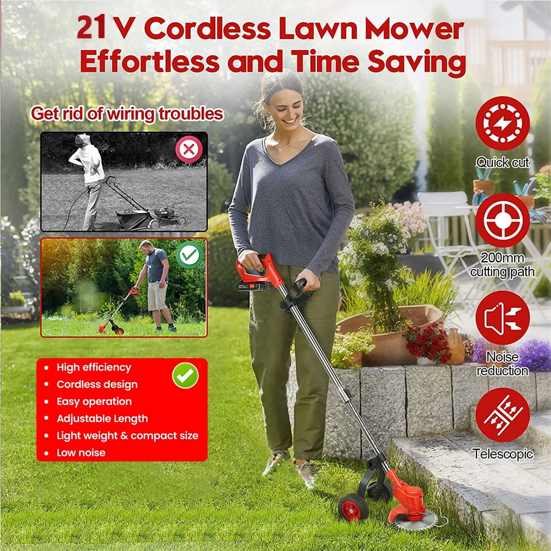 【Powful and Lightweight Cordless Weed Eater 】The electric weed eater battery powered use durable and reliable weed wacker cordless motor that provides excellent performance, Say goodbye to motor burn-out, 18000 RMP no-load speed. At just 3.6 pounds, the battery weed wacker with charger is lightweight and easy to use. Women and the elderly can also easily use this electric lawn mower cordless for weeding work. 【High-efficiency Battery】Electric weed wacker cordless with 800W powerful motor of 8300 RPM. Includes 2 rechargeable 2000mAh high-capacity 21V batteries,complete the weeding task in one go! Our battery weed eater capacity inner is 10% higher than other cordless brush cutters, with multiple protection functions for a safer and longer life! 【3-IN-1 edger lawn tool cordless】This battery operated weed wacker with charger is not only a grass trimmer but also a wheeled lawn edgers battery powered sidewalk edger, easily converting in seconds without tools, a Full 90° swivel head, equipped adjustable telescoping shaft (height from 35.65 to 50.69 inch) allows you to trim in tight spaces without bending down, garden weed wacker giving you a more comfortable experience. 【Mulitifunctional lawn edgers battery powered】Grass trimmer is equipped with 3 types of blades: 6 inches Saw Blades for trimming thick shrub branches/heavy bushes (a thickness of about 1-2 inches), Stainless steel blades that are well for older weeds, reeds, etc pruning, Plastic blades are suitable for soft lawn mowing, Durable metal blade allows you to cut through dense vegetation and grass in less. 【Safety and Practical Design】The protective ring allows you to prune without damaging your plants and landscape and also keeps the no string trimmer away from hard objects such as stones to avoid unnecessary wear and tear, very practical. 【Ergonomic Design Electric Battery Operated Weed Eater】The small push lawn mower with an ergonomic design provides a great maneuvering experience, auxiliary handle gives more comfortable & balanced control, easy to move around the garden. Rotating baffle design, to prevent splashing when the wedding, makes the battery lawn mower cordless achieves a fast, efficient cut.