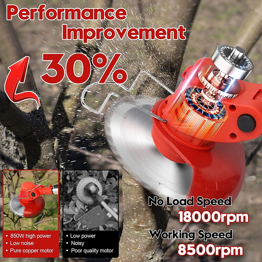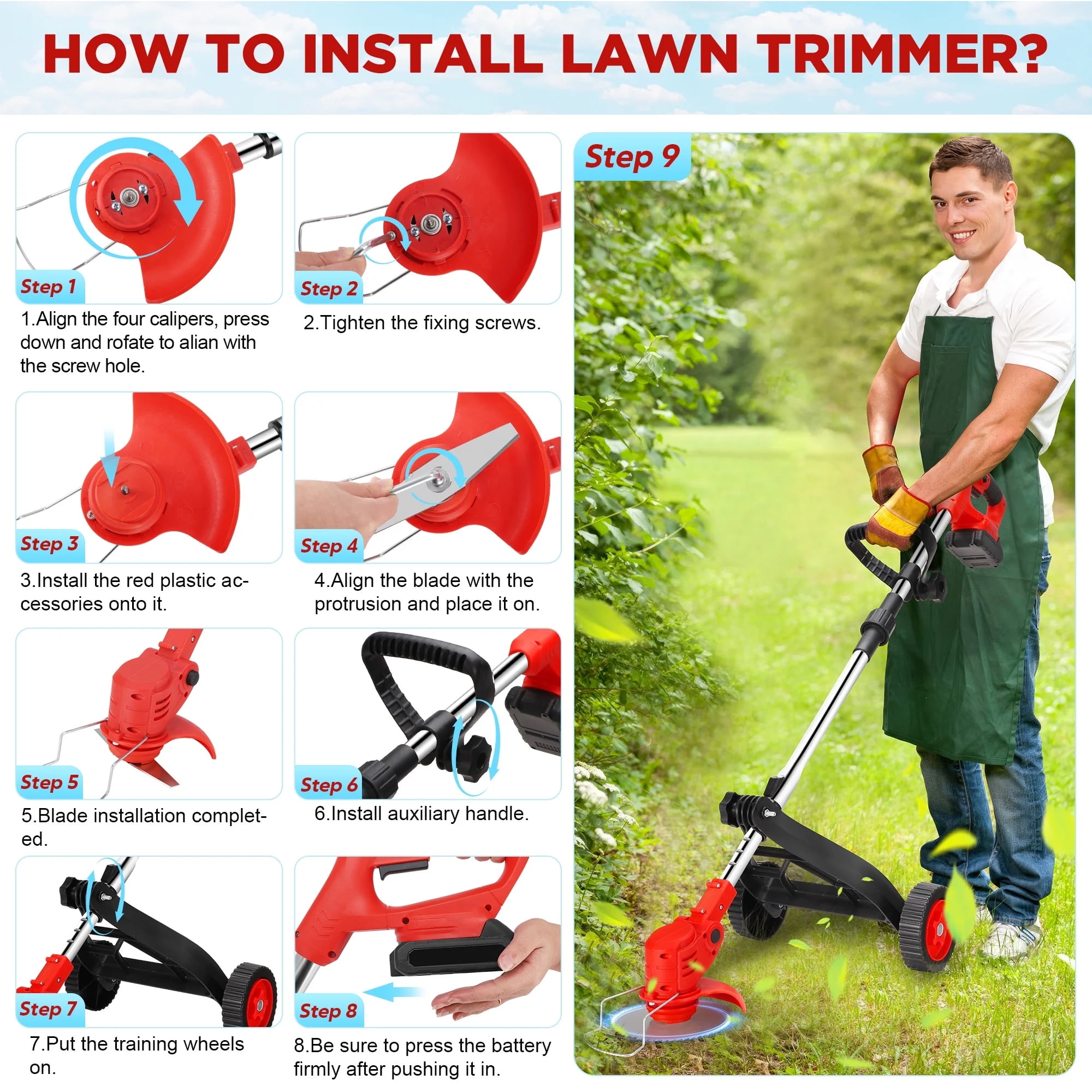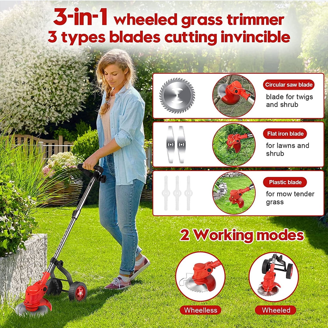 【Powful and Lightweight Cordless Weed Eater 】The electric weed eater battery powered use durable and reliable weed wacker cordless motor that provides excellent performance, Say goodbye to motor burn-out, 18000 RMP no-load speed. At just 3.6 pounds, the battery weed wacker with charger is lightweight and easy to use. Women and the elderly can also easily use this electric lawn mower cordless for weeding work. 【High-efficiency Battery】Electric weed wacker cordless with 800W powerful motor of 8300 RPM. Includes 2 rechargeable 2000mAh high-capacity 21V batteries,complete the weeding task in one go! Our battery weed eater capacity inner is 10% higher than other cordless brush cutters, with multiple protection functions for a safer and longer life! 【3-IN-1 edger lawn tool cordless】This battery operated weed wacker with charger is not only a grass trimmer but also a wheeled lawn edgers battery powered sidewalk edger, easily converting in seconds without tools, a Full 90° swivel head, equipped adjustable telescoping shaft (height from 35.65 to 50.69 inch) allows you to trim in tight spaces without bending down, garden weed wacker giving you a more comfortable experience. 【Mulitifunctional lawn edgers battery powered】Grass trimmer is equipped with 3 types of blades: 6 inches Saw Blades for trimming thick shrub branches/heavy bushes (a thickness of about 1-2 inches), Stainless steel blades that are well for older weeds, reeds, etc pruning, Plastic blades are suitable for soft lawn mowing, Durable metal blade allows you to cut through dense vegetation and grass in less. 【Safety and Practical Design】The protective ring allows you to prune without damaging your plants and landscape and also keeps the no string trimmer away from hard objects such as stones to avoid unnecessary wear and tear, very practical. 【Ergonomic Design Electric Battery Operated Weed Eater】The small push lawn mower with an ergonomic design provides a great maneuvering experience, auxiliary handle gives more comfortable & balanced control, easy to move around the garden. Rotating baffle design, to prevent splashing when the wedding, makes the battery lawn mower cordless achieves a fast, efficient cut.