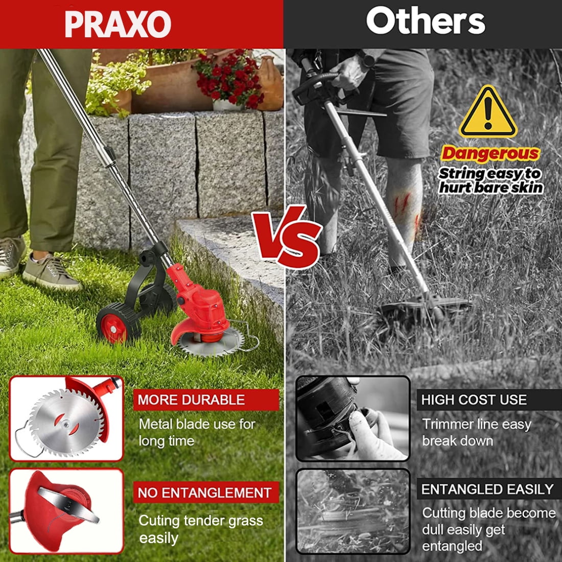 PRAXO Cordless Weed Wacker 3-in-1 Brush Cutter Grass Trimmer with Upgraded Wheels,21V Electric Weed Eater 2000mAh Battery Powered, String Trimmer Edger Lawn Tool for Garden UPGRADED WHEELS: 1. Adjust direction of small buckle to adjust the wheel angle 2. The triangular structure of the stand is more stable, ensuring that it can work in the most complex environments. 3. Wider tires allow you to push the weed eater more smoothly. 4.90°adjustable machine head for easy cutting at hard to reach areas. Easy to use, stable, efficient and quick. Ergonomics: comfortable auxiliary handle for easy handling Specification: Power input: 21V No load speed: 18000 RPM Working Speed: 8500 RPM Battery type: 2000mAh Lithium Battery Charging time: 2 hours/ per battery Dimensions: 35 x 5.9 x 5.9 inches Package include: 1x weed whacker 2x 24V rechargeable Li-Ion battery 1x charger 1x 6″ saw blade 2x metal blades 5x plastic blades 1xwheels 2x rotating wrenches 1x pair of non-slip gloves 1x pair of safety glasses 1x user manual