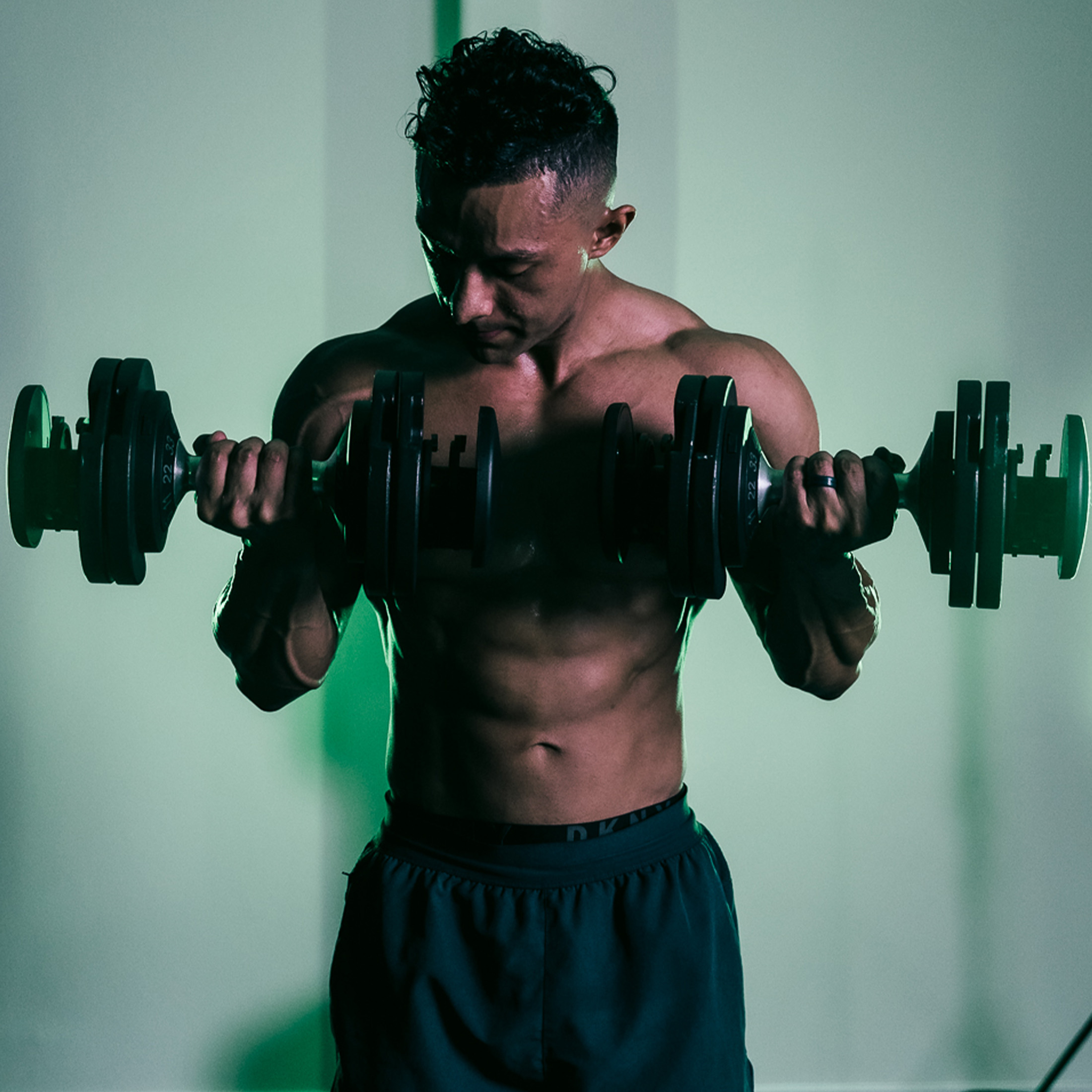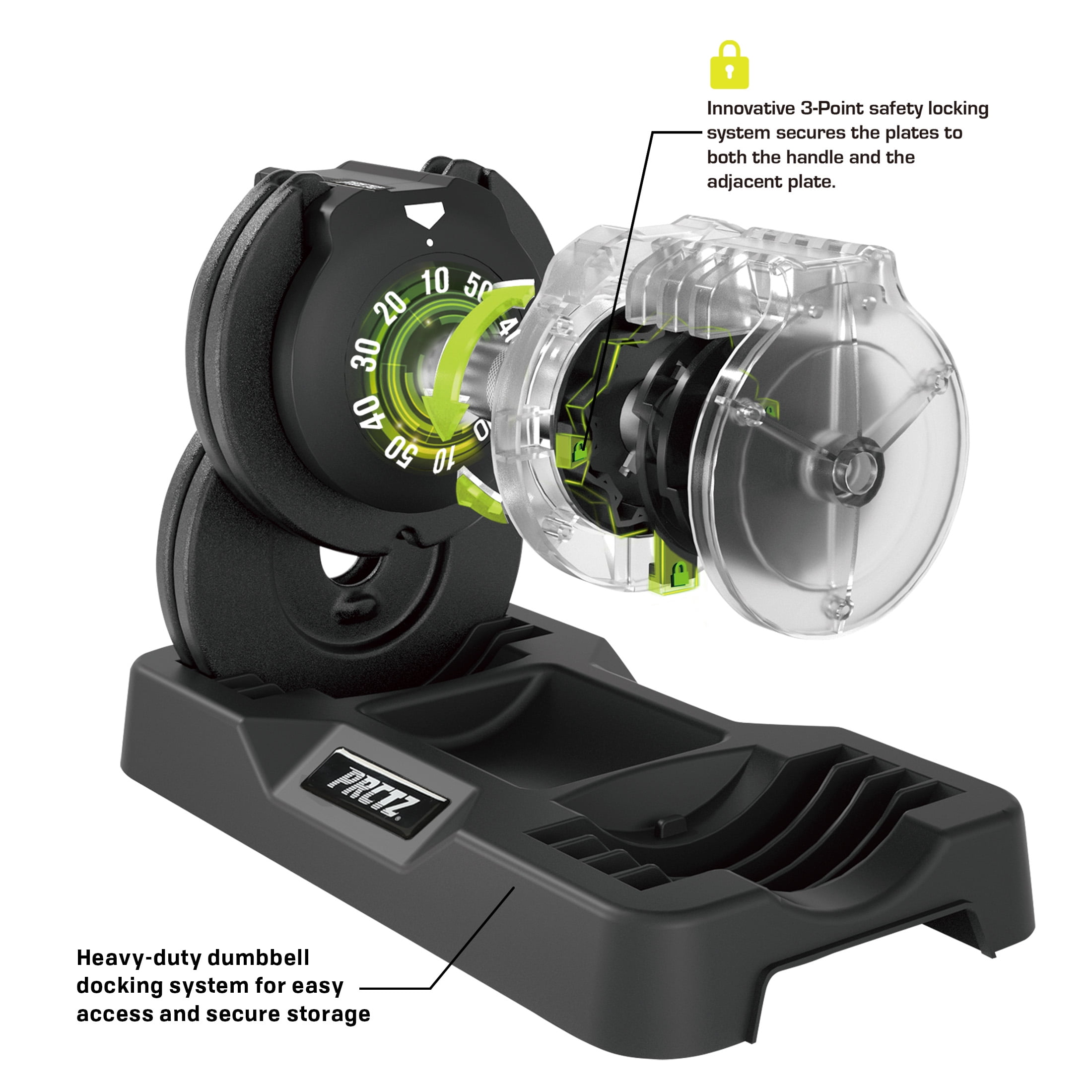 One adjustable dumbbells quick and easy weight adjustments from 10 to 50 lbs Adjustment increments: 10lbs, 20lbs, 30lbs, 40lb to 50lbs 10 cast iron weight plates Dumbbell handle ends feature dual-sided weight selection wheel with innovative 3-point safety locking system for weight selection Contoured, textured and soft grip handle design provides comfortable and secure grip control Heavy-duty dumbbell docking system for easy access and secure storage