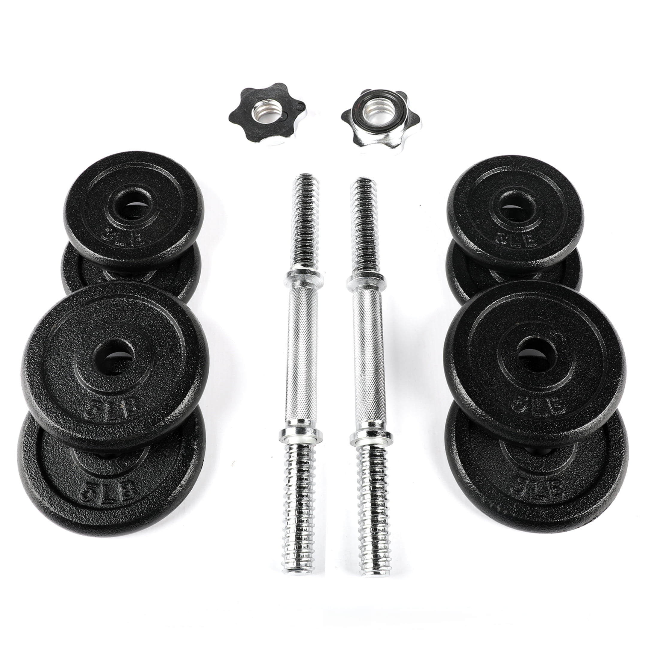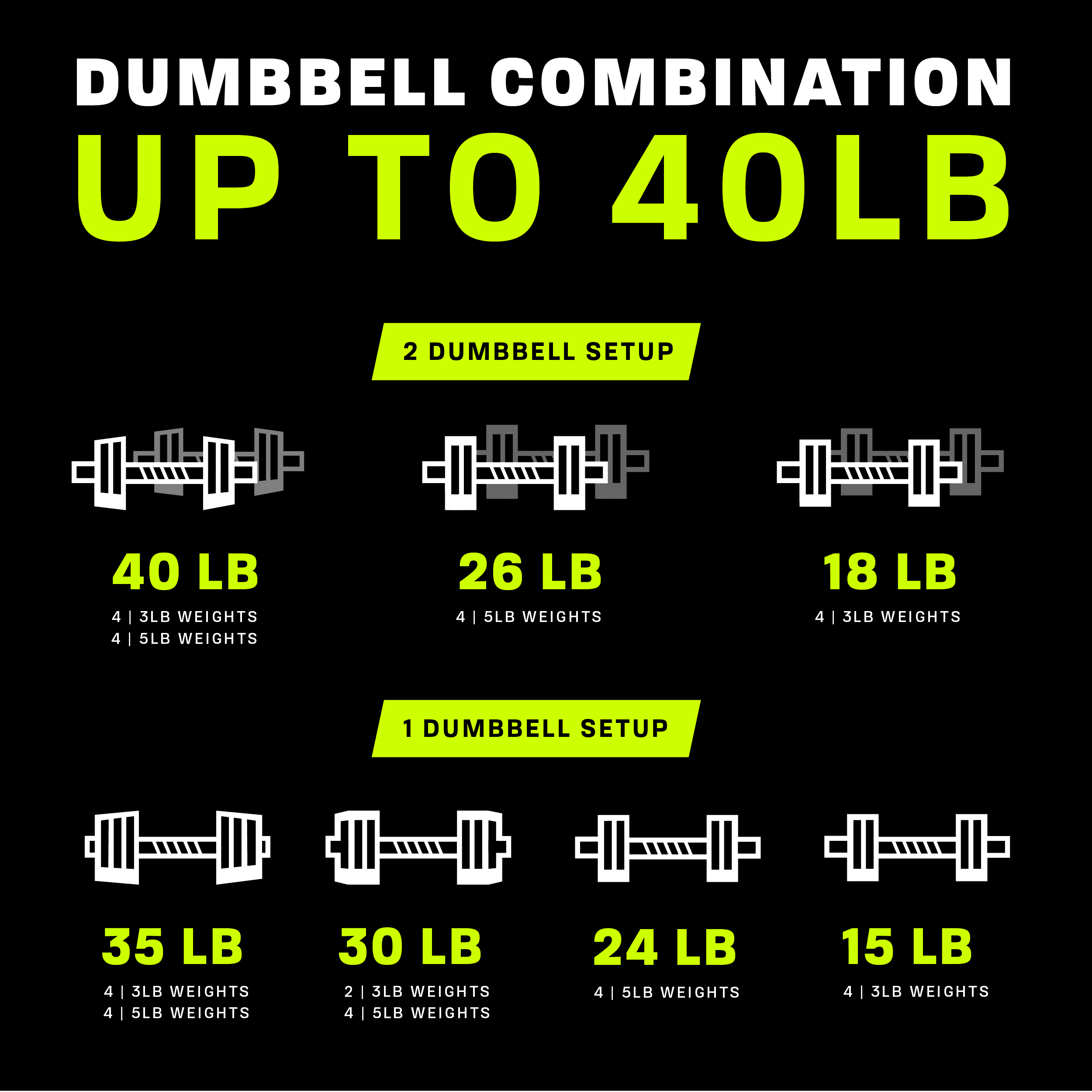 Great choice for both beginners and advanced fitness enthusiast Fully-knurled handles for a secure grip Adjustable cast iron dumbbell set includes: Four 3lb plates (11lbs 12.2oz in total) Four 5lb plates (20lbs 6.2oz in total) Two 14″ standard size (1″ dia) dumbbell handles (5lbs 8.8oz) Four: spin-lock collars (2lb 2oz in total) Total weight: 40lbs