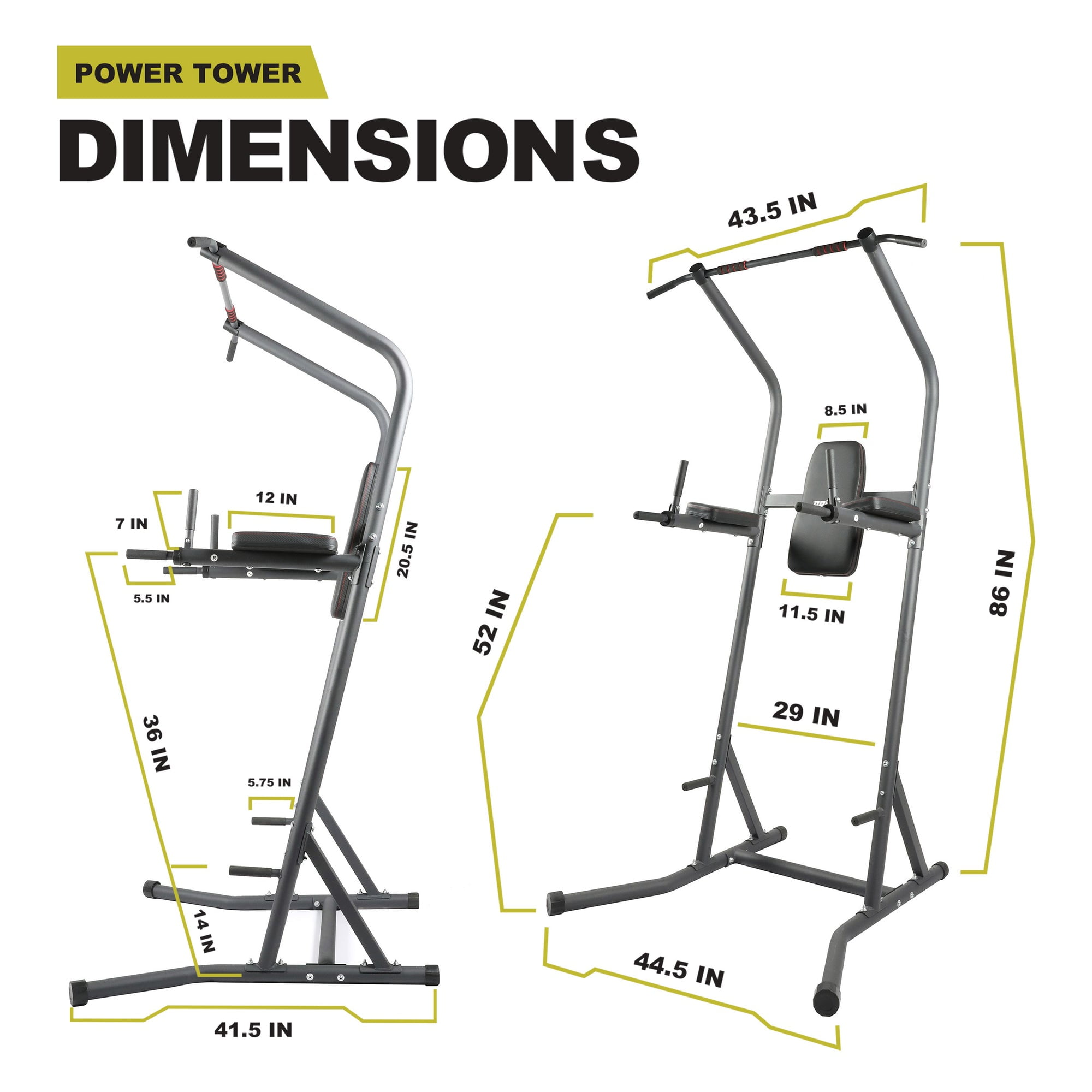 PRCTZ Power Tower Dip Station Pull-up Bar for Home Gym 5 workout stations in 1 machine for a full-body workout Steel frame design and construction for maximum stability Supports up to 250 lb capacity Ideal for pull-ups, knee raises, and push-ups Pull-up and chin-up bar features both inner and wide grip options to target multiple muscle groups
