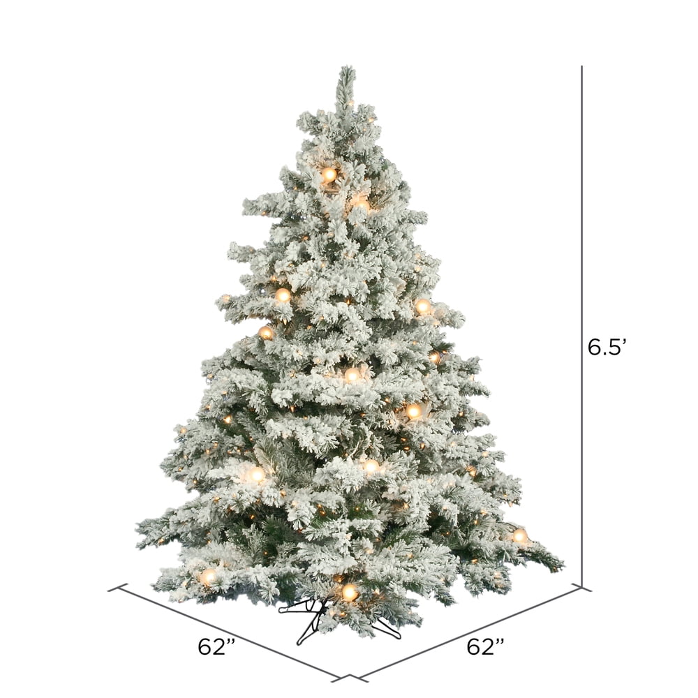Pre-Lit 6.5′ x 62″ Alaskan Dura-Lit Artificial Christmas Tree, Flocked White on Green, Clear Lights: Dura-Lit lights utilizes microchips in each socket so bulbs stay lit even when some bulbs are broken or missing 5-year light and 10-year construction limited manufacturer warranty Heavy duty metal stand Convenient on/off foot switch Product comes double boxed for better storage Made of PVC