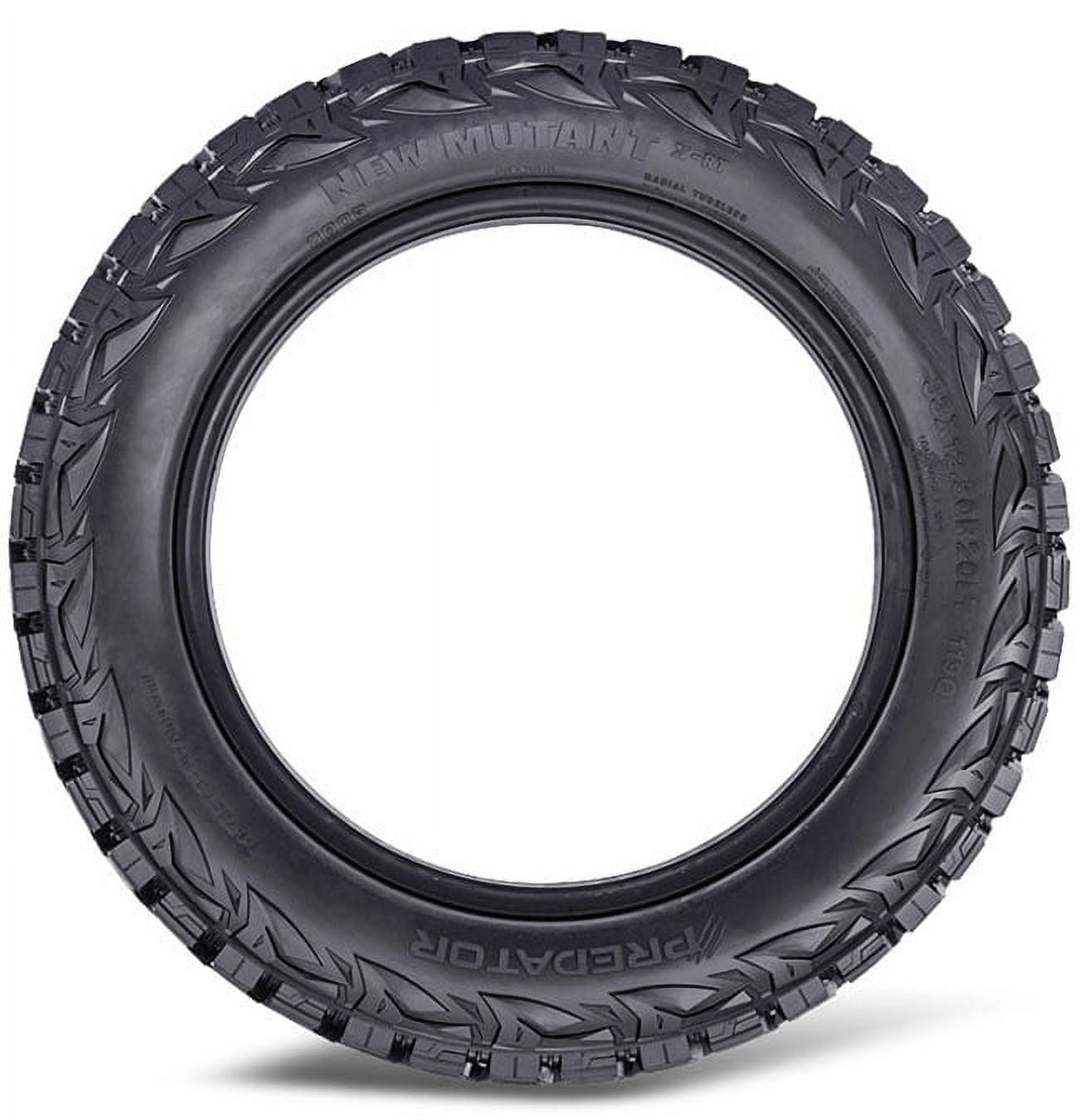 Predator New Mutant X-RT LT275/70R18 125/122R E OVERVIEW Predator’s New Mutant X-RT is an all-terrain tire that’s designed for use on Jeeps, light trucks, and SUVs and features a dual sidewall design that allows drivers to choose the look the matches their ride. Widely spaced grooves promote self-cleaning for consistent traction and to protect the casing from damage, and the New Mutant X-RT’s stagged shoulder lugs enhance grip in deep sand and loose mud for solid off-road performance.