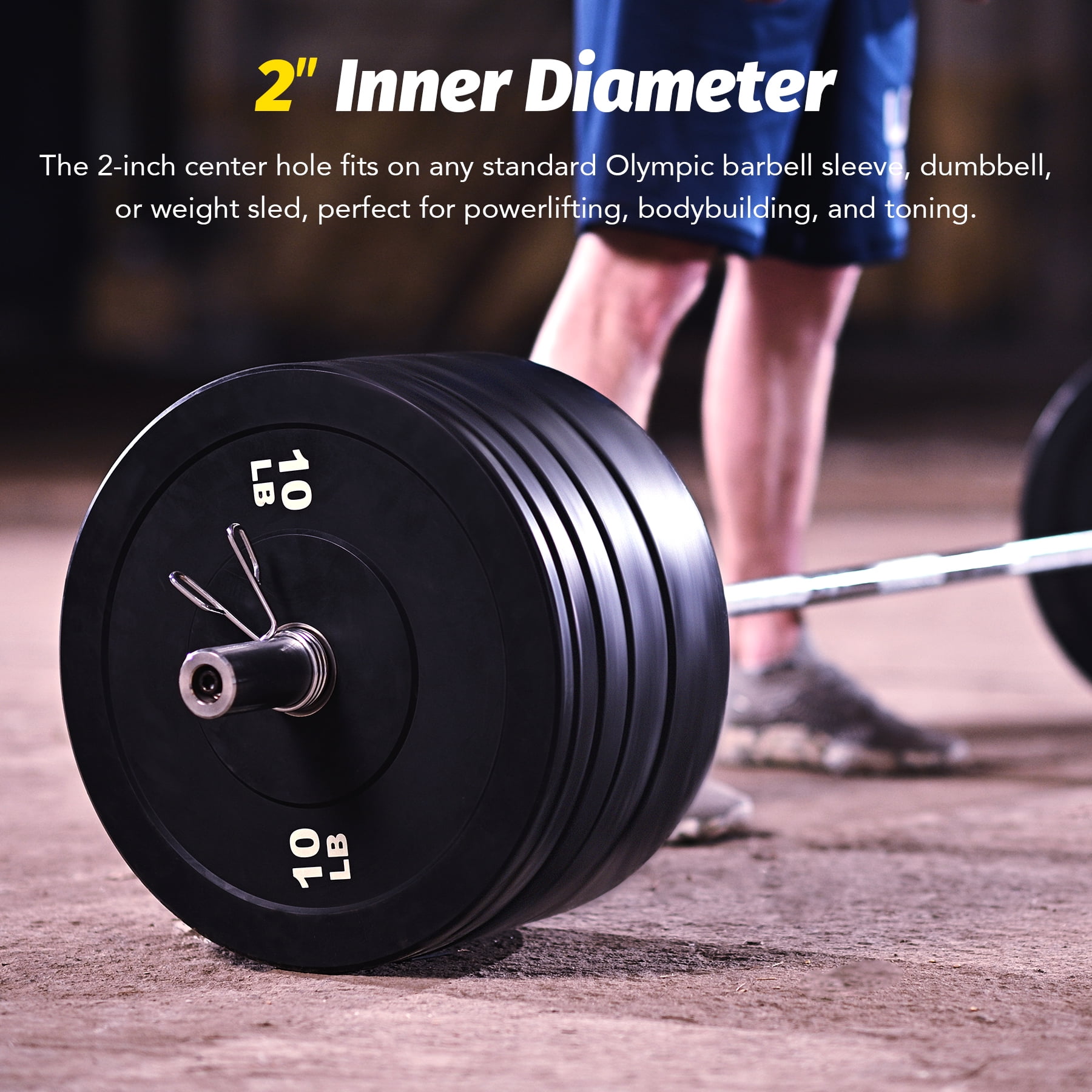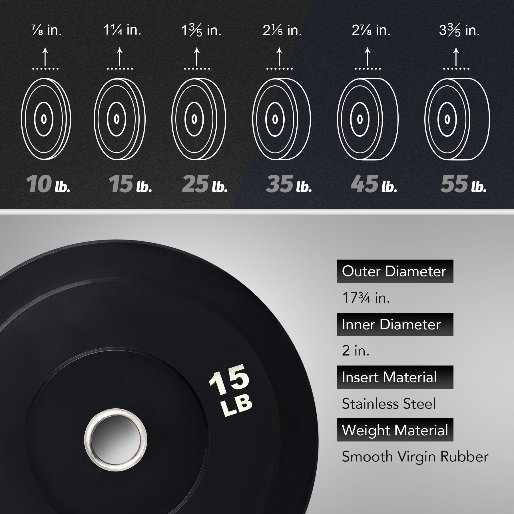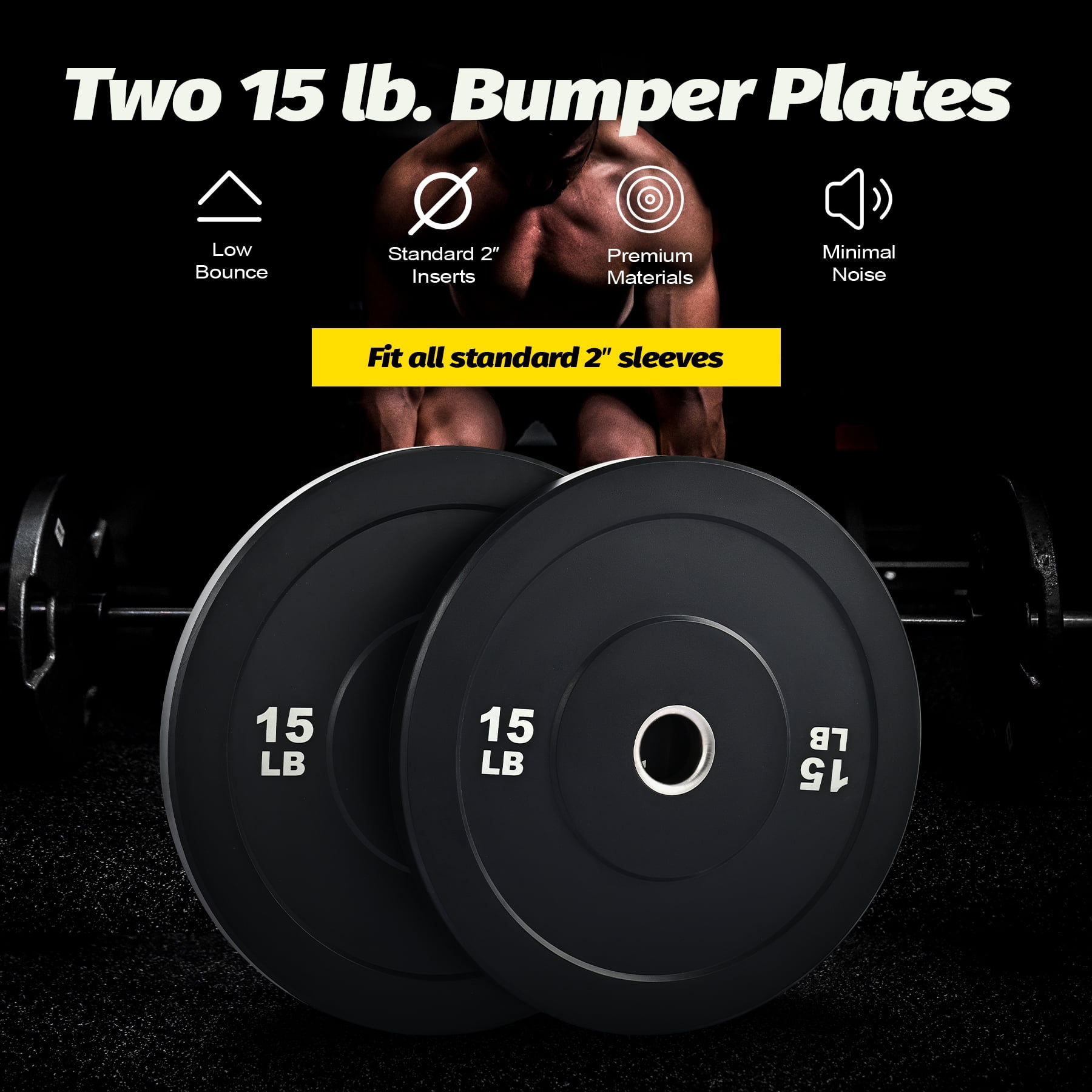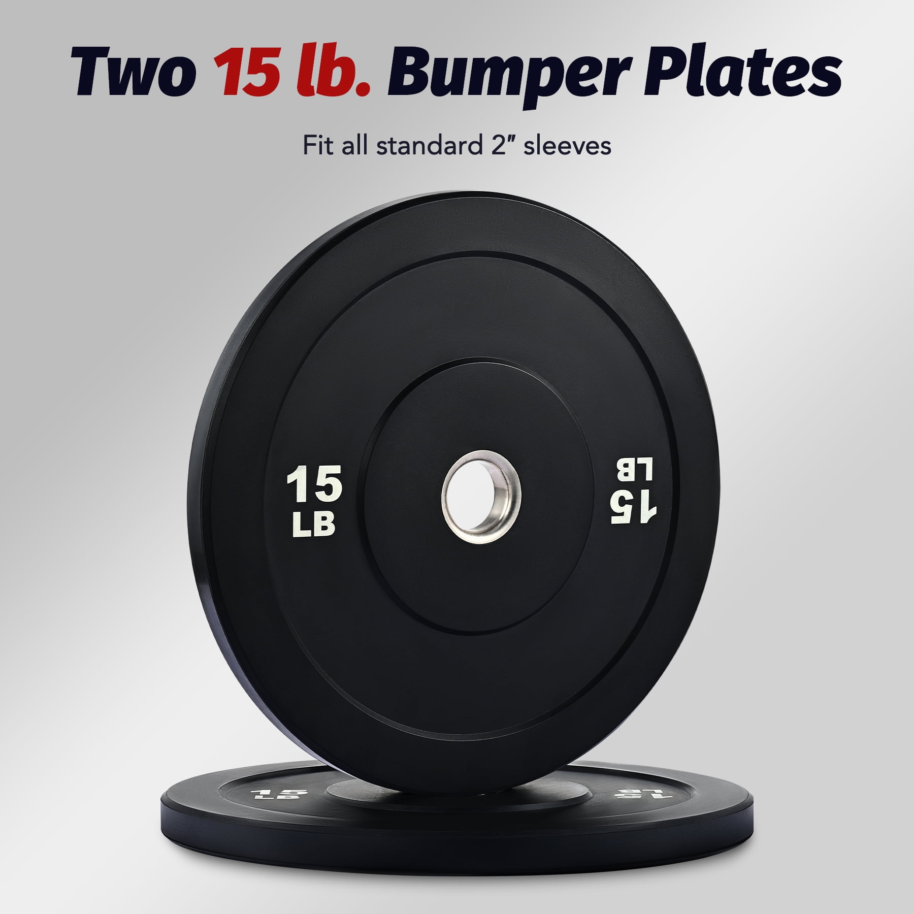 TWIN 15LB PLATES: Our bumper plate set includes two 15 pound weights with 17.7″ by 1.3″ IWF dimensions and 2 inch center holes to mix and match with standard strength training equipment, including Olympic barbells, hex bars, dumbbells, sleds, and racks LOW BOUNCE RUBBER: Our premium virgin rubber plates have 80-durometer density with a far quieter drop than clanging iron or steel competition; simultaneously, their softer sides and minimal bounce protect your flooring from damage and prevent accidental injury, especially when exercising with others STAINLESS STEEL INSERTS: Each 15 lb. weight plate has a stainless steel insert to offer a smooth snug fit for standard 2″ Olympic equipment, providing years more service than iron and bronze alternatives whether used with weight benches or for straight power lifting and floor work CLEAR WEIGHT MARKING: Keeping organization and change-outs quick and easy, each bumper plate is clearly marked with high-contrast white weight markings in pounds, easily read from across the room VERSATILE USE: Get started sweating and lifting your way to greatness as you punish these plates with a wide range of exercises from bench presses, squats, and deadlifts to pylos, twists, and halos whether in your home or school gym or at a professional training center Want a healthier body and better physique but find it difficult to make time for the gym? This set of two 15 pound bumper plates is the perfect choice for your home gym! These versatile weight plates are ideal for Olympic barbells, dumbbells, weight sleds, or racks with 2 inch sleeves. Made from high-density virgin rubber, these 17.7 inch plates boast an 80 durometer rating, withstanding repeated drops with minimal noise and exceptional durability, keeping your floors intact and your neighbors happy. Our solid stainless steel inserts offer smooth use for your exercise equipment without scuffing, scratching, or sticking, providing dependable use over the long term. To make change-outs quick and easy, each plate is clearly marked with clear high-contrast weight markings in pounds. Whether you’re just starting out or an experienced lifter, these low-bounce bumpers are just what you’re looking for! Get this helpful home gym gear today and get started burning more calories, building your endurance, and reshaping your body better than ever! Specifications Material: Virgin Rubber, Stainless Steel Color: Black Diameter: 17.7 in. (45 cm) ea. Thickness: 1.3 in. (3.2 cm) ea. Insert Diameter: 2 in. (5 cm) ea. Net Weight: 15 lb. (6.8 kg) ea. Package List 2 x Bumper Plates