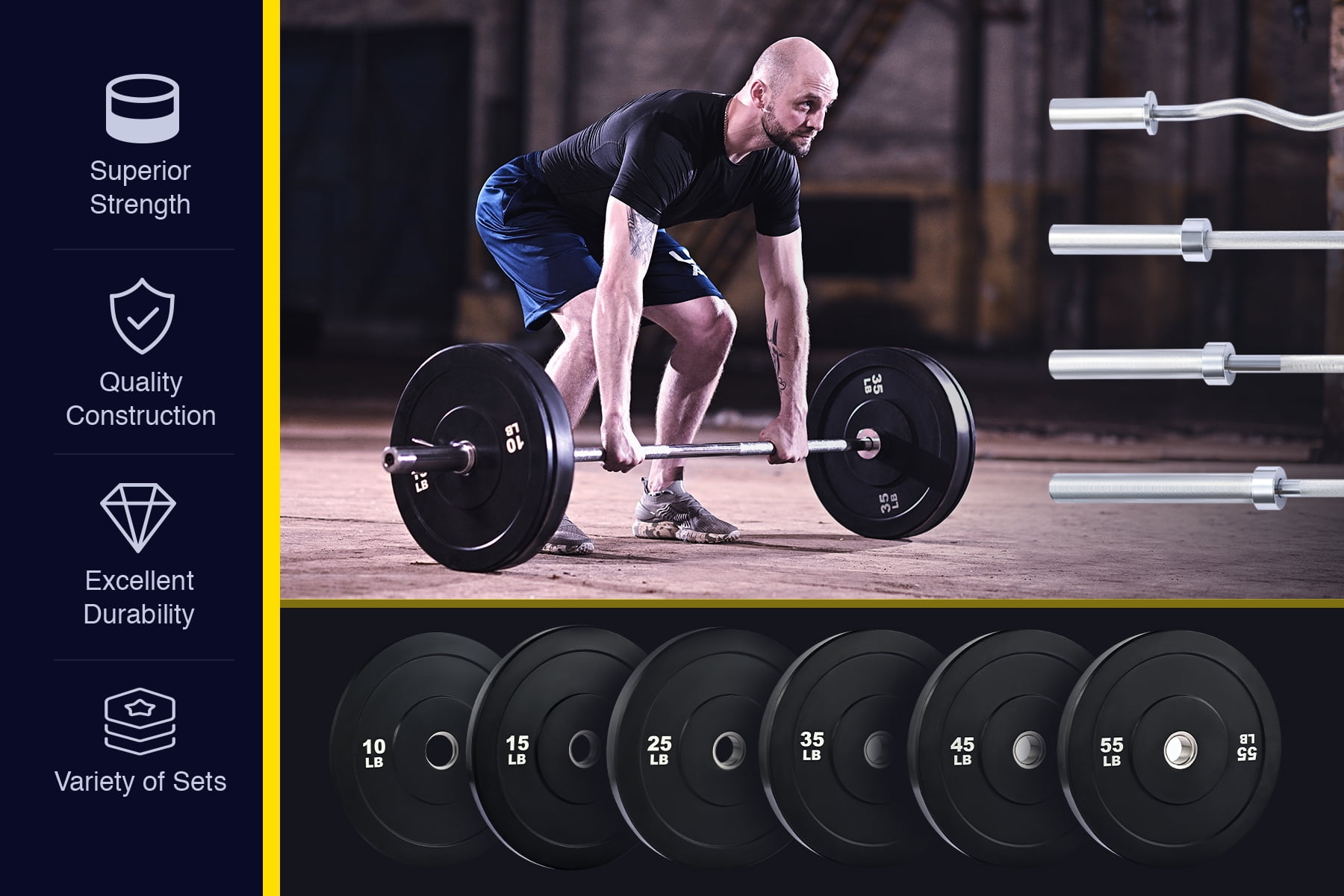 TWIN 35LB PLATES: Our bumper plate set includes two 35 pound weights with 17.7″ by 2.2″ IWF dimensions and 2 inch center holes to mix and match with standard strength training equipment, including Olympic barbells, hex bars, dumbbells, sleds, and racks LOW BOUNCE RUBBER: Our premium virgin rubber plates have 80-durometer density with a far quieter drop than clanging iron or steel competition; simultaneously, their softer sides and minimal bounce protect your flooring from damage and prevent accidental injury, especially when exercising with others STAINLESS STEEL INSERTS: Each 35 lb. weight plate has a stainless steel insert to offer a smooth snug fit for standard 2″ Olympic equipment, providing years more service than iron and bronze alternatives whether used with weight benches or for straight power lifting and floor work CLEAR WEIGHT MARKING: Keeping organization and change-outs quick and easy, each bumper plate is clearly marked with high-contrast white weight markings in pounds, easily read from across the room VERSATILE USE: Get started sweating and lifting your way to greatness as you punish these plates with a wide range of exercises from bench presses, squats, and deadlifts to pylos, twists, and halos whether in your home or school gym or at a professional training center Want a healthier body and better physique but find it difficult to make time for the gym? This set of two 35 pound bumper plates is the perfect choice for your home gym! These versatile weight plates are ideal for Olympic barbells, dumbbells, weight sleds, or racks with 2 inch sleeves. Made from high-density virgin rubber, these 17.7 inch plates boast an 80 durometer rating, withstanding repeated drops with minimal noise and exceptional durability, keeping your floors intact and your neighbors happy. Our solid stainless steel inserts offer smooth use for your exercise equipment without scuffing, scratching, or sticking, providing dependable use over the long term. To make change-outs quick and easy, each plate is clearly marked with clear high-contrast weight markings in pounds. Whether you’re just starting out or an experienced lifter, these low-bounce bumpers are just what you’re looking for! Get this helpful home gym gear today and get started burning more calories, building your endurance, and reshaping your body better than ever! Specifications Material: Virgin Rubber, Stainless Steel Color: Black Diameter: 17.7 in. (45 cm) ea. Thickness: 2.2 in. (5.7 cm) ea. Insert Diameter: 2 in. (5 cm) ea. Net Weight: 35 lb. (15.9 kg) ea. Package List 2 x Bumper Plates