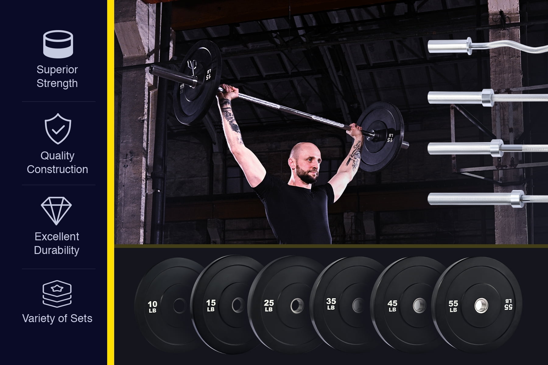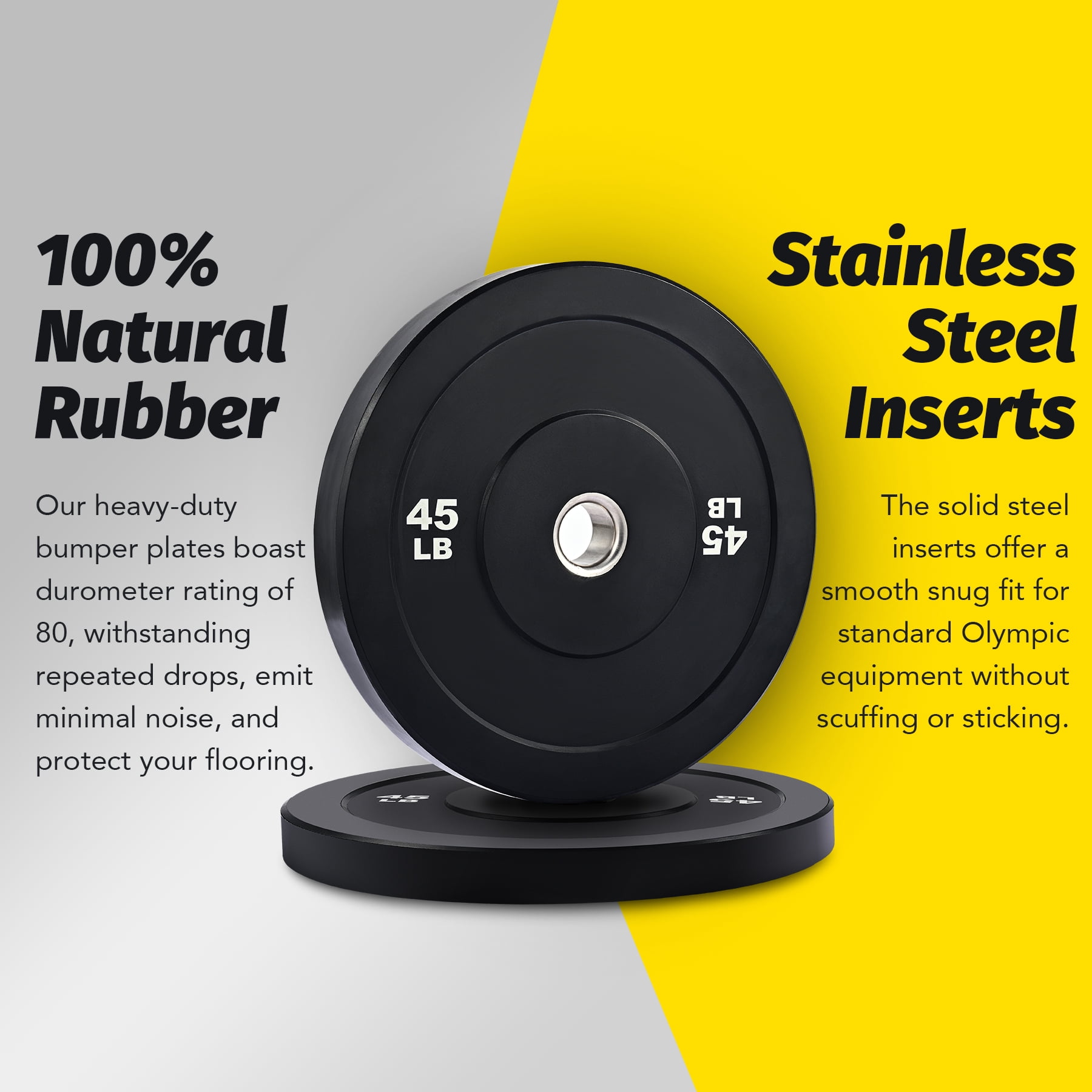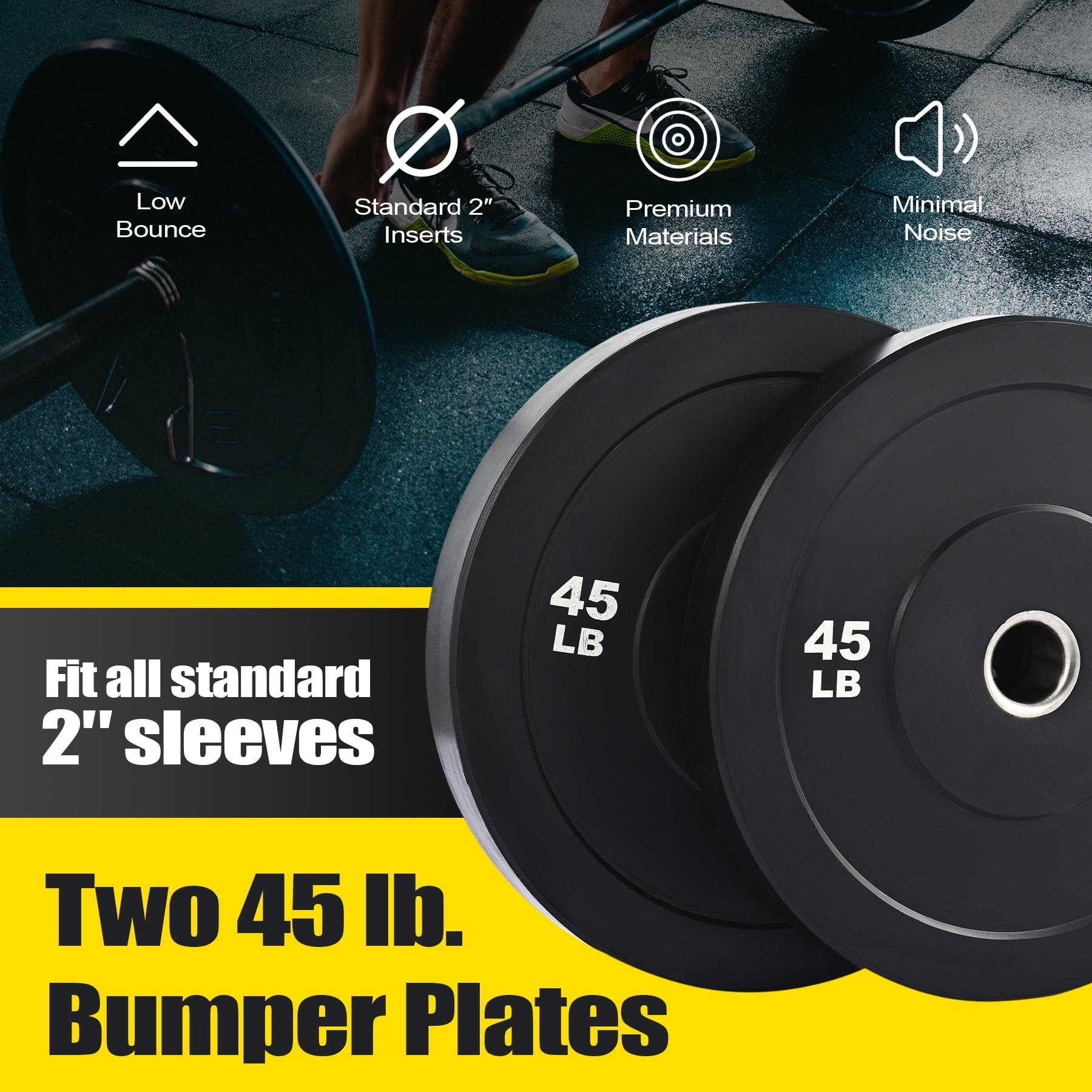 TWIN 45LB PLATES: Our bumper plate set includes two 45 pound weights with 17.7″ by 2.9″ IWF dimensions and 2 inch center holes to mix and match with standard strength training equipment, including Olympic barbells, hex bars, dumbbells, sleds, and racks LOW BOUNCE RUBBER: Our premium virgin rubber plates have 80-durometer density with a far quieter drop than clanging iron or steel competition; simultaneously, their softer sides and minimal bounce protect your flooring from damage and prevent accidental injury, especially when exercising with others STAINLESS STEEL INSERTS: Each 45 lb. weight plate has a stainless steel insert to offer a smooth snug fit for standard 2″ Olympic equipment, providing years more service than iron and bronze alternatives whether used with weight benches or for straight power lifting and floor work CLEAR WEIGHT MARKING: Keeping organization and change-outs quick and easy, each bumper plate is clearly marked with high-contrast white weight markings in pounds, easily read from across the room VERSATILE USE: Get started sweating and lifting your way to greatness as you punish these plates with a wide range of exercises from bench presses, squats, and deadlifts to pylos, twists, and halos whether in your home or school gym or at a professional training center Want a healthier body and better physique but find it difficult to make time for the gym? This set of two 45 pound bumper plates is the perfect choice for your home gym! These versatile weight plates are ideal for Olympic barbells, dumbbells, weight sleds, or racks with 2 inch sleeves. Made from high-density virgin rubber, these 17.7 inch plates boast an 80 durometer rating, withstanding repeated drops with minimal noise and exceptional durability, keeping your floors intact and your neighbors happy. Our solid stainless steel inserts offer smooth use for your exercise equipment without scuffing, scratching, or sticking, providing dependable use over the long term. To make change-outs quick and easy, each plate is clearly marked with clear high-contrast weight markings in pounds. Whether you’re just starting out or an experienced lifter, these low-bounce bumpers are just what you’re looking for! Get this helpful home gym gear today and get started burning more calories, building your endurance, and reshaping your body better than ever! Specifications Material: Virgin Rubber, Stainless Steel Color: Black Diameter: 17.7 in. (45 cm) ea. Thickness: 2.9 in. (7.3 cm) ea. Insert Diameter: 2 in. (5 cm) ea. Net Weight: 45 lb. (20.4 kg) ea. Package List 2 x Bumper Plates