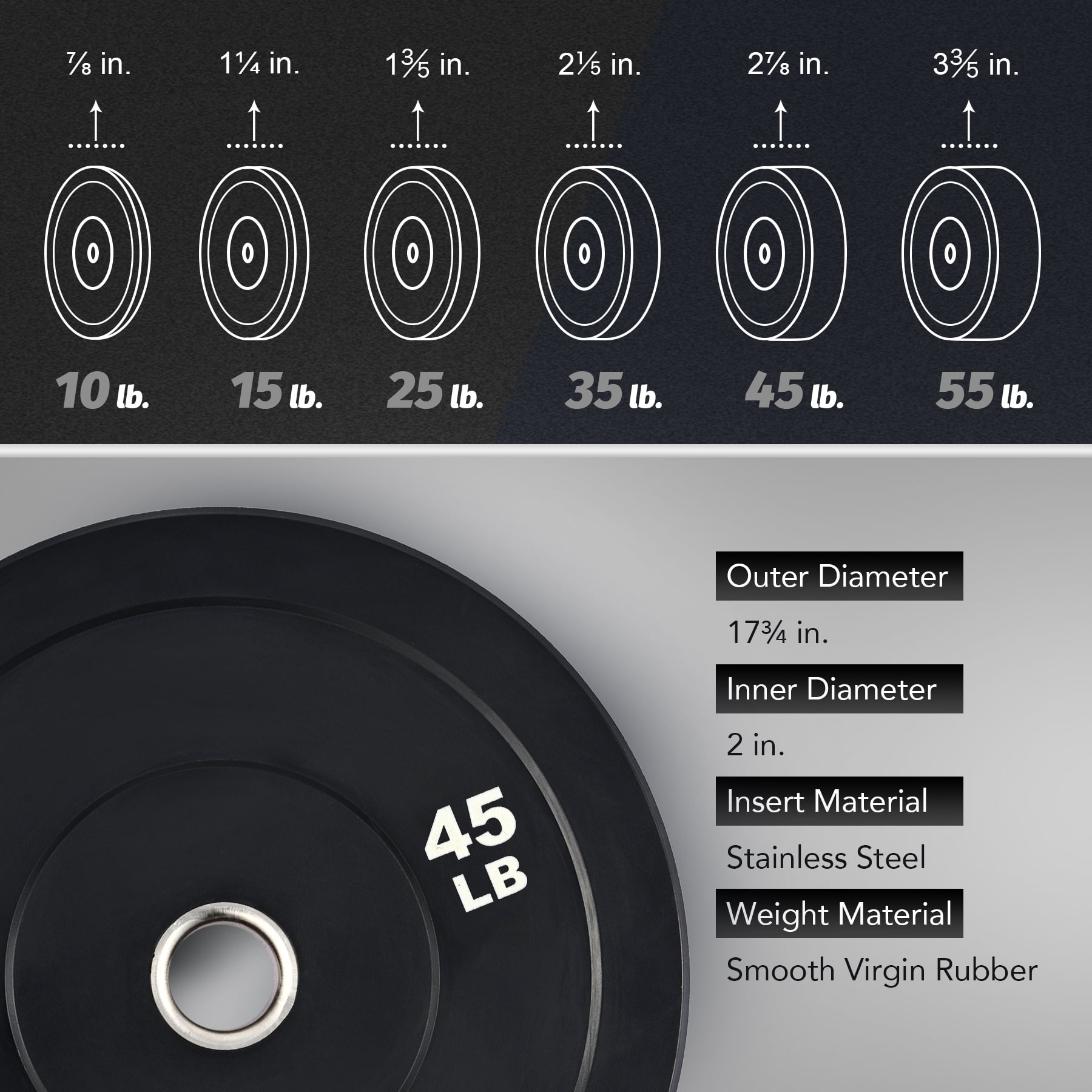 IWF standard 17.7″x2.9″ weight plates with Olympic 2″ center holes High-density virgin rubber construction with stainless steel inserts Enjoy minimal bounce & noise and maximum results from lifts, squats, more