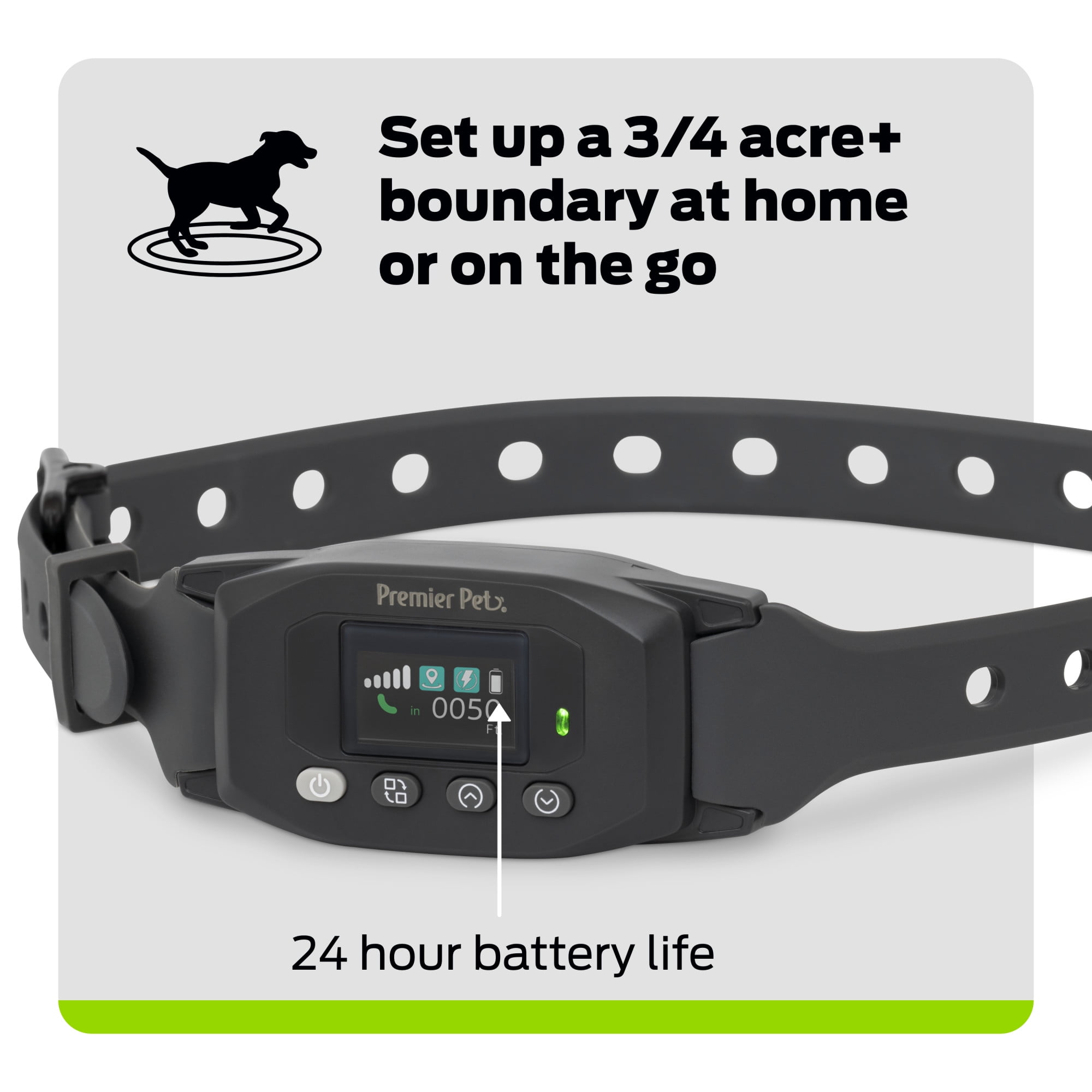 GPS-powered circular wireless boundary keeps your dog safe at home or on the go Quick, easy setup directly on collar’s LCD screen with no subscriptions or apps Adjustable coverage for any yard size larger than 3/4 acres Correction-free re-entry if dog passes the boundary 3 settings: Tone & vibration, small-dog static, large-dog static Water-resistant, rechargeable collar with up to 24 hours of battery life Fits dogs with neck sizes between 12 and 25 in., designed for dogs 20 lbs and up