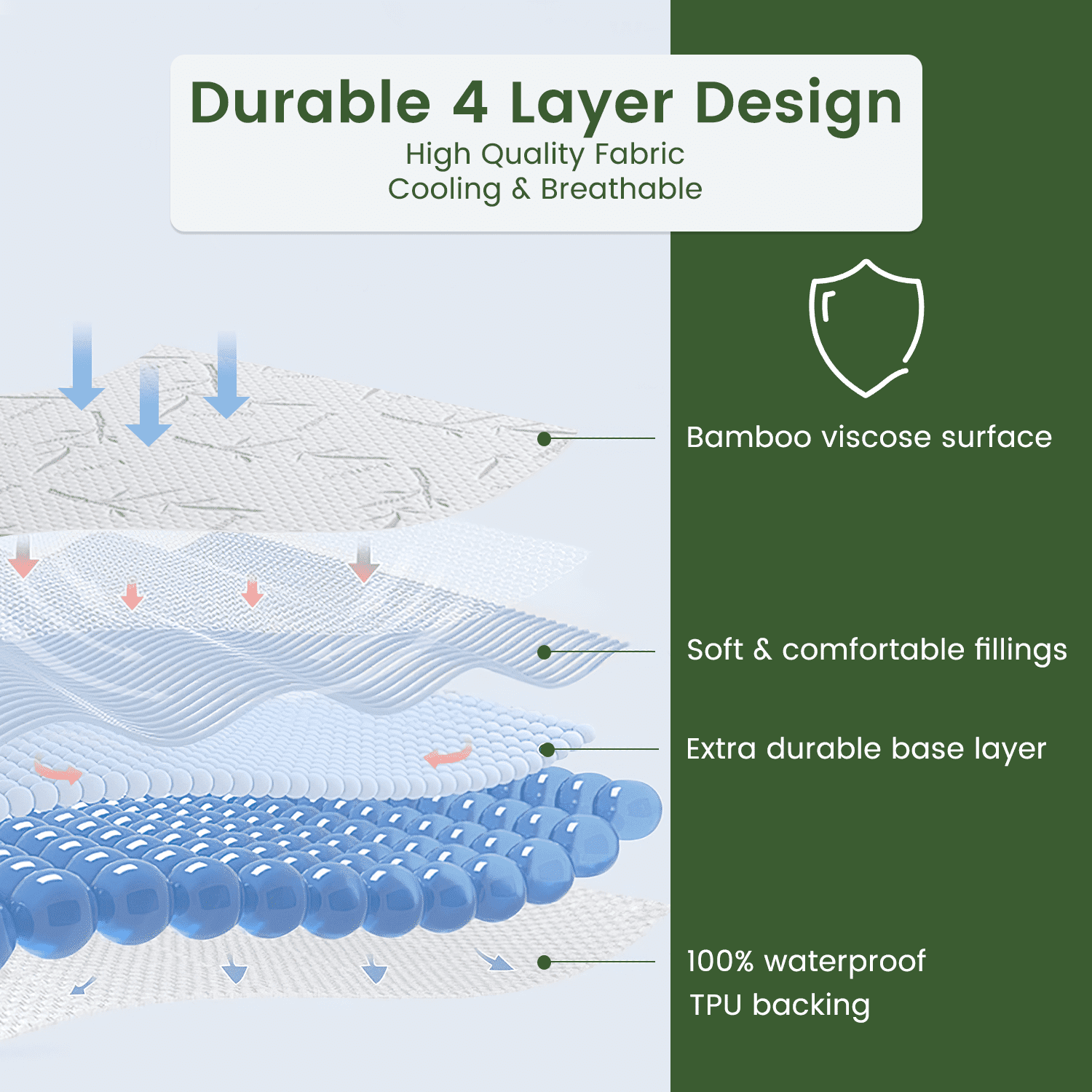 The surface layer of this mattress cover contains bamboo rayon. Itself not only has good breathability, instant water absorption, fast drying and strong wear resistance, but also has the ability to naturally prevent odors without irritating the skin or causing allergic reactions. The highly-flexible elastics of the mattress protector fits perfectly around the bed without looking bulky and its stretchy skirt can extend from 6”up to 21”. Our deep pockets are designed to fit most types of mattresses, including latex bed, innerspring bed, dorm bed and memory foam mattress bed. This Queen mattress protector is made of noiseless bamboo rayon, soft and skin-friendly, which can not only block the noise generated when turning over, but also gives you the comfort of warmth in winter and coolness in summer, allowing you to enjoy a pleasant and quiet feeling.