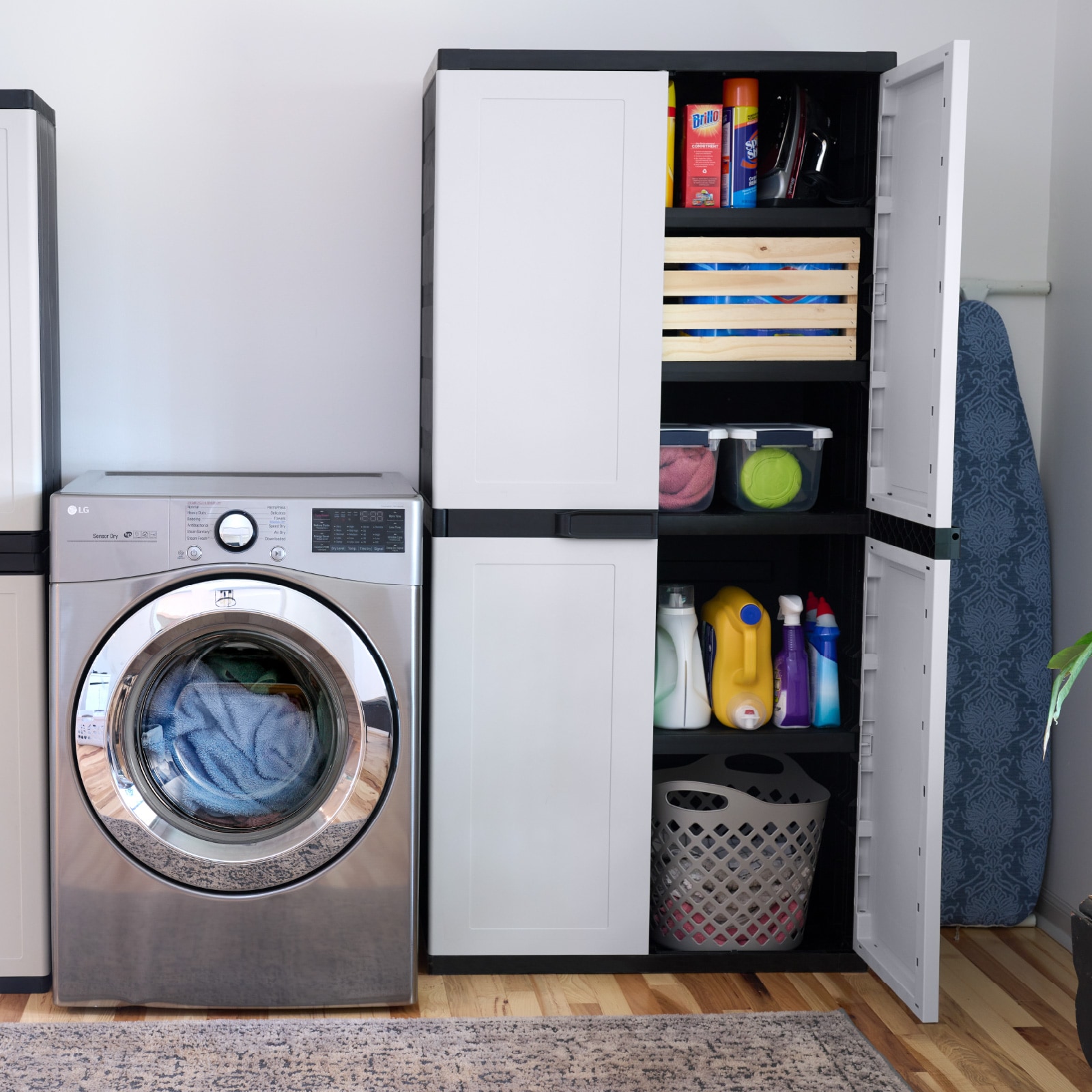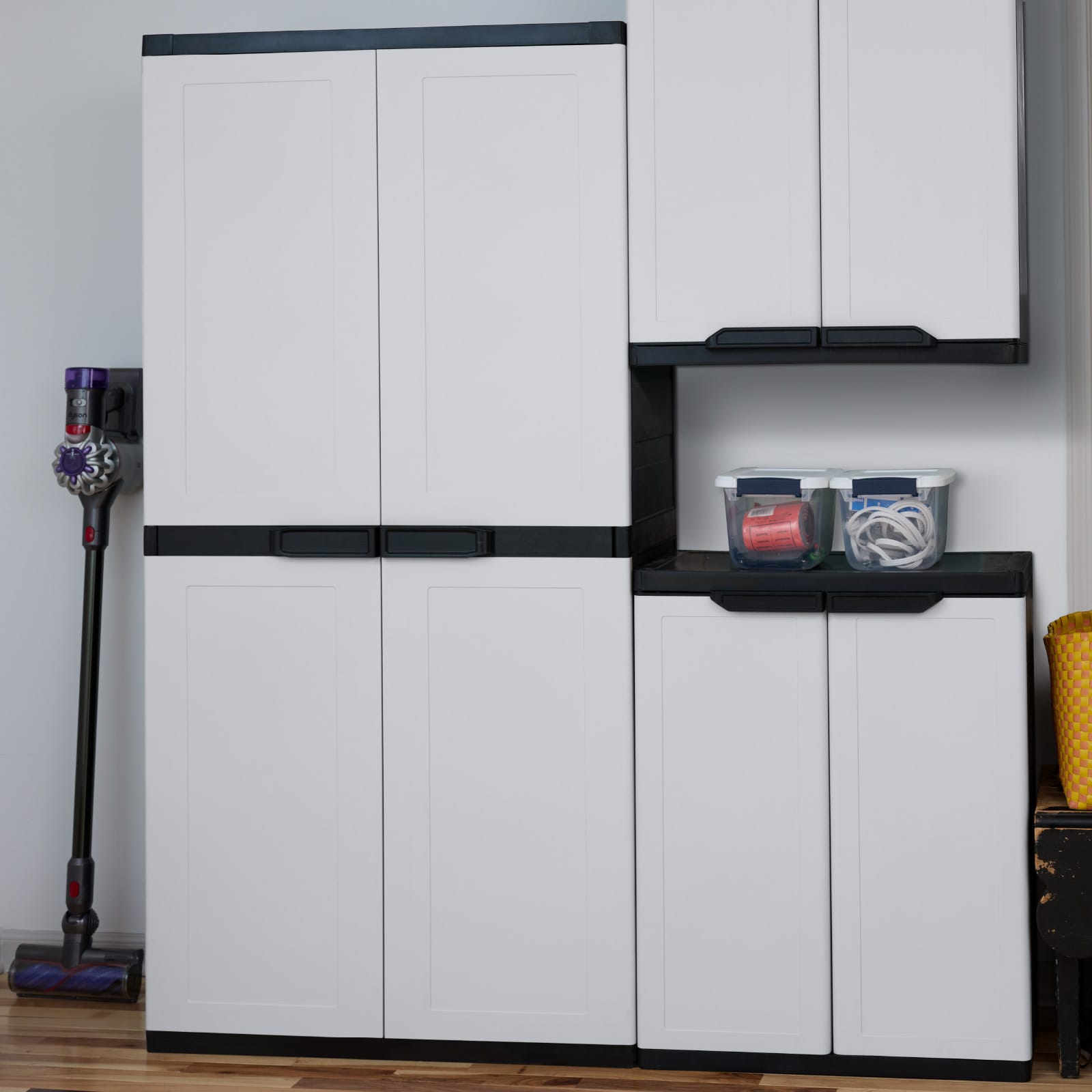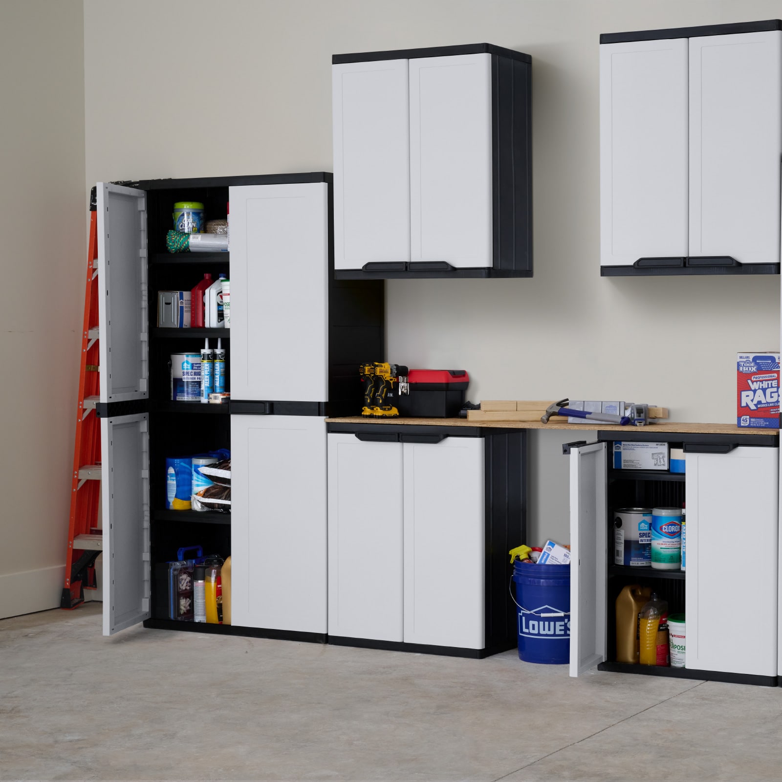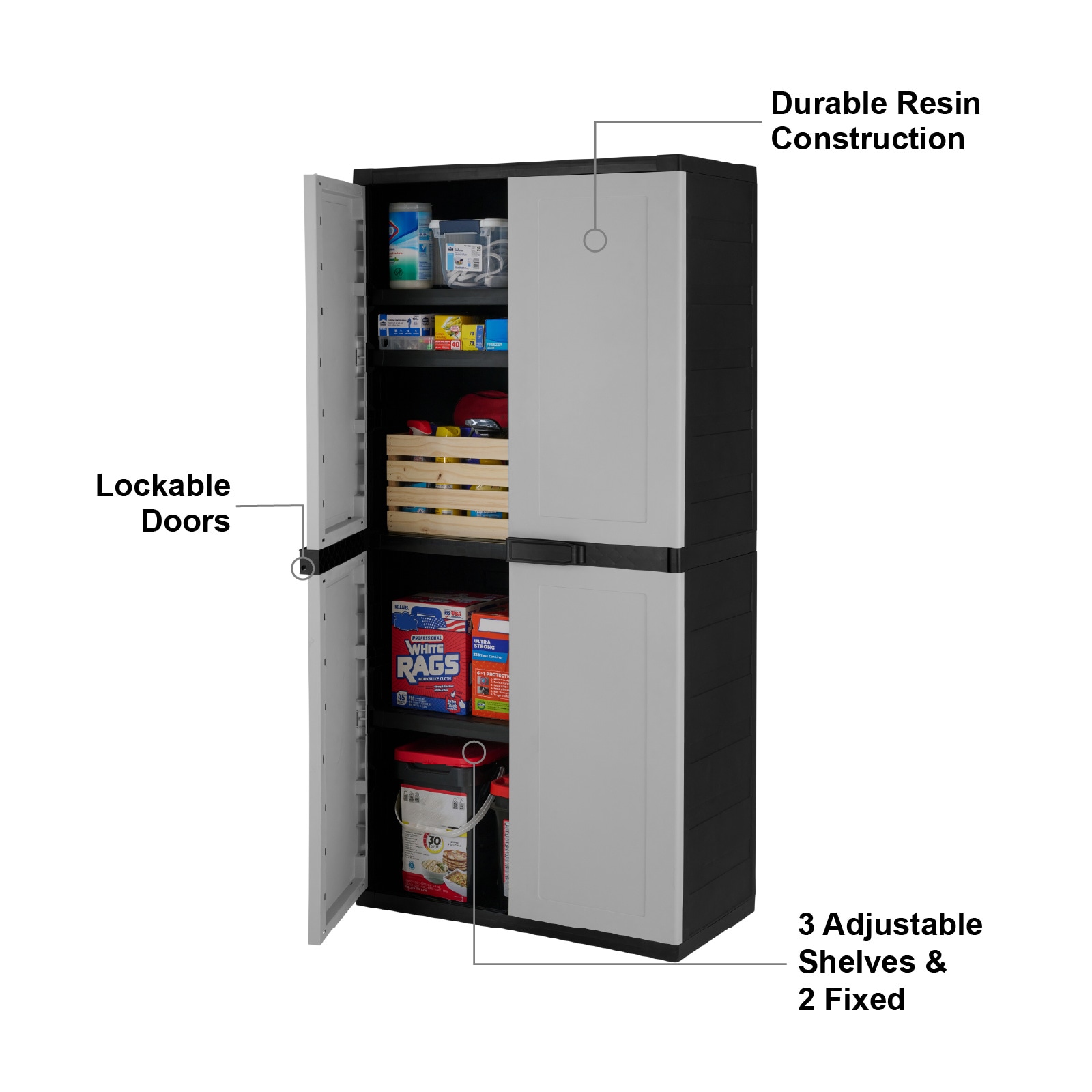 Discover the benefits of efficient storage with the Project Source Premium One freestanding resin garage cabinet. This rugged garage cabinet is here to save the day when it comes to organization. Its durable, weather-resistant construction protects your items from dust, moisture, and other elements, ensuring they stay safe and dry. Made from heavy-duty resin, it stands up to rust, scratches, dents, and peeling, ensuring it lasts for years to come. Turn any messy garage, laundry area, basement, or storage closet into a neat and practical space. Upgrade your storage solutions and take charge with this adaptable cabinet. It features 3 adjustable shelves and 2 fixed shelves, each capable of holding up to 75 lbs. This utility cabinet is designed to hold supplies of all shapes and sizes, allowing you to neatly store gardening tools, paint supplies, and automotive equipment across its four shelves. The tall storage cabinet offers ample storage space and fits well in almost any location. Plus, the lockable doors offer added security for your important belongings. You can put it together in just a few minutes using only a screwdriver.