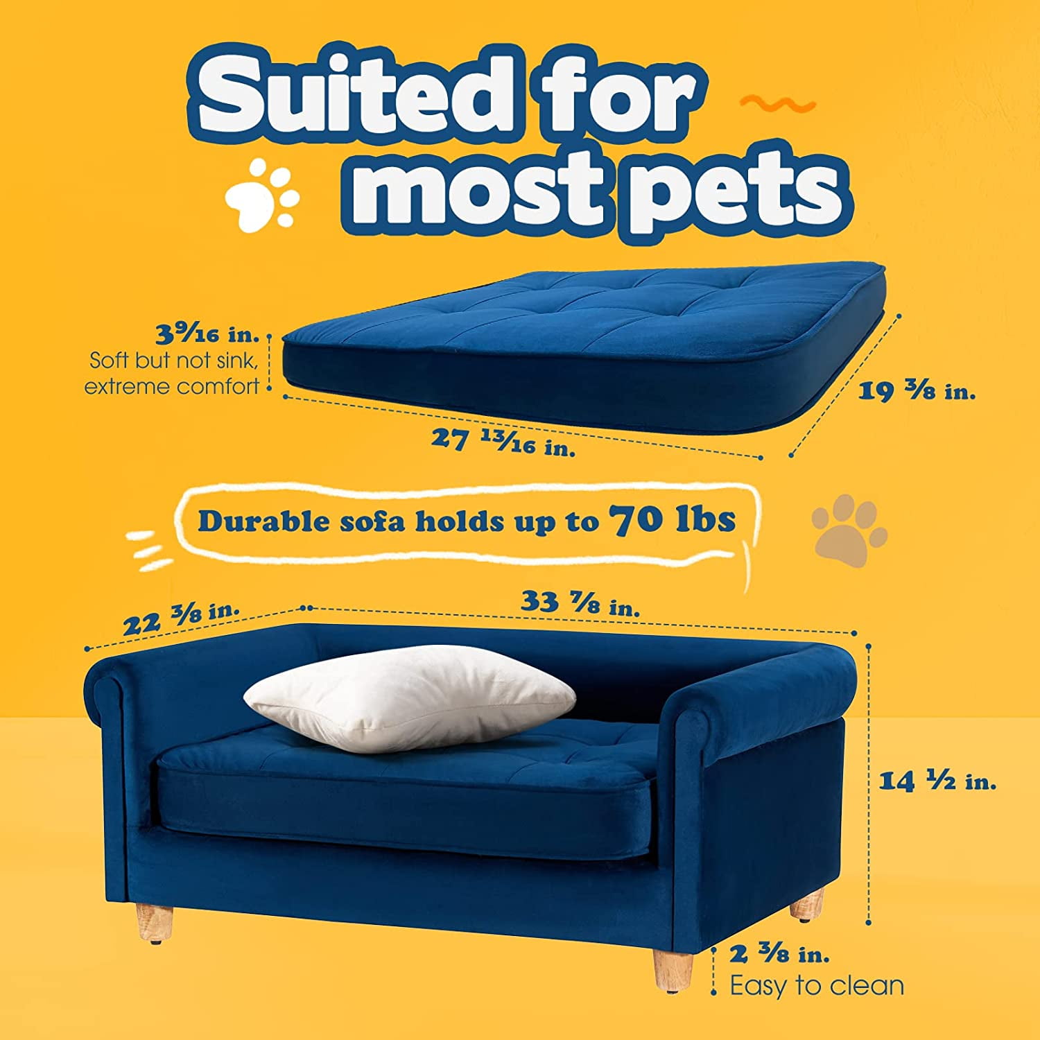 PET COUCH THAT CARES FOR YOUR PET’S HEALTH: Our soft upholstery pet sofa bed cushion with PE foam fully covered by cotton, supports dogs’ and cats’ joints and provides them with good sleep; The pet sofa cushion’s cover keeps your pet’s favorite spot clean and fresh. A COZY CUDDLE SPACE YOUR PET DESERVES: Just like us, our pet needs its own space to cuddle; With our pet bed to call its own, your babies can stay comfy and warm, and your furniture is protected from damage and dirt; Our cutie bone pillow encourages your fur friends to quickly settle into their new dog bed or cat bed. AIRY WOVEN FABRIC TO KEEP PETS COOL: The woven fabric is durable and airy, amazing textile to keep your pet cool in the summer; Our elastic cover also withstands fur, easier to vacuum them out quickly and thoroughly, keeping your pet couch clean. HEAVY DUTY PET SOFA THAT HOLDS UP TO 70 POUNDS: The MFC and MDF wood frame combination promotes more heavy duty pet furniture that easily handles up to 70 pounds; Its ergonomic design suits multiple sizes of pets. ERGONOMIC DESIGN SUITS MULTIPLE SIZES OF PETS: Our pet sofa accommodates all sleeping positions for pets of various sizes; Providing great comfort when lying on their stomach, side, or back.