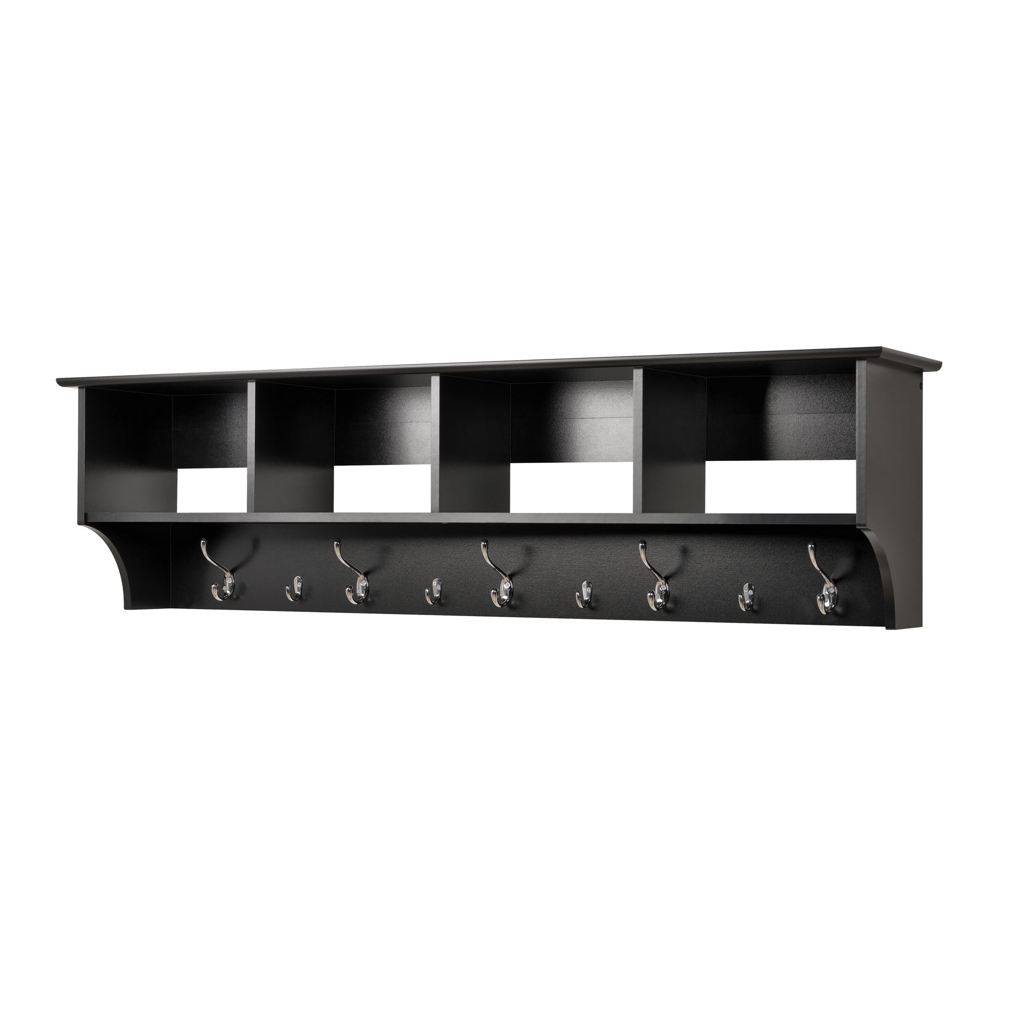 Finished in durable deep black laminate Easy to install two-piece hanging rail system included Constructed from non-toxic, laminated composite woods Ships Ready to Assemble, includes an instruction booklet for easy assembly Assembled Dimensions: 60 in. W x 16.5 in. H x 11.5 in. D Internal Dimensions: 13.5 in. W x 8.75 in. H x 10 in. D (each cubbie) Manufactured to meet all safety standards