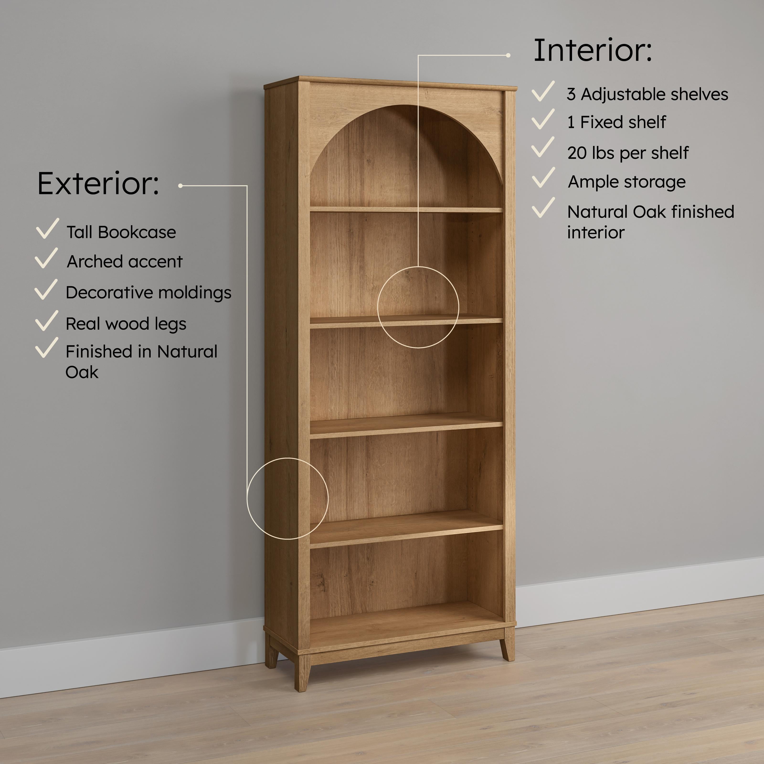 Prepac Ark 78″ Tall 5-Tier Arched Bookcase in Natural Oak, Modern Storage Accent Bookshelf with 3 Adjustable Shelves for Home, Office, Living Room, Bedroom