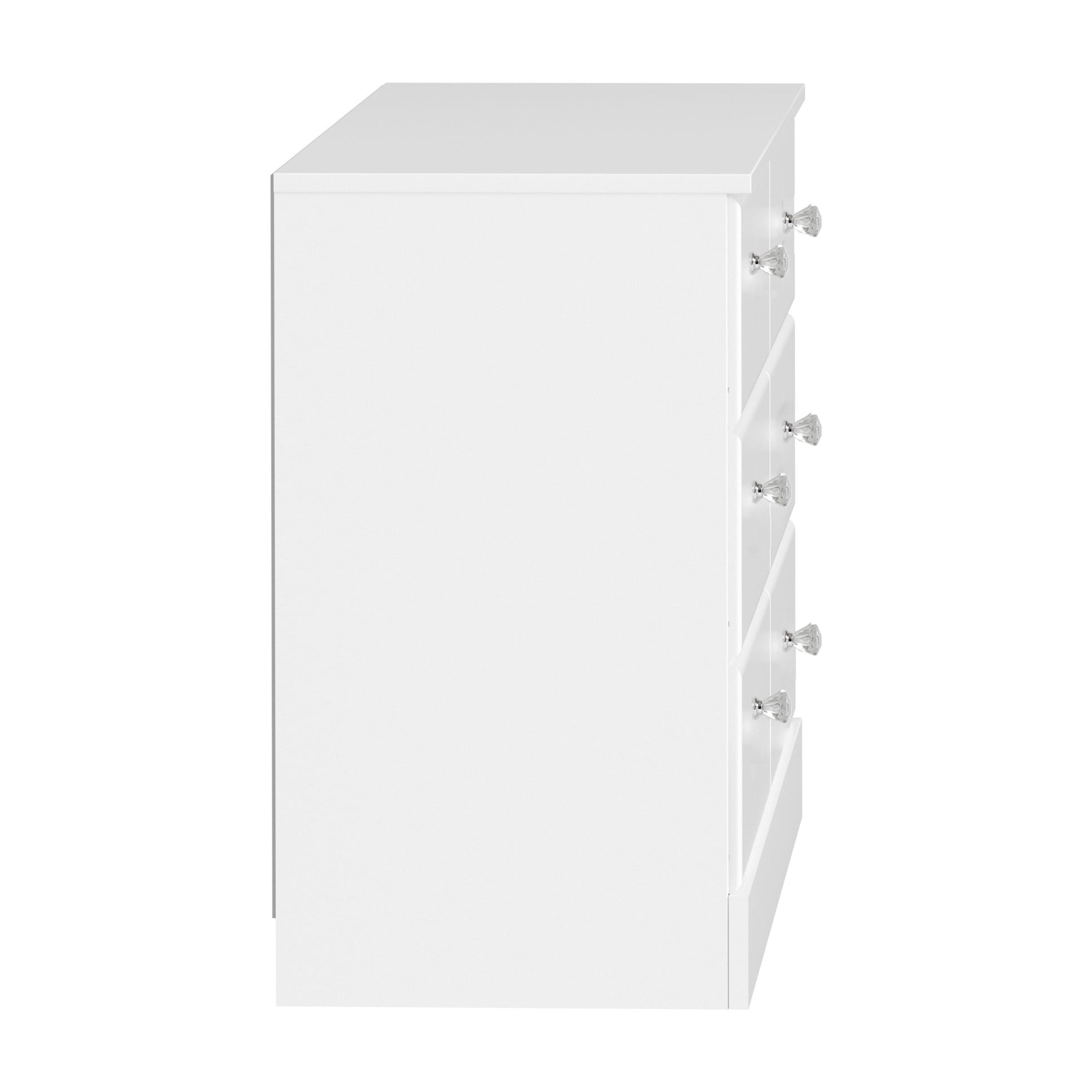 6 drawer dresser with profiled top, clean lines, and profiled drawer fronts Pristine white laminate finish and crystal acrylic knobs Spacious smooth rolling drawers with built-in safety stops Space-saving clothes organizer for bedrooms, closets, living rooms, or entryways Flat top can be used as a TV stand or to display lamps, pictures, and more Made from non-toxic, CARB-2 compliant laminated composite wood and solid pine Easy to assemble in 2 hours or less Measurements: Dresser – 15.5″ D x 26.85″ H x 47.5″ W; Each drawer – 13.5″ x 20.5″ x 4.5″