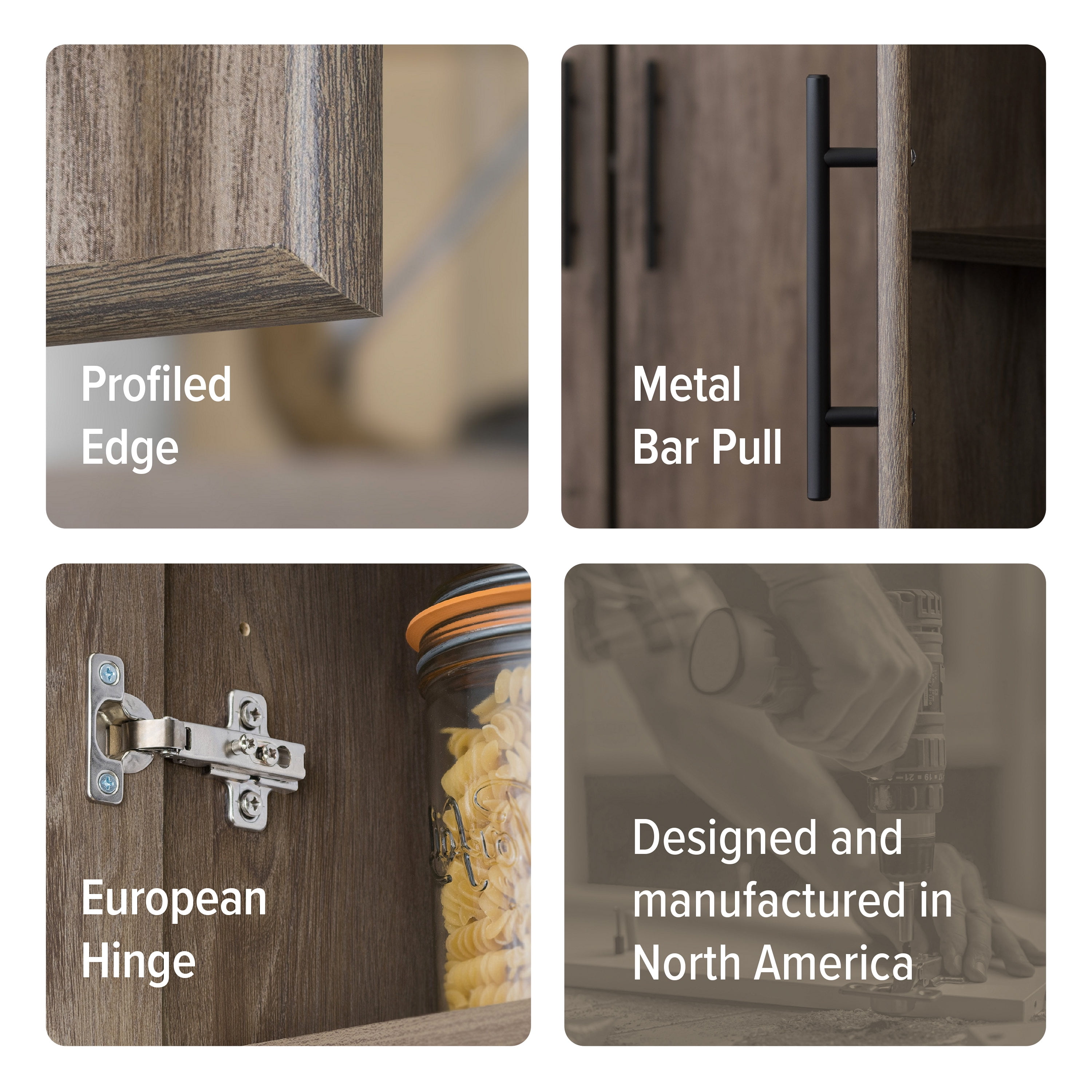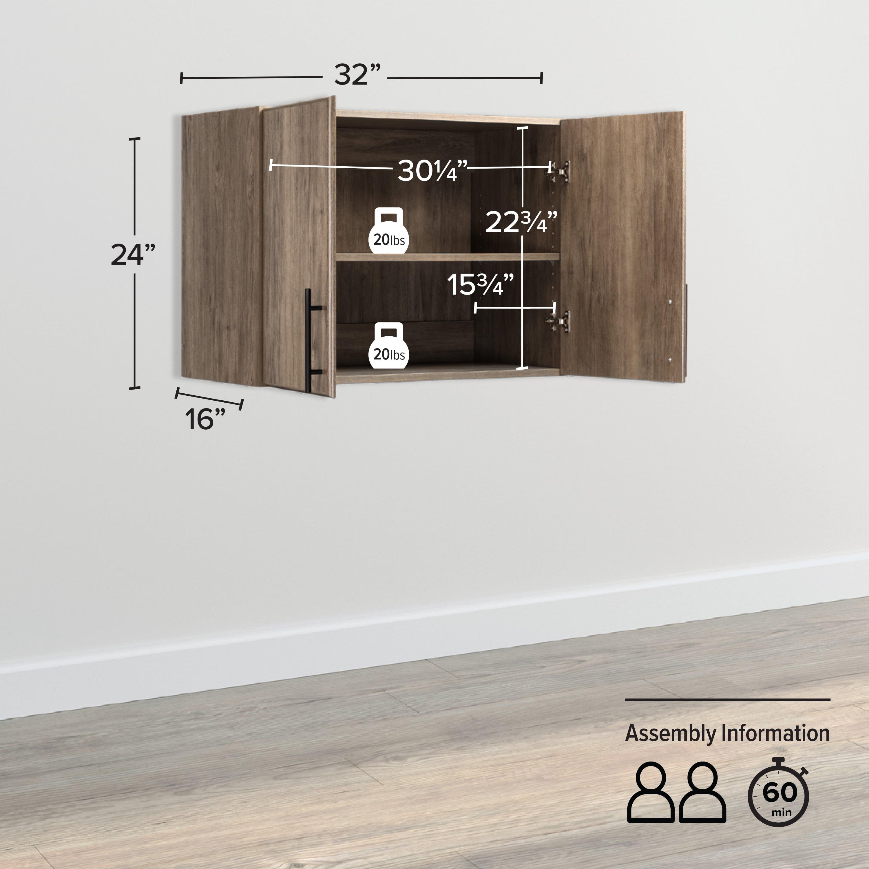 34% more storage space than standard storage cabinets Maximize space in garages, laundry rooms, kitchens, or offices Can be mounted directly to the wall or secured on top of other Elite cabinets 2 soft-edge doors on adjustable 6-way European-style hinges 1 adjustable shelf Drifted gray laminate finish with matte black metal handles Ships flat-packed and ready-to-assemble with instructional booklet Constructed from non-toxic, CARB-2 compliant, laminated composite woods External measurements: 16″ D x 32″ W x 24″ H Internal measurements: 15.75″ D x 30.25″ W x 22.5″ H