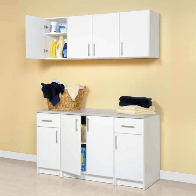 The elite 32 in base cabinet is the perfect addition to your laundry room, workshop or garage. The 1 in thick grey melamine countertop provides a durable work surface that will last through all your projects. With one adjustable shelf, this cabinet will accommodate anything you need to store in it. Combine it with other pieces in the elite collection for a customized workspace.