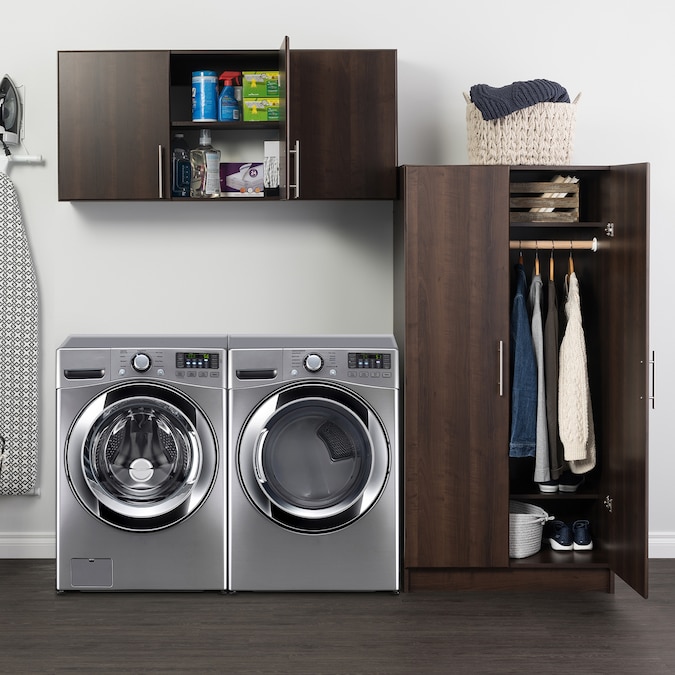 Introducing the Prepac Elite Wall Mounted Storage Cabinet, an essential addition to your home’s storage solutions. This compact and functional overhead storage cabinet measuring 54″W x 24″H x 12″D is equipped with three soft-edged doors that pivot on adjustable, six-way European style hinges and two adaptable shelves. It boasts a neat, clean look with a espresso laminate finish complemented by chic satin nickel-finished metal handles. This storage cabinet with doors and shelves is custom-fit to be mounted above your standard-sized washer and dryer, enabling wall cabinets for laundry room storage. The doors open conveniently to either the right or left, depending on your room configuration, providing flexible accessibility. Reliably manufactured in North America, this wall cabinet is crafted with durable, CARB-2 compliant laminated composite woods, ensuring its quality and non-toxicity. The cabinet ships flat-packed, including an instructional booklet, allowing for ready assembly upon delivery. This compact overhead cabinet’s external dimensions are 54″D x 24″W x 12″H, while the internal dimensions are 34.75″D x 22.5″W x 11.75″H, making it a suitable storage unit for your garage or as an above toilet storage cabinet in your bathroom. Whether it be as a bathroom wall cabinet, bathroom storage cabinet, or for your kitchen and garage storage, this wall-mounted cabinet with its functional doors and shelves can be fitted to other wall cabinets for versatile storage. With the Prepac Elite, optimize your bathroom cabinet storage, kitchen storage, and garage storage. The unit is not just limited to laundry cabinets and storage, but is also suitable as salon cabinets and storage. Add versatile storage capacity with this pantry cabinet, transforming clutter into organized spaces.