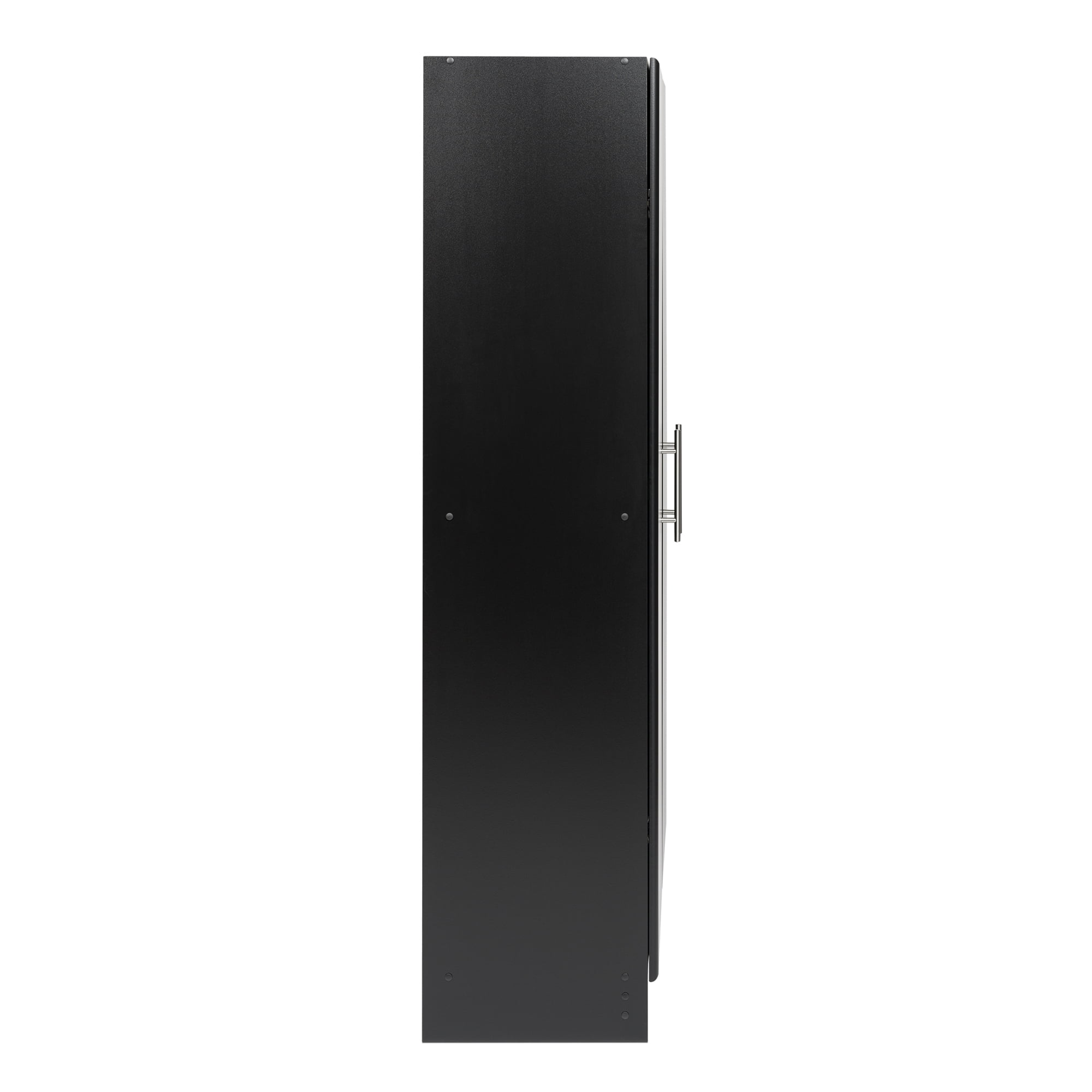 34% more storage space than standard storage cabinets Great for garage, laundry room, kitchen, bathroom, office, or workshop storage Features 1 fixed shelf and 2 adjustable shelves Clean lines and soft-edge doors on adjustable 6-way European-style hinges Sleek black laminate finish with elegant brushed metal handles Constructed from non-toxic, CARB-2 compliant, laminated composite woods Ships ready-to-assemble with an easy instructional booklet Measures 24″ W x 65″ H x 16″ D; Each shelf holds up to 20 lbs.