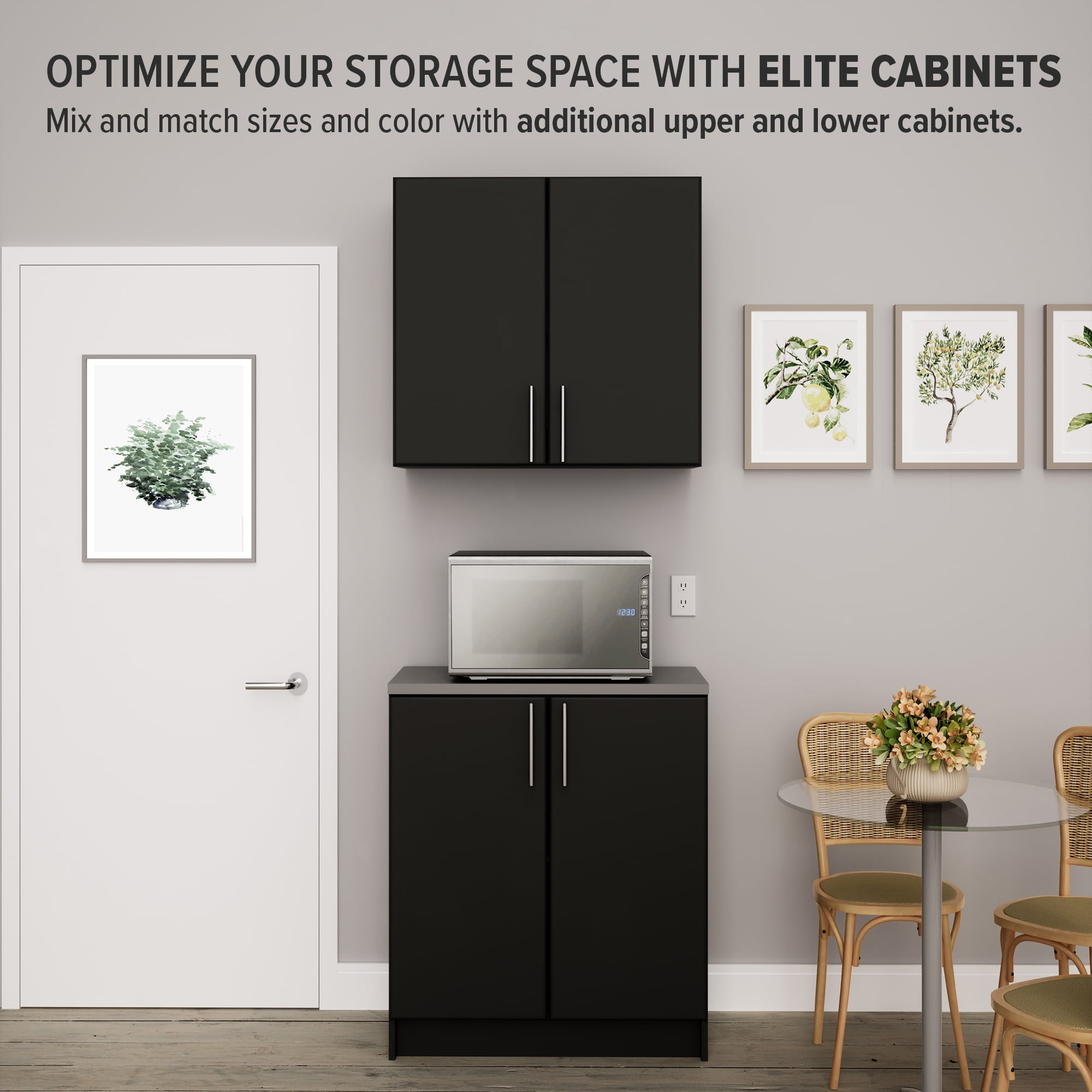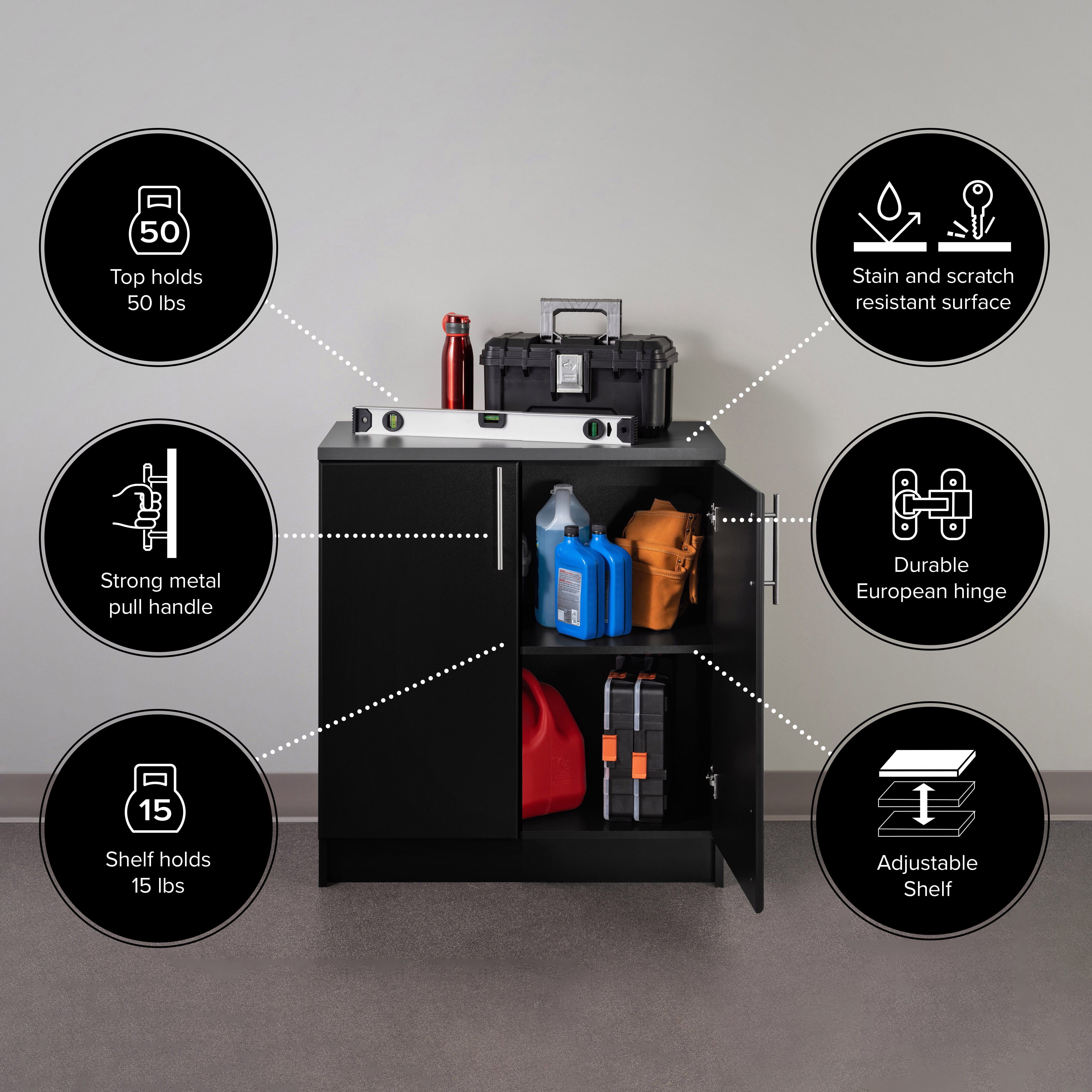 The Prepac Elite Home Storage Black Base Cabinet with Melamine Countertop is the perfect addition to your laundry room, workshop or garage. The 1 in. thick grey melamine countertop provides a durable work surface that will last through all your projects. With one adjustable shelf, this cabinet will accommodate anything you need to store in it. Combine it with other pieces in the Elite Collection for a customized workspace.