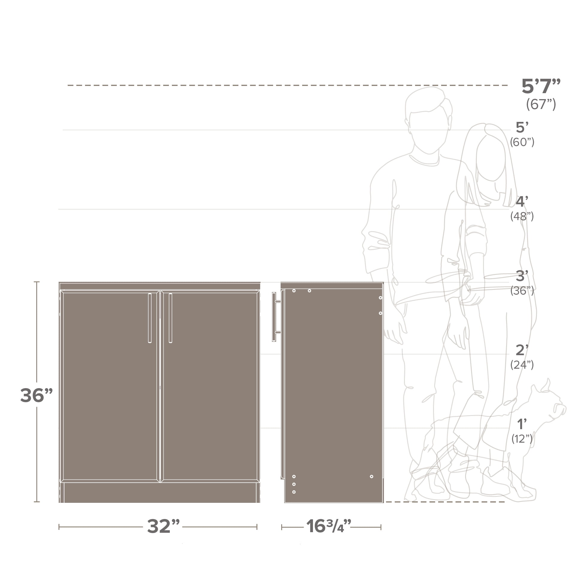 Stylish brushed metal handles Doors feature high quality, European-style 6-way adjustable hinges 1 in. thick worktop with a durable melamine surface 1 adjustable shelf MDF doors with profiled (rounded) edges add a level of sophistication Assembled Dimensions: 32 in W x 35.75 in H x 18 in D Wardrobe Side: 19 in W x 42.5 in H x 18.75 in D Weight Capacity: 50lbs top base, 15 lbs per shelf Constructed from CARB-2 compliant, non-toxic, laminated composite woods with a sturdy MDF backer Ships Ready to Assemble, includes an instruction booklet for easy assembly Manufactured in North America and meets all safety standards