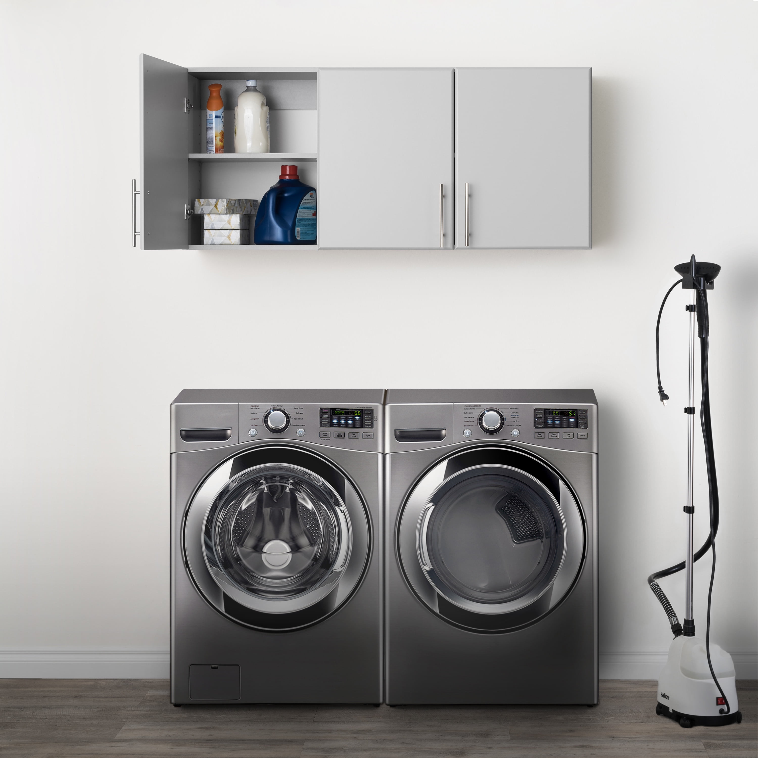 Introducing the Prepac Elite Wall Mounted Storage Cabinet, an essential addition to your home’s storage solutions. This compact and functional overhead storage cabinet measuring 54″W x 24″H x 12″D is equipped with three soft-edged doors that pivot on adjustable, six-way European style hinges and two adaptable shelves. It boasts a neat, clean look with a light gray laminate finish complemented by chic satin nickel-finished metal handles. This storage cabinet with doors and shelves is custom-fit to be mounted above your standard-sized washer and dryer, enabling wall cabinets for laundry room storage. The doors open conveniently to either the right or left, depending on your room configuration, providing flexible accessibility. Reliably manufactured in North America, this wall cabinet is crafted with durable, CARB-2 compliant laminated composite woods, ensuring its quality and non-toxicity. The cabinet ships flat-packed, including an instructional booklet, allowing for ready assembly upon delivery. This compact overhead cabinet’s external dimensions are 54″D x 24″W x 12″H, while the internal dimensions are 34.75″D x 22.5″W x 11.75″H, making it a suitable storage unit for your garage or as an above toilet storage cabinet in your bathroom. Whether it be as a bathroom wall cabinet, bathroom storage cabinet, or for your kitchen and garage storage, this wall-mounted cabinet with its functional doors and shelves can be fitted to other wall cabinets for versatile storage. With the Prepac Elite, optimize your bathroom cabinet storage, kitchen storage, and garage storage. The unit is not just limited to laundry cabinets and storage, but is also suitable as salon cabinets and storage. Add versatile storage capacity with this pantry cabinet, transforming clutter into organized spaces.