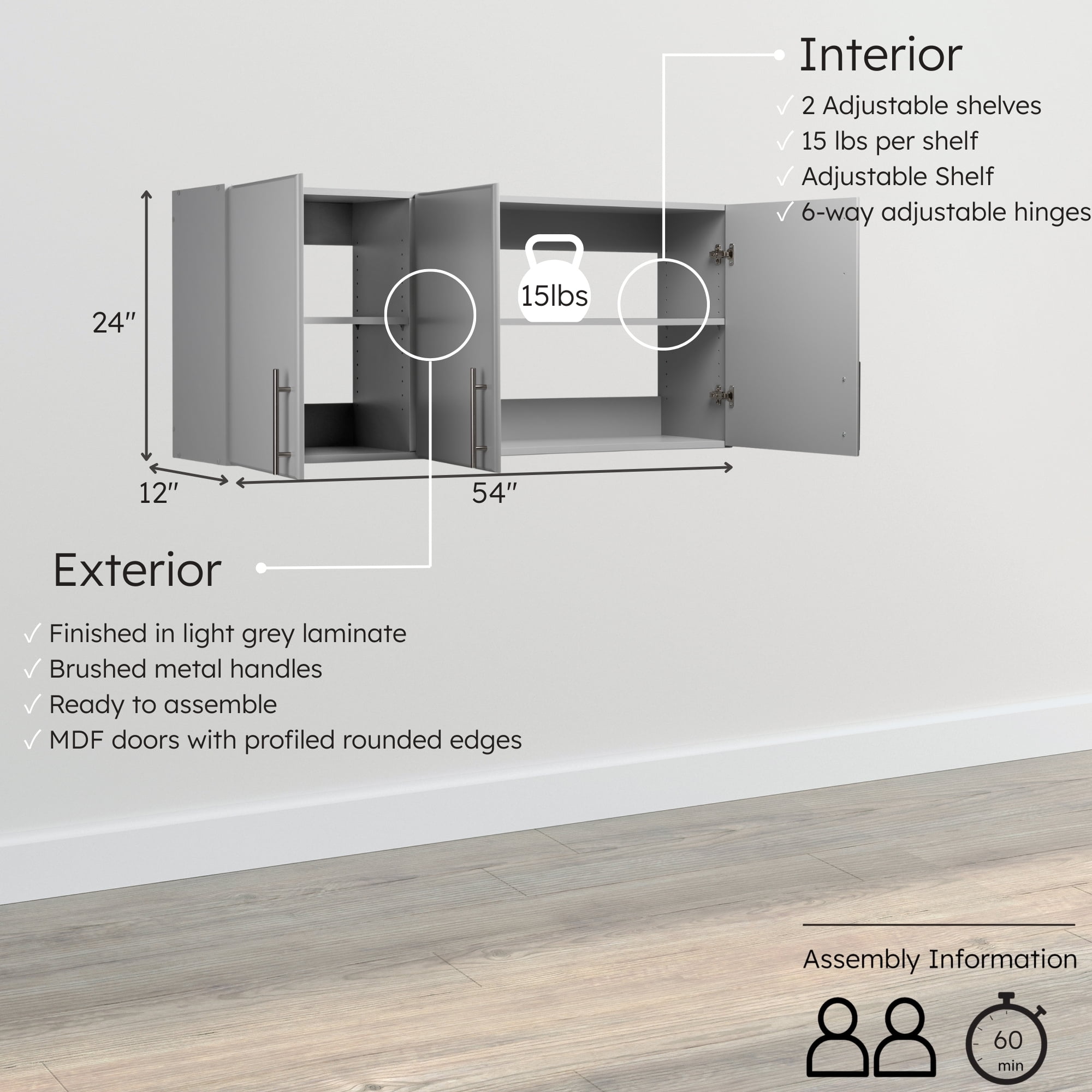 SPACE SAVING: The wall mount cabinet with adjustable shelves can be used as a garage wall cabinet or laundry cabinet, conserving your floor space by utilizing your walls DURABLE CONSTRUCTION: Our robust garage cabinets wall mounted or floating cabinet are made from non-toxic, CARB-2 compliant laminated composite woods, suitable for laundry room cabinets wall mounted or kitchen wall cabinet FLEXIBLE DESIGN: This versatile wall storage cabinet features doors that can open either left or right, making it an ideal choice as a wall cabinets for storage with doors in kitchens, bathrooms, or garages STYLISH LOOK: The light gray bathroom cabinet or kitchen cabinets option is finished in a crisp laminate with satin nickel-finished metal handles, seamlessly fitting into various home decors EASE OF INSTALLATION: This wall mounted storage cabinet or hanging cabinet arrives flat-packed with an instruction booklet, facilitating simple assembly as a wall cabinet storage or over the toilet cabinet