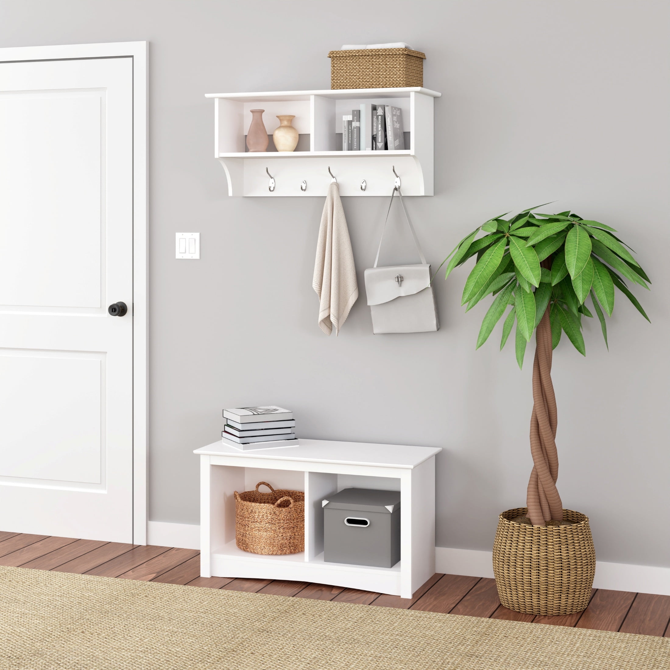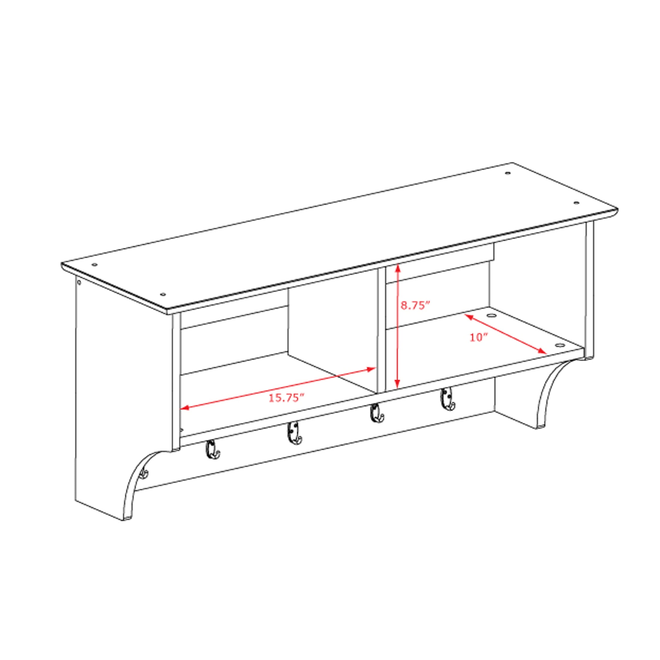 Perfect for townhouses and condos, the 36 in. Wide Hanging Entryway Shelf will help keep your gloves, hats, coats and jackets organized! Suitable for any front hallway, mudroom or home office, it’s two compartments have room for everything from baskets to books. Three large hooks provide sturdy storage for your outerwear, while two smaller hooks are ideal for scarves, purses and bags. Install it easily with our innovative hanging rail system.
