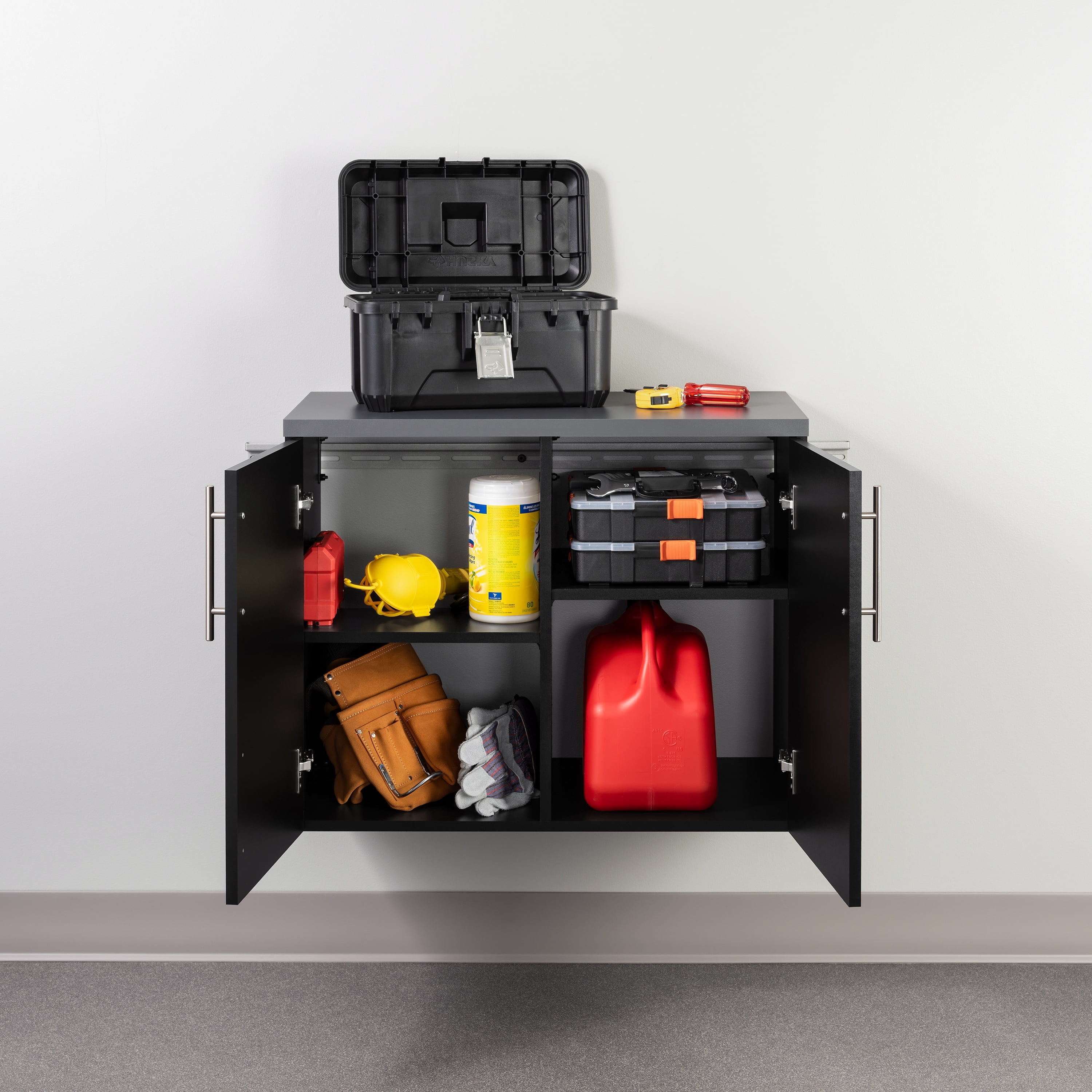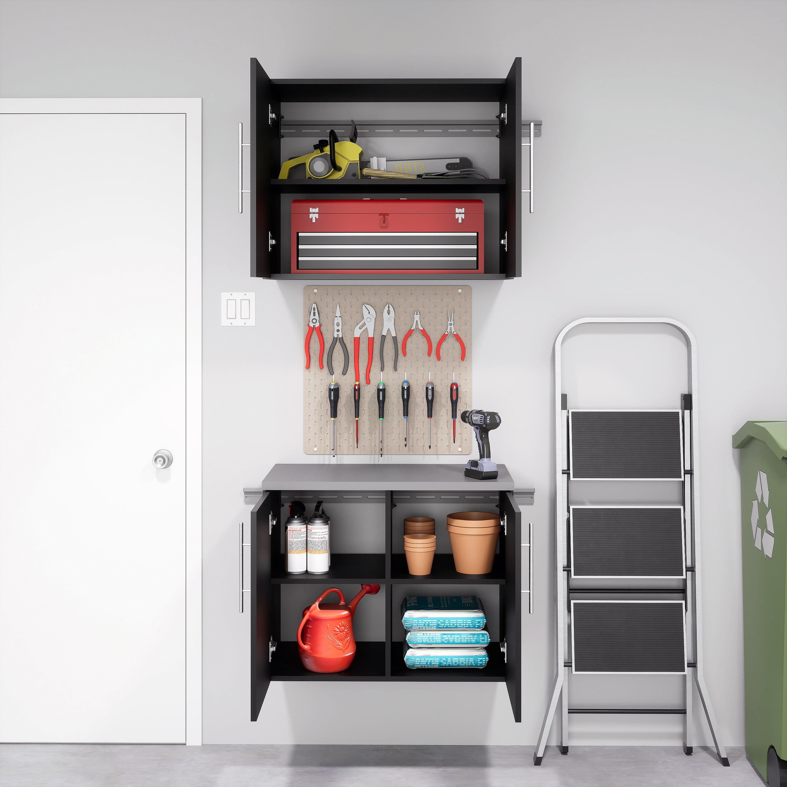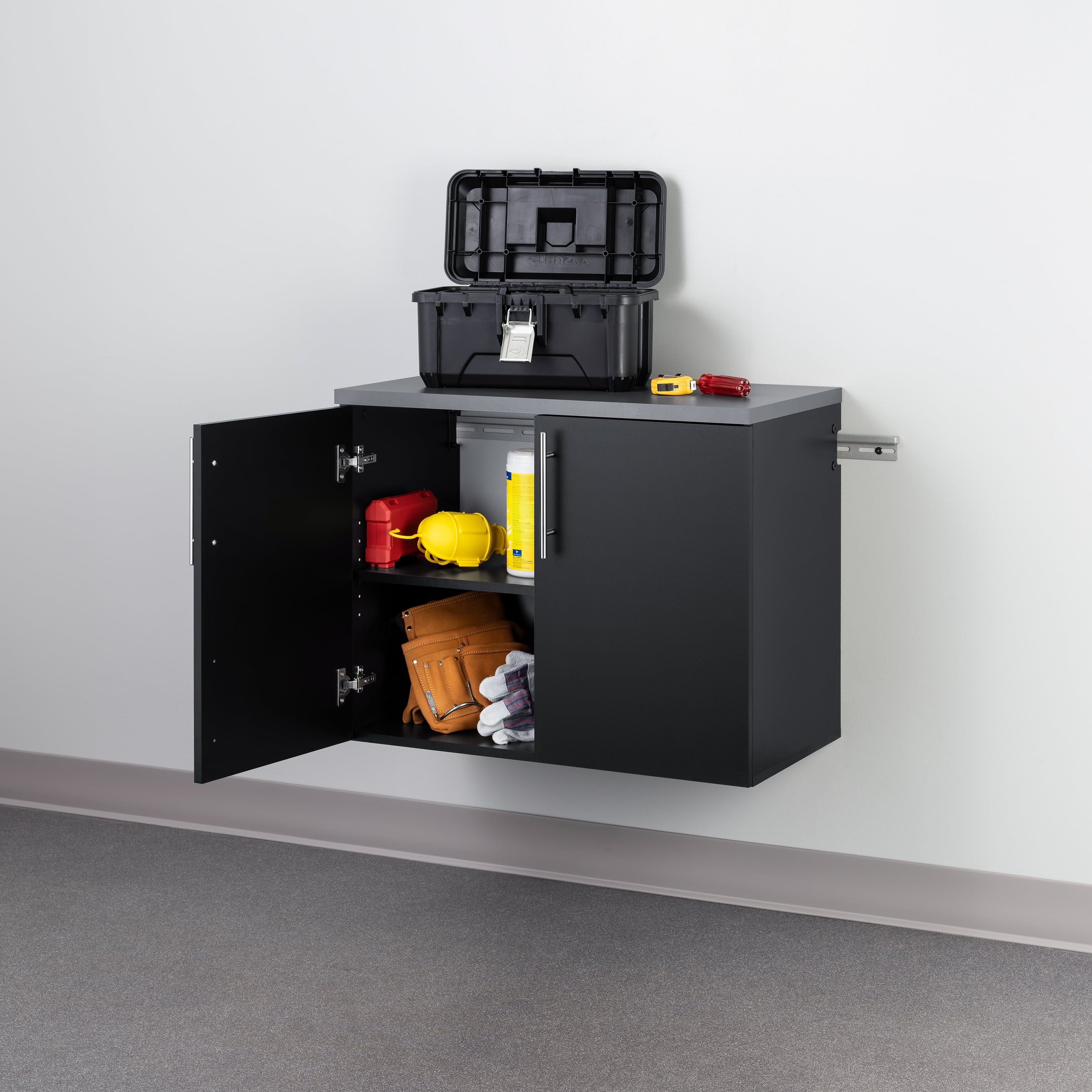 Turn any cluttered room into an organized space with the Prepac HangUps 2-Door Base Garage Storage Cabinet. Versatile and practical, this storage cabinet offers convenient storage for a variety of items such as gardening tools, cleaning supplies, outdoor toys, car products, and much more to maximize the space in your garage, laundry room, office, or workshop. It mounts securely to any wall with the heavy-duty metal rail and hook system, making it easy to clean beneath the cabinet while protecting your stored items from water and dirt. Constructed from non-toxic, CARB-2 compliant, laminated composite woods with satin nickel finished handles and adjustable hinges, this storage organizer provides long-lasting durability to withstand years of quality garage organization. It ships ready-to-assemble and includes all hanging rails and fastening bolts as well as an instruction booklet for easy assembly. This wall mount storage cabinet measures 30″ W x 24″ H x 16″ D and features 2 doors and 2 adjustable shelves, offering 5 cubic feet of versatile storage with a weight capacity of 120 pounds (40 pounds table top, 20 pounds per shelf).