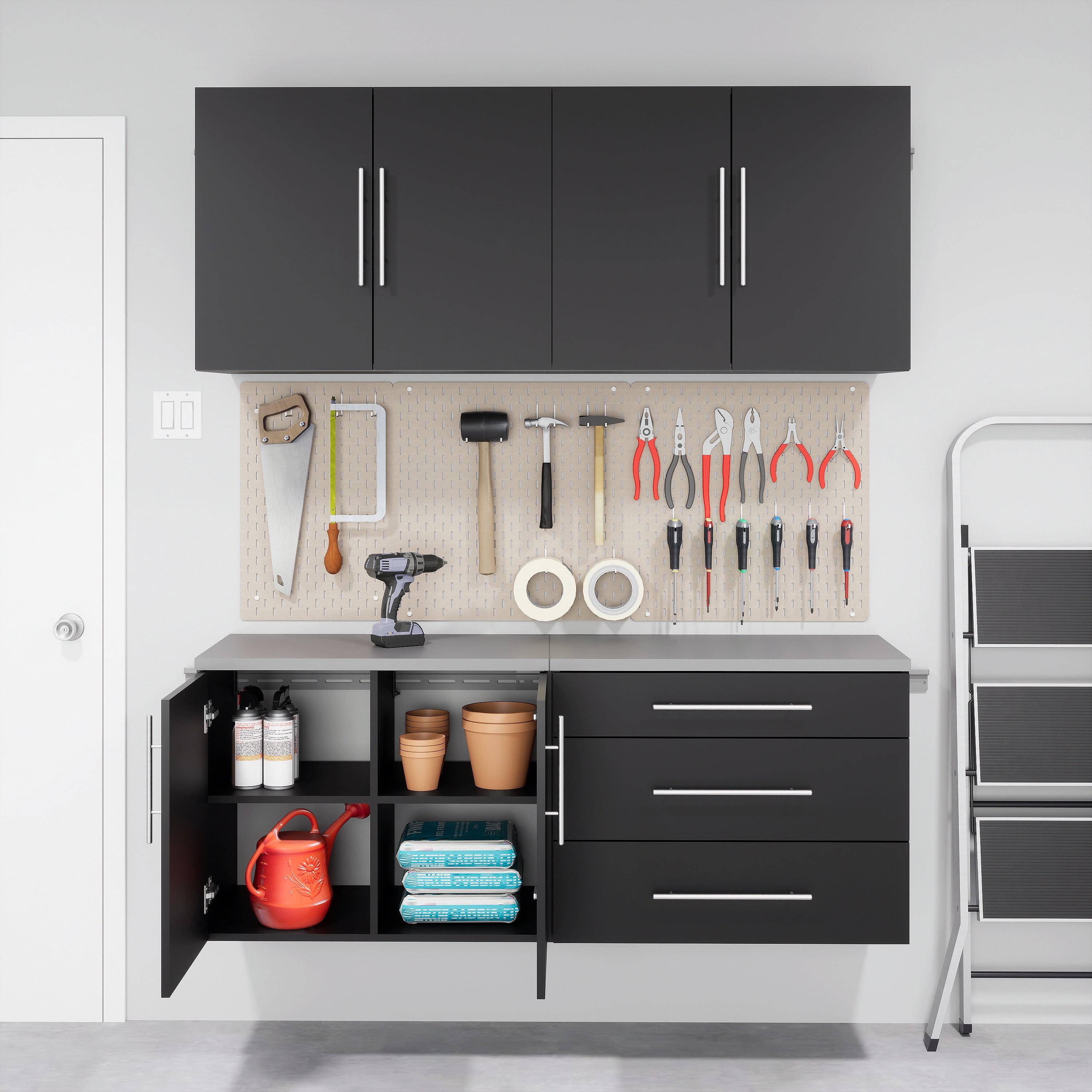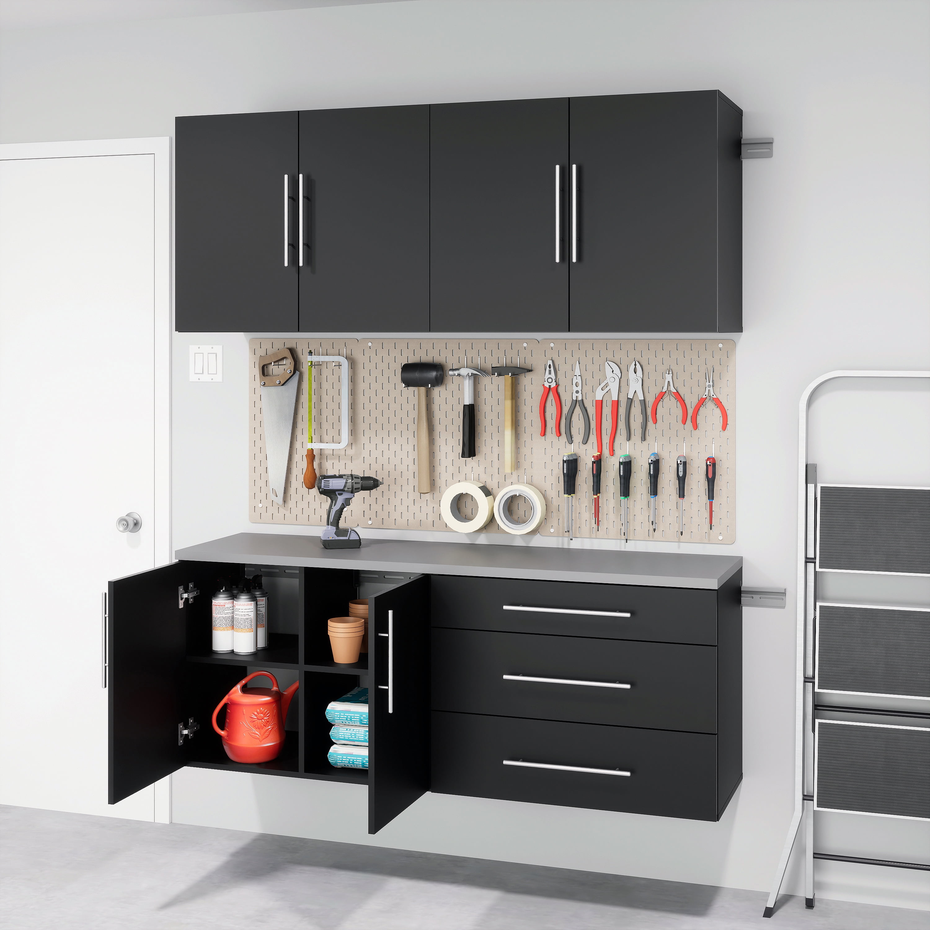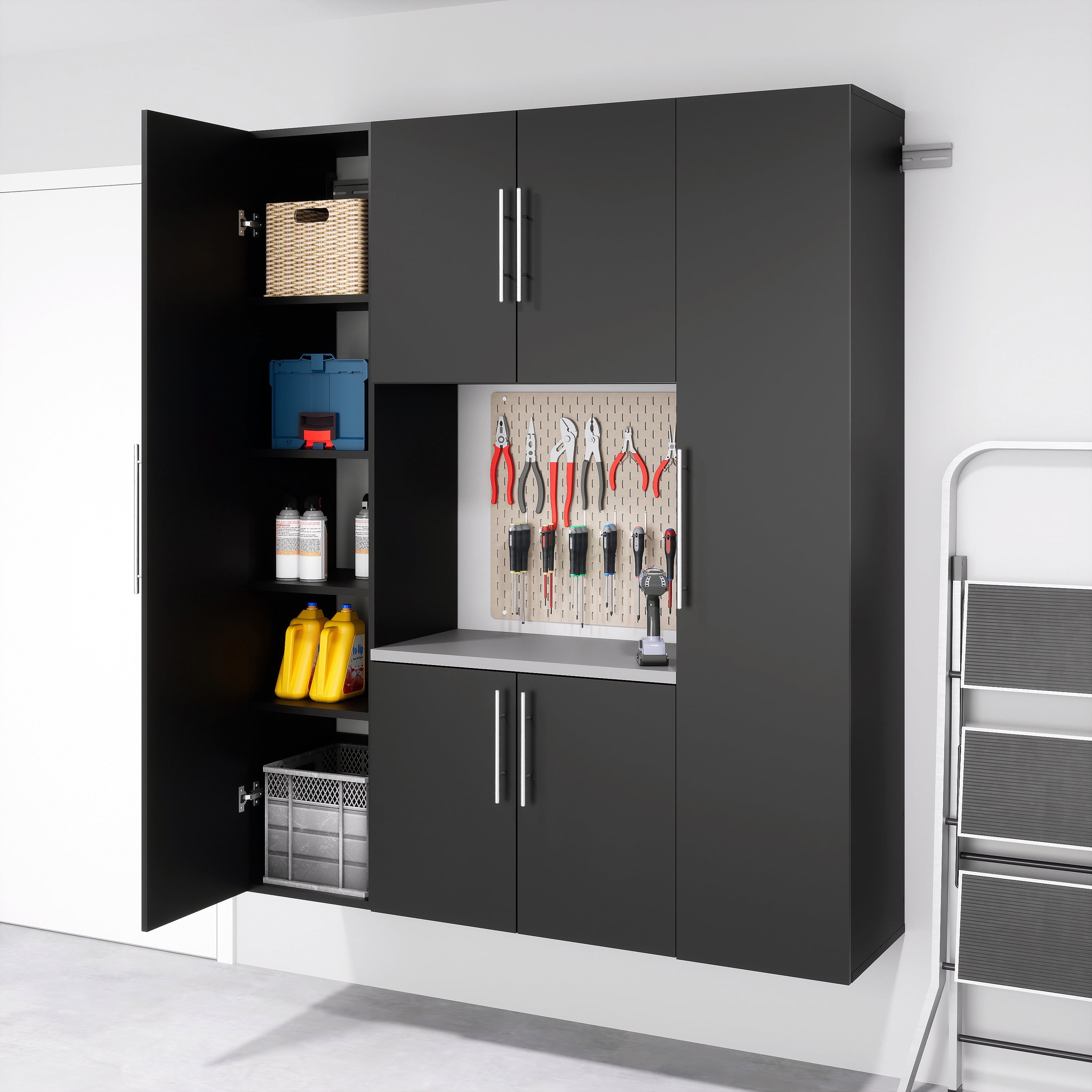 Turn any cluttered room into an organized space with the Prepac HangUps 2-Door Base Garage Storage Cabinet. Versatile and practical, this storage cabinet offers convenient storage for a variety of items such as gardening tools, cleaning supplies, outdoor toys, car products, and much more to maximize the space in your garage, laundry room, office, or workshop. It mounts securely to any wall with the heavy-duty metal rail and hook system, making it easy to clean beneath the cabinet while protecting your stored items from water and dirt. Constructed from non-toxic, CARB-2 compliant, laminated composite woods with satin nickel finished handles and adjustable hinges, this storage organizer provides long-lasting durability to withstand years of quality garage organization. It ships ready-to-assemble and includes all hanging rails and fastening bolts as well as an instruction booklet for easy assembly. This wall mount storage cabinet measures 30″ W x 24″ H x 16″ D and features 2 doors and 2 adjustable shelves, offering 5 cubic feet of versatile storage with a weight capacity of 120 pounds (40 pounds table top, 20 pounds per shelf).