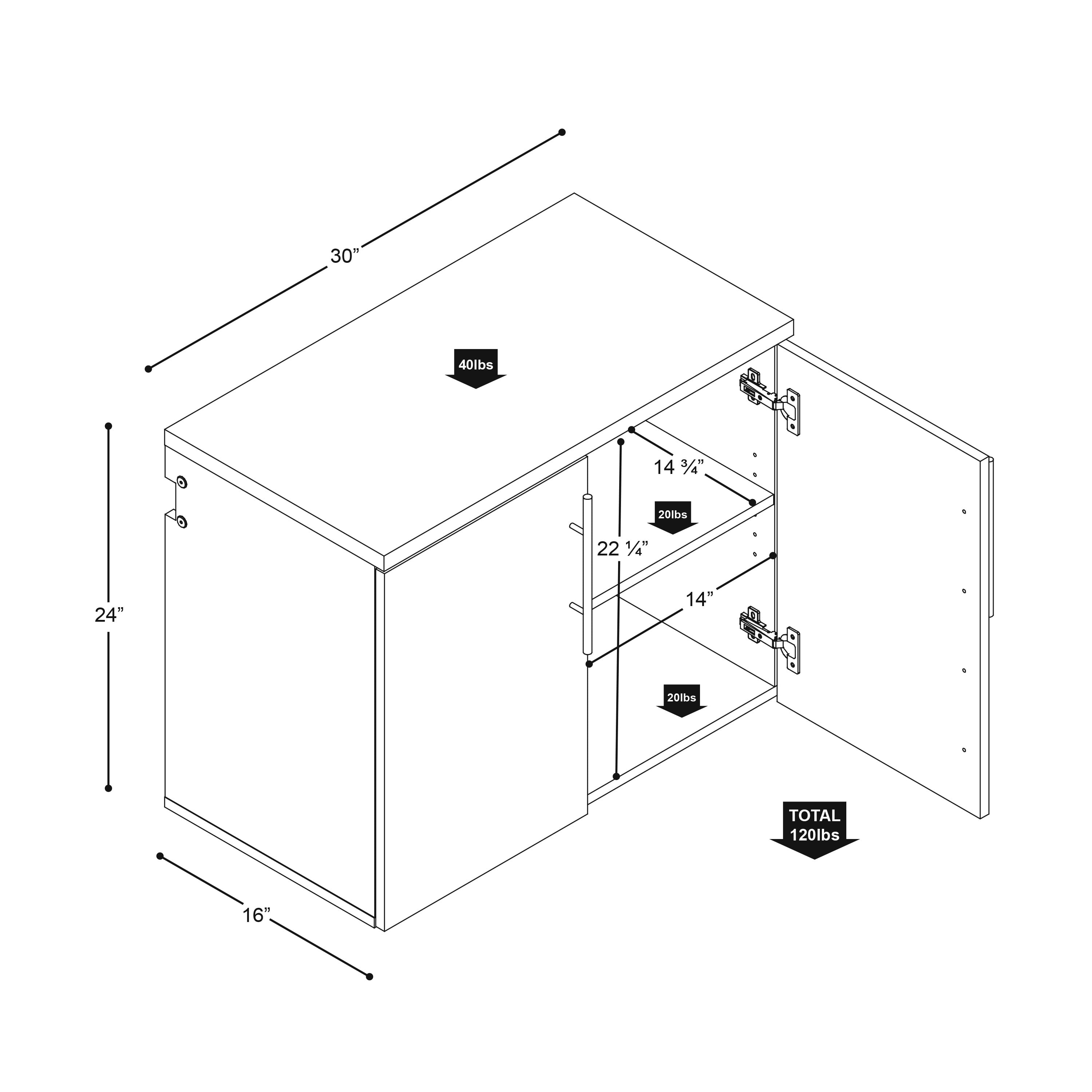 Versatile storage for garages, laundry rooms, offices, or workshops Features 2 doors and 2 adjustable shelves Satin nickel finished handles and adjustable hinges Mounts securely to the wall with the heavy-duty metal rail and hook system Wall mounted feature makes it easy to clean beneath the cabinet Protects stored items from water and dirt Ready-to-assemble with hanging rails, fastening bolts, and instruction booklet Constructed from non-toxic, CARB-2 compliant, laminated composite woods Measures 30″ W x 24″ H x 16″ D with 5 cu. ft. of storage space 120 lb. weight capacity (20 lbs. per table top, 40 lbs. per bottom shelf)