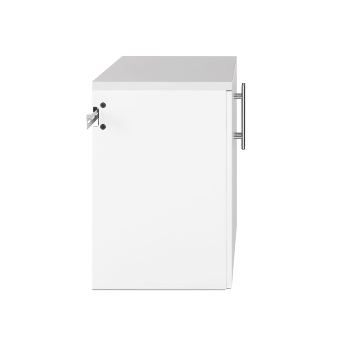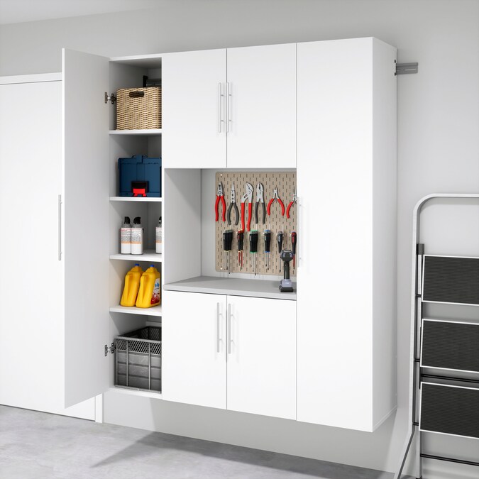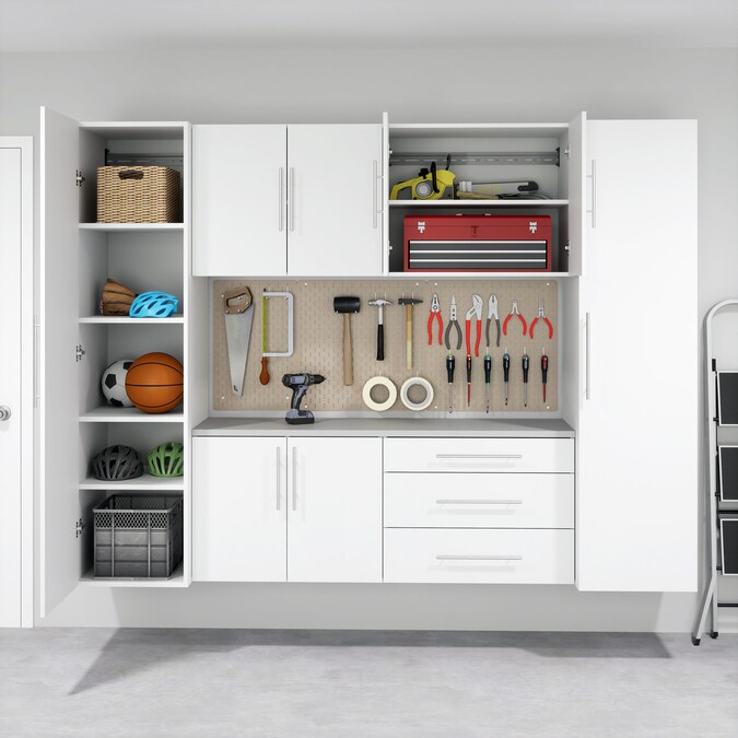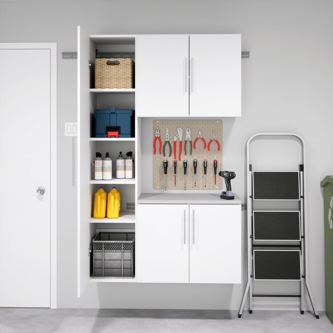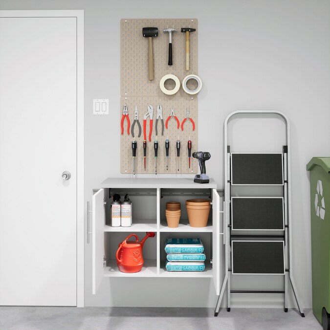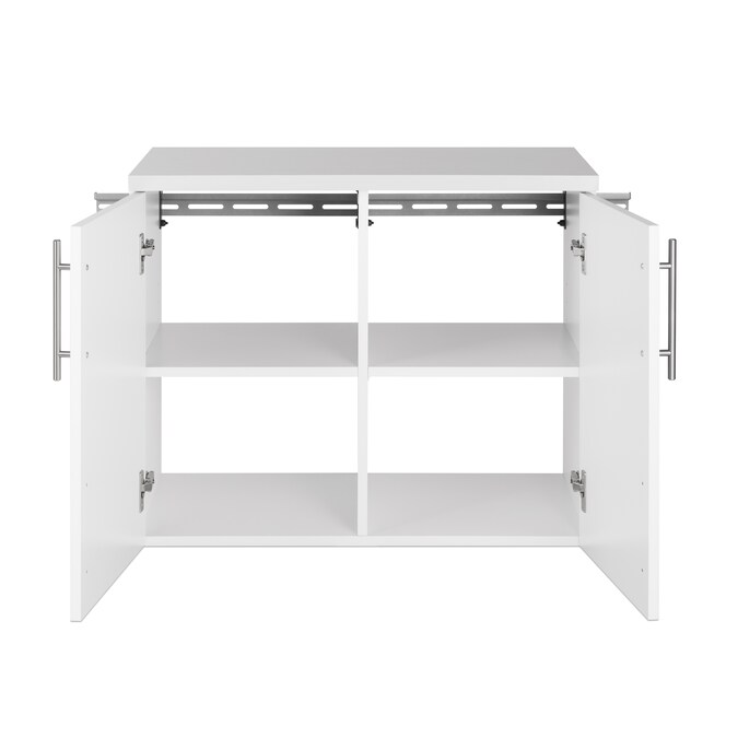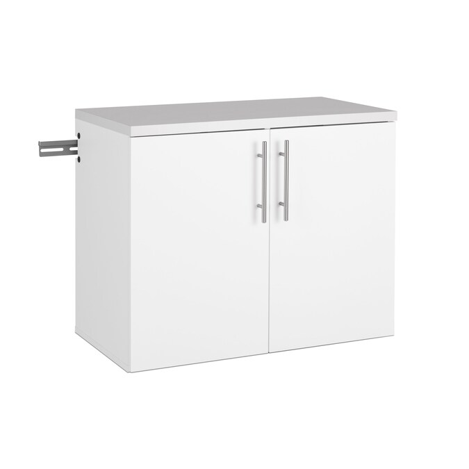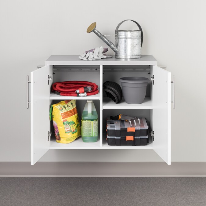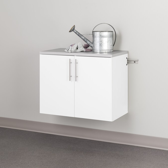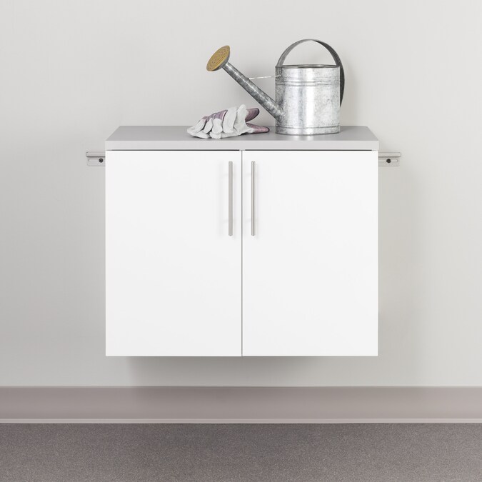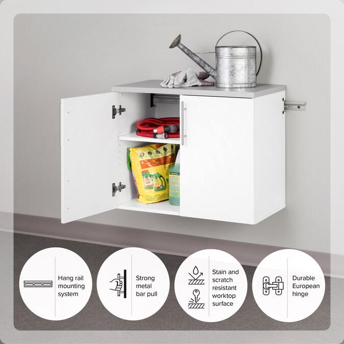 The HangUps 2-Door Base Storage Cabinet offers versatility for your ever changing storage needs in the garage, laundry room, office or workshop. This cabinet is constructed using laminated composite wood and features 2 doors and 2 adjustable shelves. The Base Cabinet mounts securely to the wall with a heavy duty metal rail and hook system. The wall mounted feature ensures easy cleaning beneath the cabinets and protects your stored items from water and dirt. This product ships ready-to-assemble and includes all hanging rails and fastening bolts. Add other cabinets from our HangUps Collection to create a storage system to convert any cluttered room into an organized space.