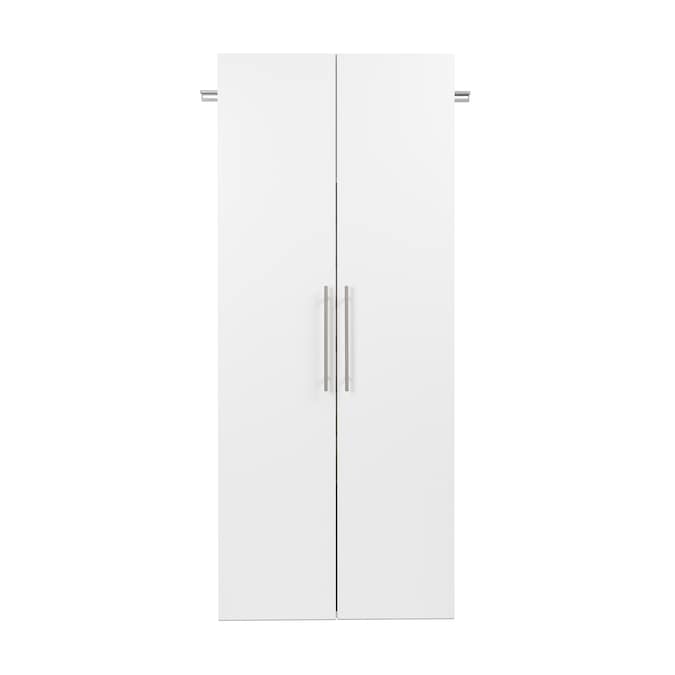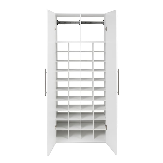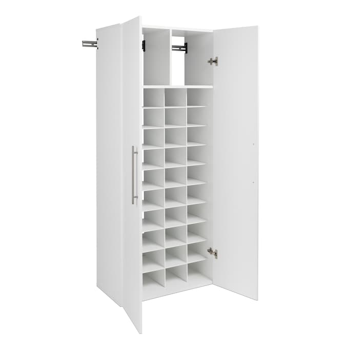 The HangUps 30 in shoe storage cabinet offers versatility for your ever changing storage needs in the garage, laundry room, office or workshop. This cabinet mounts securely to the wall with a heavy duty metal rail and hook system. The wall mounted feature ensures easy cleaning beneath the cabinets and protects your stored items from water and dirt. The shoe storage cabinet features 30 individual shoe cubes, with each chubby spacious enough to hold a pair of size 13 men’s shoes, keeping them neatly stored behind the two doors. Place larger items in the two shelves at the top of the cabinet. The HangUps collection is constructed using laminated composite wood and features metal handles and adjustable hinges. This product ships ready-to-assemble and includes all hanging rails and fastening bolts. Add other cabinets from our HangUps collection to create a storage system to convert any cluttered room into an organized space.