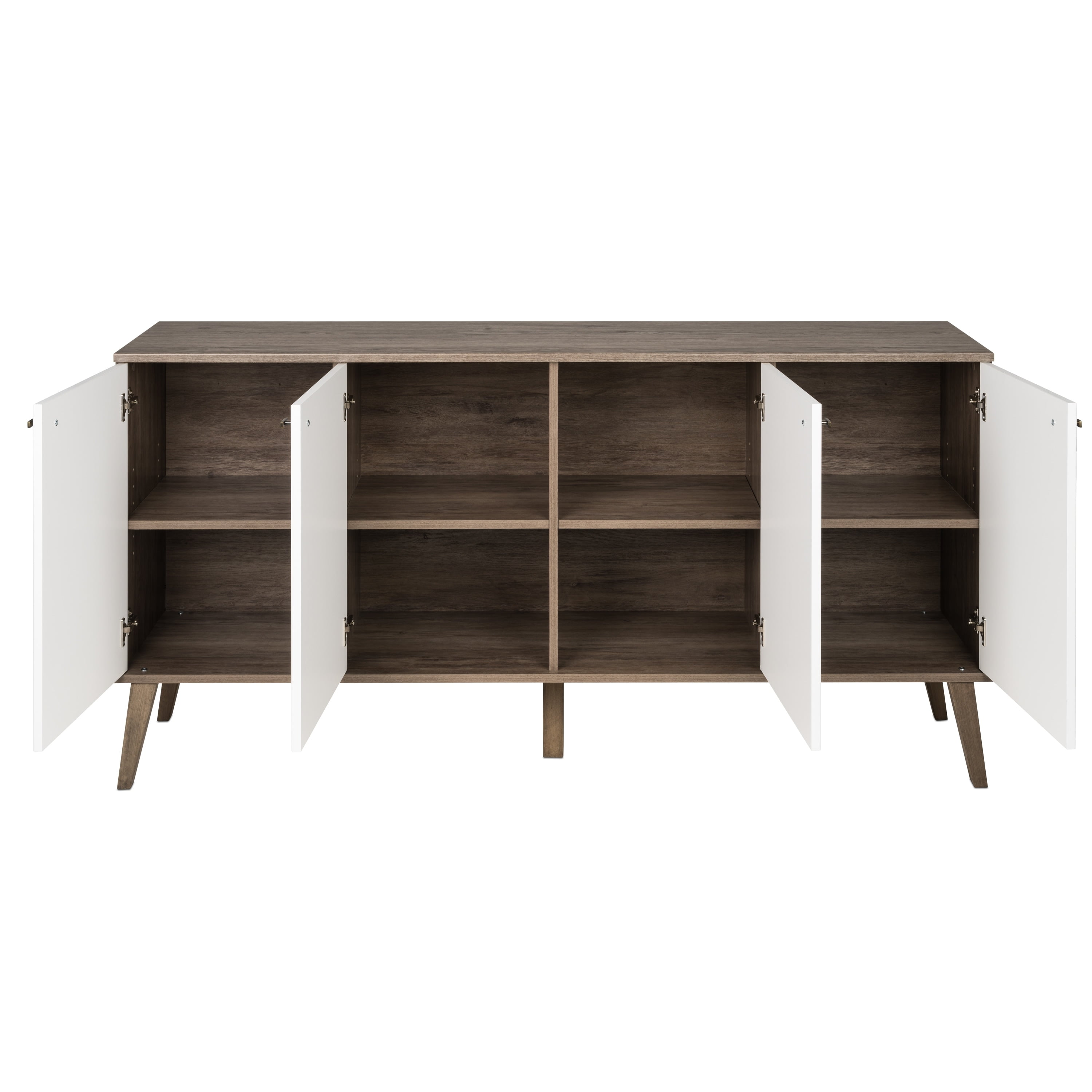 Prepac Milo Mid-Century Modern 4-Door Buffet, White: Tapered 8 in. high solid wood legs Brushed brass finished knobs 4 adjustable shelves 11.2564 cubic feet total Assembled Dimensions: 64 in. W x 32 in. H x 16 in. D Compartment Dimensions: 15 in. W x 22.75 in. H x 14.25 in. D Weight Capacity: 12lbs per shelf, top 50lbs; total weight 146lbs Constructed from non-toxic, CARB2 compliant, laminated composite woods Ships Ready to Assemble, includes an instruction booklet for easy assembly Manufactured in North America and meets all safety standards 5-year manufacturer’s limited parts warranty