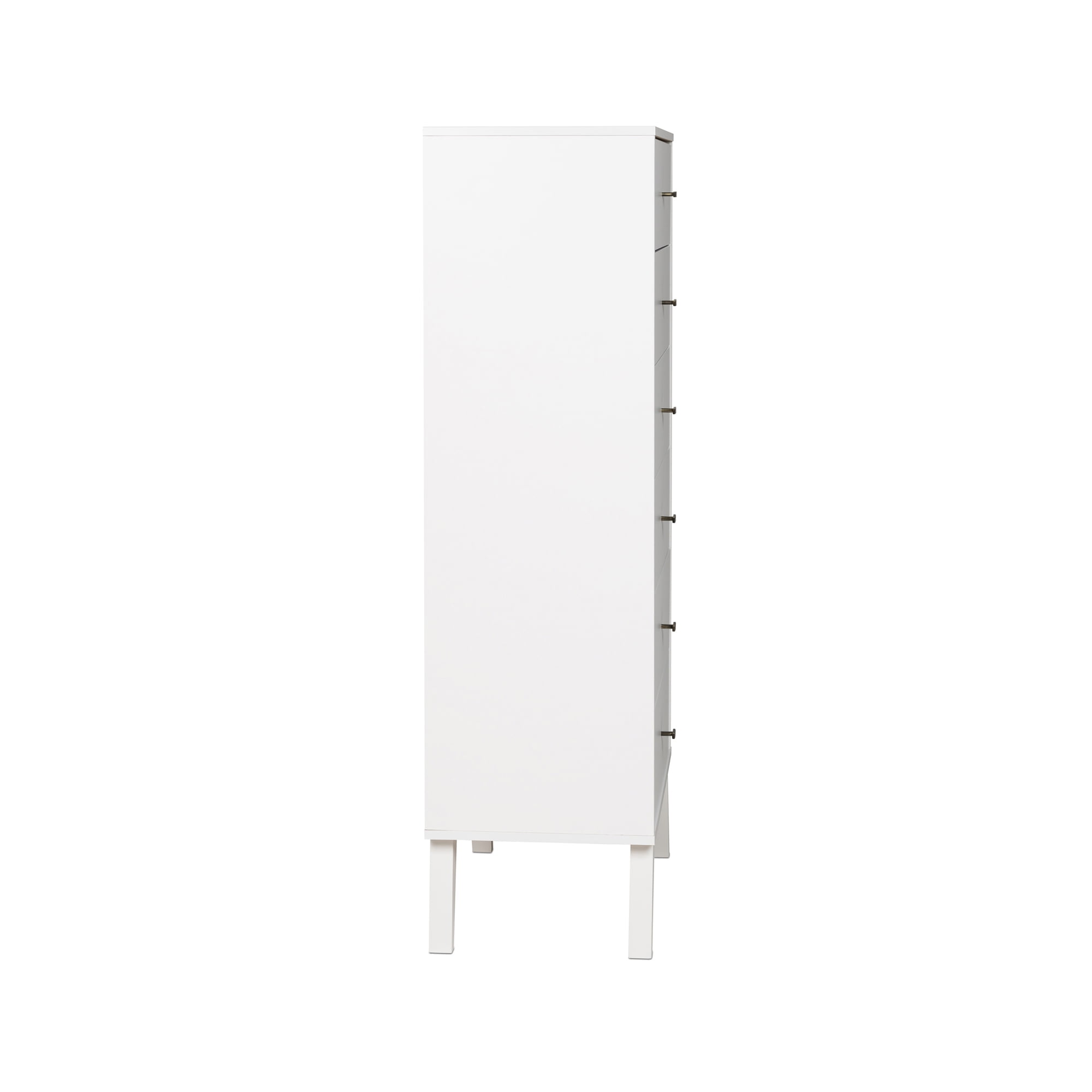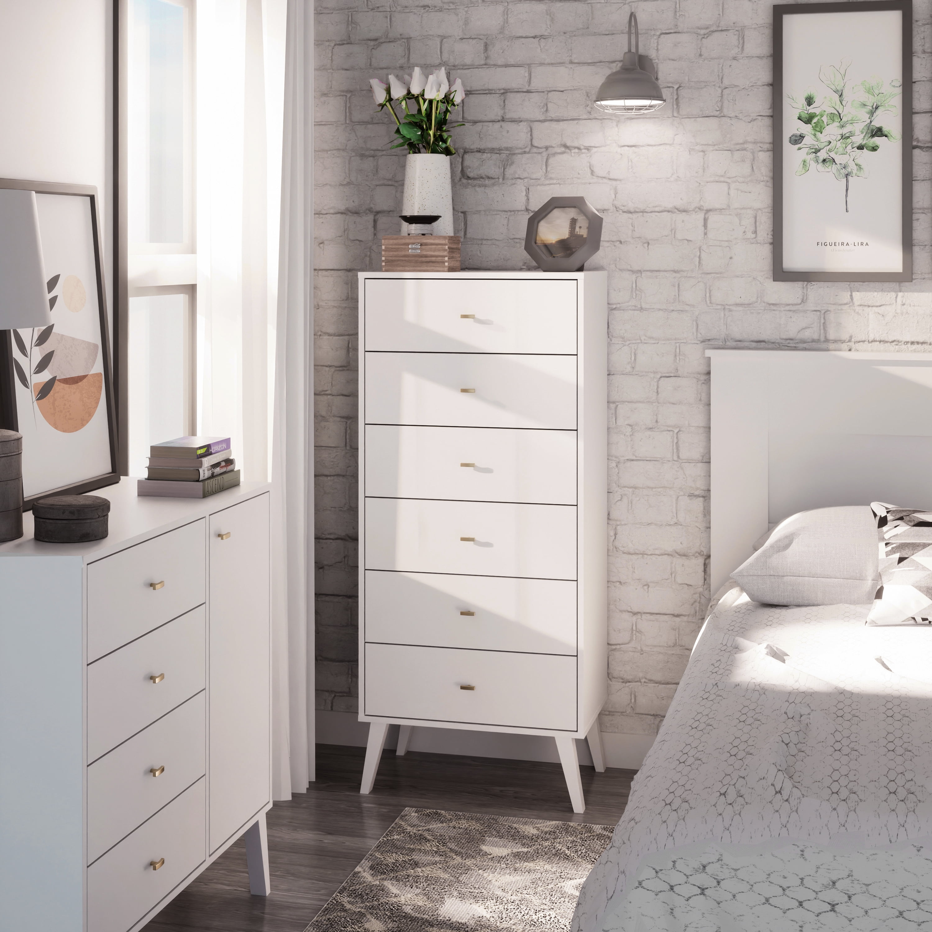 If you are looking to add a touch of vintage to your bedroom, the Prepac Milo Mid Century Modern Tall 6-drawer Chest offers a modern take on the retro look. Its narrow, space saving design provides maximum storage in the smallest footprint, making it a great fit for condos and smaller spaces. Six drawers run smoothly on metal glides, offering easy access to storage for clothing and bedroom items. The tapered solid wood legs and inset drawers deliver a clean and modern look to your bedroom. Brushed brass finished knobs add to the retro-chic design for a functional and fashionable dresser. Style this dresser on its own, or combine it with any of the products in the Milo collection for a timeless look.
