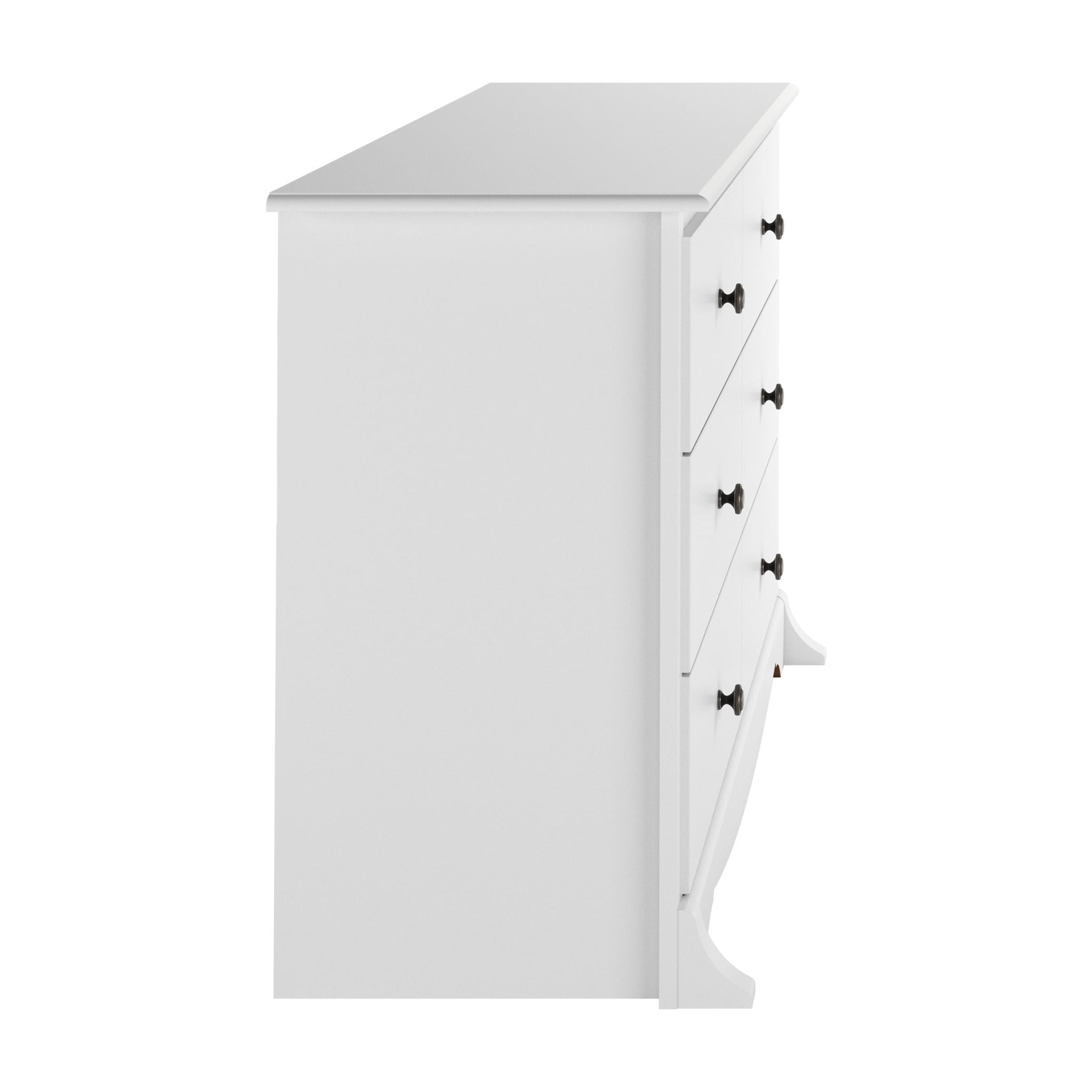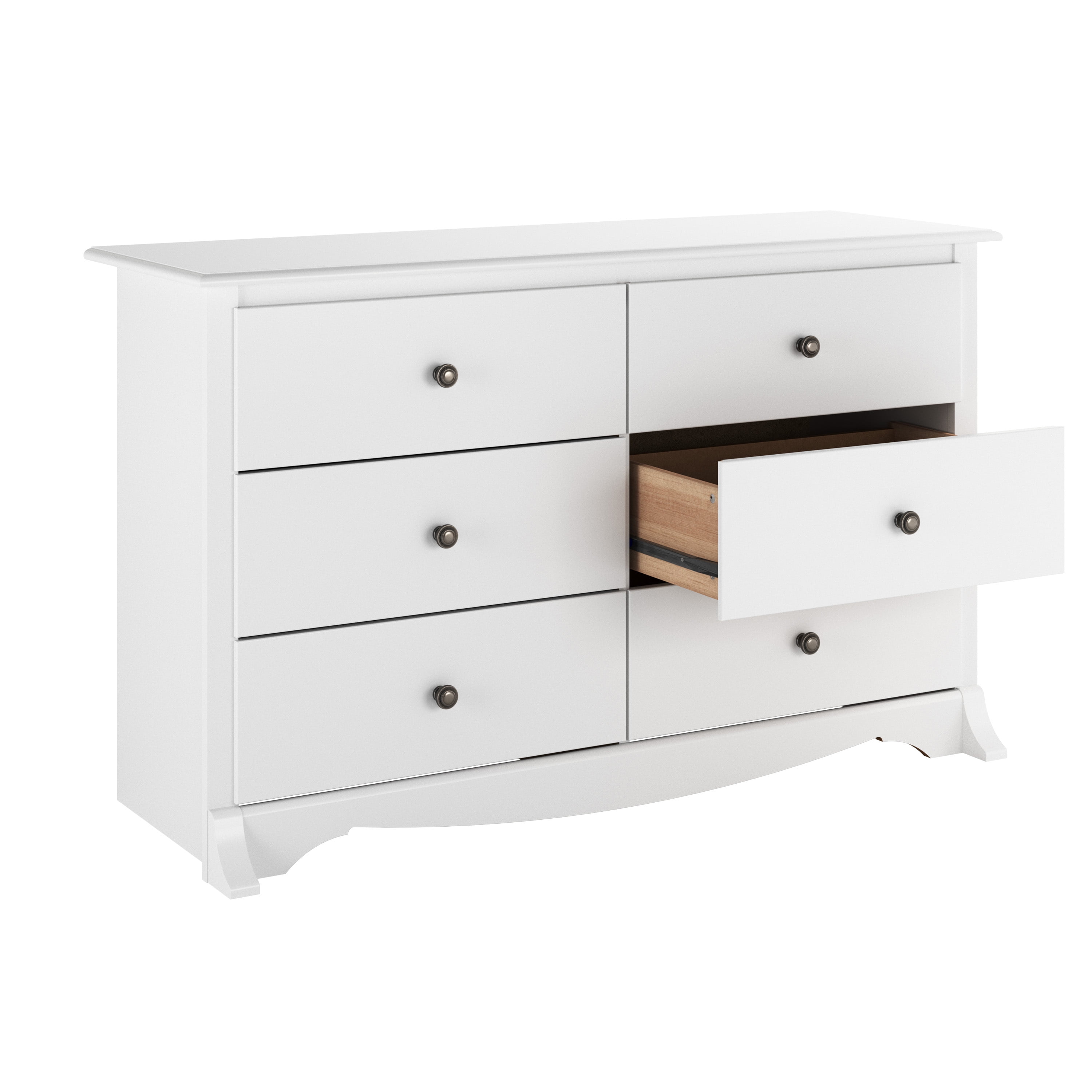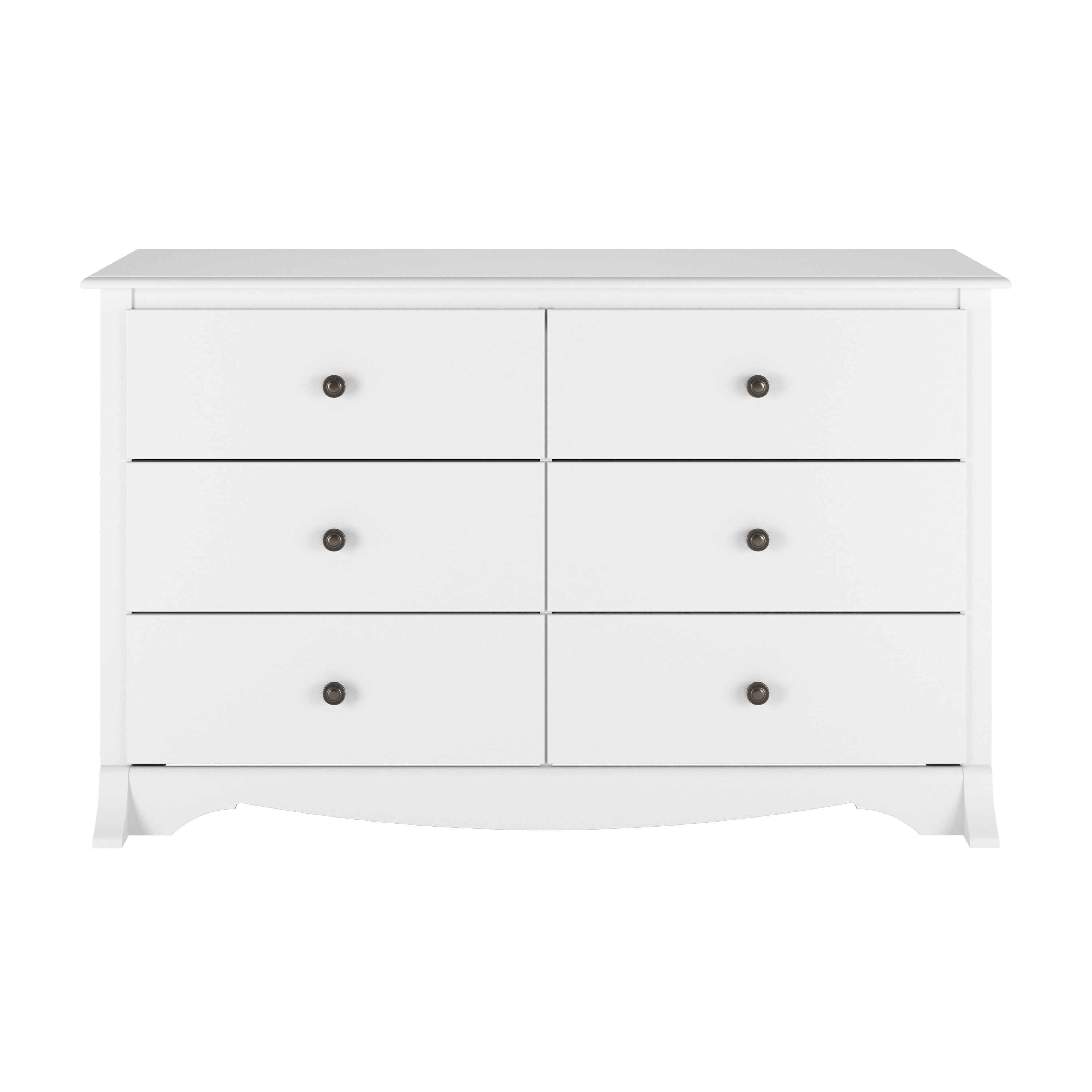 Add complete storage to the bedroom with the Prepac Monterey 6 Drawer Dresser. A profiled flat top, sleek side moldings, and scalloped apron kick plate lend to a charming and modern design with a white laminate finish that makes this a beautiful and classy dresser for any bedroom. Specifically designed to accommodate smaller rooms, this double-column dresser houses six spacious drawers for clothes, running on smooth roller glides with built-in safety stops and accented with dark pewter-finished metal knobs. This multi-drawer storage dresser is a space-saving clothes organizer for bedrooms, nurseries, playrooms, craft rooms, and more- perfect for the little one in your life! Utilize the flat profiled top as a display for precious picture frames, lamps, stuffed animals, and more. Thanks to a non-toxic laminated composite wood construction with a sturdy back panel, you can rest assured that this dresser of drawers is both safe and durable. This high-quality compact dresser ships flat packed and can be assembled in two hours or less. Measuring 48″ W x 29″ H x 17.5″ D with each deep drawer measuring 18.75″ W x 5″ H x 12.5″ D, this horizontal double drawer dresser is a must-have piece of bedroom furniture. Pair this all-purpose dresser with other items from the Monterey collection for a uniform bedroom set that accommodates any room.