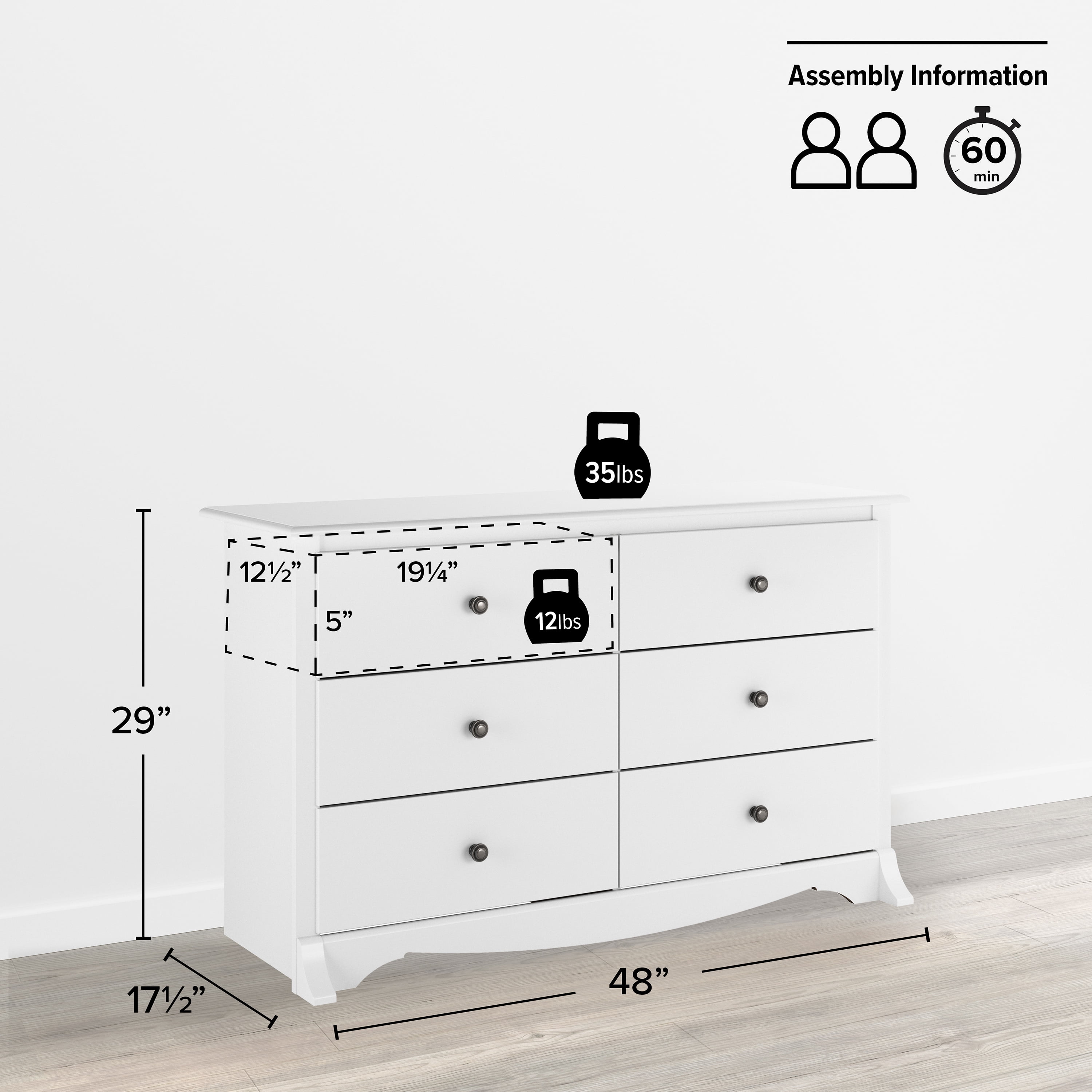 6 drawer dresser with profiled top, sleek side moldings, and scalloped apron kick plate Crisp white laminate finish with dark pewter-finished metal knobs Spacious smooth rolling drawers with built-in safety stops Space-saving clothes organizer for bedrooms, closets, living rooms, nurseries, or entryways Flat top can be used as a TV stand or to display lamps, pictures, and more Made from non-toxic, CARB-2 compliant laminated composite wood and sturdy back panel Easy to assemble in 2 hours or less Measurements: Dresser – 17.5″ x 48″ x 29″; Each drawer – 18.75″ x 5″ x 12.5″