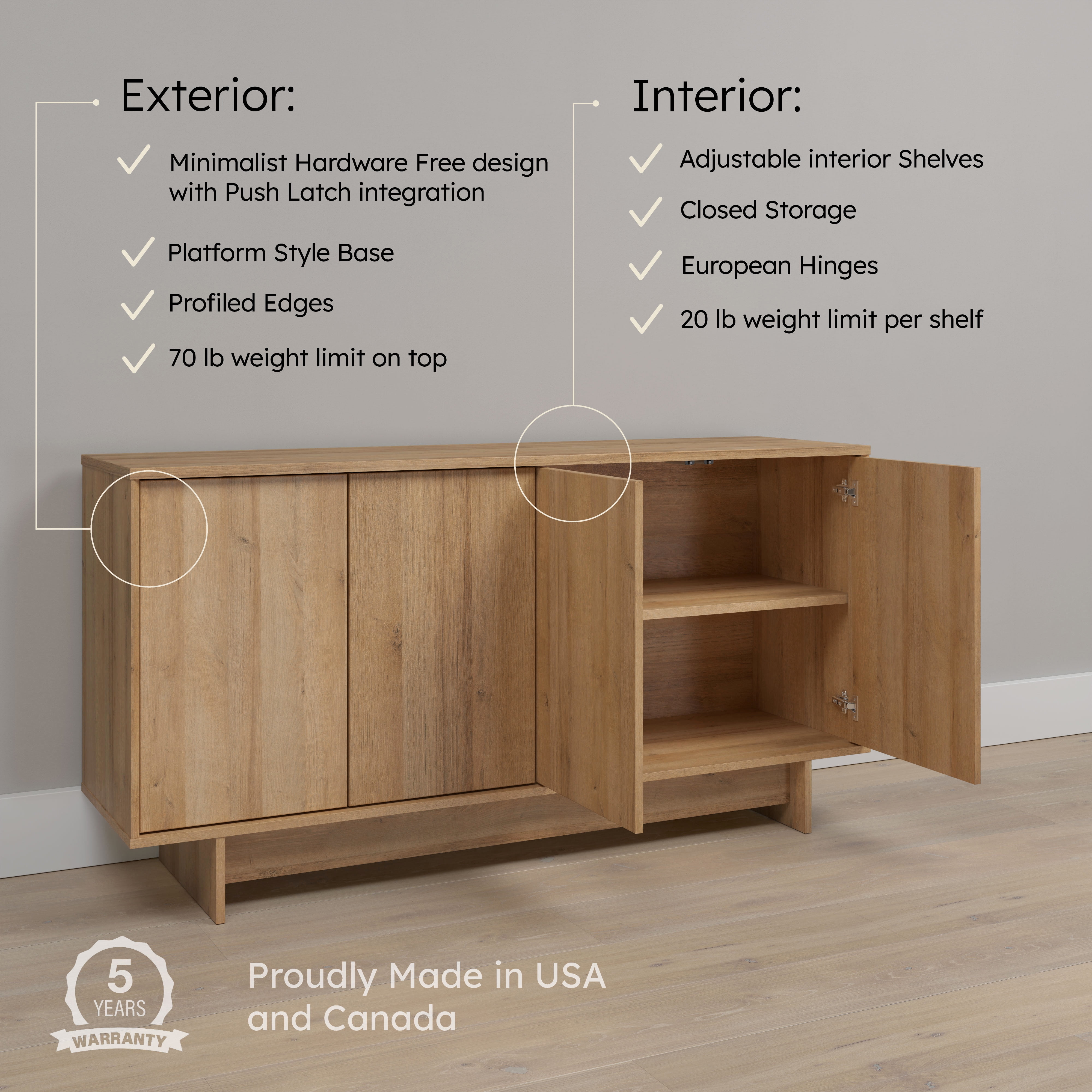 ASSEMBLED DIMENSIONS & WEIGHT: Finnley Natural Oak Sideboard 16″D x 61.5″W x 30.75″H, Total weight- 115.00 lbs., All pieces arrive ready to assemble in 1 Box. DESIGNED & MADE IN North America AND CANADA: Prepac furniture products are proudly made in North America for trusted quality & reliability and backed by our knowledgeable North America based customer support team. MULTI-ROOM USE FOR MAXIMUM FUNCTIONALITY: The Finnley Natural Oak Sideboard is a versatile sideboard cabinet designed for any space, effortlessly transitioning from an entryway cabinet to a stylish dining room buffet or a modern TV console, making it a perfect fit for Scandinavian furniture enthusiasts. CUSTOMIZABLE STORAGE OPTIONS: Featuring two adjustable shelves inside, this buffet cabinet with storage allows you to organize your belongings according to your needs, whether you’re storing media in the living room or dinnerware in the dining room, ensuring optimal use of your space. SEAMLESS DOOR FUNCTIONALITY: Equipped with 6-way adjustable Euro hinges, the Finnley Sideboard provides smooth, flexible door alignment for easy access to your items, enhancing the overall user experience while maintaining the sleek look of your sideboard cabinet. SLEEK HARDWARE-LESS DESIGN: The clean and modern aesthetic of this sideboard buffet cabinet is complemented by a hardware-less closure system using a push latch, offering both style and practicality while keeping your essentials discreetly stored away. DURABLE MATERIAL FOR LONG TERM USE: The Finnley Natural Oak sideboard is constructed from non-toxic (CARB 2 Compliant), laminated composite woods with a sturdy medium-density fiberboard backer for added strength- this natural oak console is easy to clean and environmentally friendly. FAST CUSTOMER SERVICE: We’re here to help with quick responses and solutions to ensure a hassle-free shopping experience. EASY TO ASSEMBLE: Natural oak sideboard includes detailed, step-by-step instructions & all necessary parts- the versatile side board typically be assembled in 60 minutes or less with basic hand tools by 2 person.